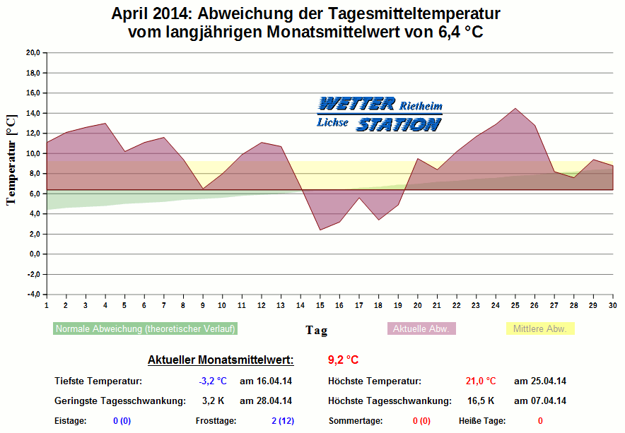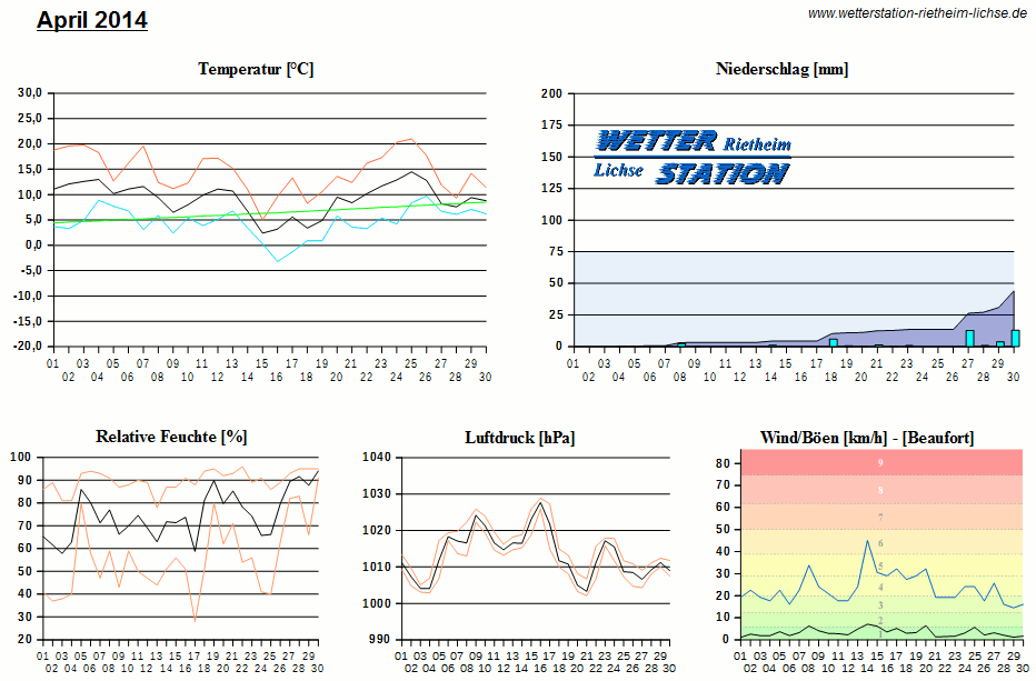 *************************************************** ************** T E M P E R A T U R ************** *************************************************** Mittlere Temperatur: 9,2 °C MIN Temperatur: -3,2 °C am 16.04.14 MAX Temperatur: 21,0 °C am 25.04.14 Mittlere MIN Temperatur: 4,5 °C Mittlere MAX Temperatur: 14,4 °C MIN Temp Delta : 3,2 K am 28.04.14 MAX Temp Delta : 16,5 K am 07.04.14 Mittl. Temp Delta: 9,9 K Starkfrosttage : 0 Eistage : 0 Frosttage : 2 Sommertage : 0 Heiße Tage : 0 *************************************************** ************ N I E D E R S C H L A G ************ *************************************************** Ges. Niederschlagsmenge: 44,0 mm MAX Niederschlag/Stunde: 9,2 mm am 27.04.14 MAX Niederschlag/Tag: 13,0 mm am 30.04.14 MAX Niederschlag in 24h: 16,6 mm am 30.04.14 MAX Niederschlag Rate: 60,6 mm/h am 27.04.14 Niederschlag an 16 Tagen Regentage (> 1mm) : 6 Regentage (> 3mm) : 4 Regentage (> 10mm) : 2 Regentage (> 20mm) : 0 *************************************************** ******************** W I N D ******************** *************************************************** Mittlere Windgeschwindigkeit: 0,9 m/s = 3,3 km/h Effektive Windrichtung: NNO Maximale Windgeschwindigkeit: 12,5 m/s = 45,1 km/h aus NNW am 14.04.14 Prozentuale Verteilung Windgeschwindigkeit: Bft_0 (bis 0,9 km/h) : 32.35 % Bft_1 (bis 5,6 km/h) : 44.81 % Bft_2 (bis 12 km/h) : 21.17 % Bft_3 (bis 20 km/h) : 1.67 % Prozentuale Verteilung Windrichtung: N : 9.9 % NNO : 4.0 % NO : 3.5 % ONO : 1.9 % O : 4.4 % OSO : 20.0 % SO : 8.4 % SSO : 0.5 % S : 2.4 % SSW : 3.5 % SW : 2.0 % WSW : 5.9 % W : 3.7 % WNW : 2.9 % NW : 8.8 % NNW : 18.4 % *************************************************** *************** L U F T D R U C K *************** *************************************************** Mittlerer Luftdruck: 1013,4 hPa MIN Luftdruck: 1002,1 hPa am 21.04.14 MAX Luftdruck: 1028,9 hPa am 16.04.14 *************************************************** ************ L U F T F E U C H T E ************** *************************************************** Mittlere rel. Luftfeuchte: 74,8 % MIN rel. Luftfeuchte: 28,0 % am 17.04.14 MAX rel. Luftfeuchte: 96,0 %