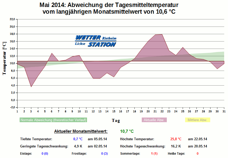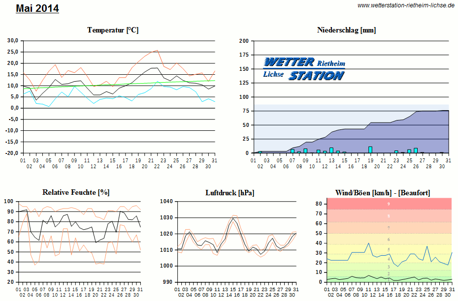 *************************************************** ************** T E M P E R A T U R ************** *************************************************** Mittlere Temperatur: 10,7 °C MIN Temperatur: 0,7 °C am 05.05.14 MAX Temperatur: 25,8 °C am 22.05.14 Mittlere MIN Temperatur: 5,8 °C Mittlere MAX Temperatur: 15,9 °C MIN Temp Delta : 4,9 K am 02.05.14 MAX Temp Delta : 16,2 K am 20.05.14 Mittl. Temp Delta: 10,0 K Starkfrosttage : 0 Eistage : 0 Frosttage : 0 Sommertage : 1 Heiße Tage : 0 *************************************************** ************ N I E D E R S C H L A G ************ *************************************************** Ges. Niederschlagsmenge: 76,0 mm MAX Niederschlag/Stunde: 10,8 mm am 19.05.14 MAX Niederschlag/Tag: 11,4 mm am 19.05.14 MAX Niederschlag in 24h: 14,6 mm am 26.05.14 MAX Niederschlag Rate: 55,6 mm/h am 19.05.14 Niederschlag an 18 Tagen Regentage (> 1mm) : 13 Regentage (> 3mm) : 10 Regentage (> 10mm) : 1 Regentage (> 20mm) : 0 *************************************************** ******************** W I N D ******************** *************************************************** Mittlere Windgeschwindigkeit: 1,0 m/s = 3,7 km/h Effektive Windrichtung: NW Maximale Windgeschwindigkeit: 11,2 m/s = 40,2 km/h aus WNW am 11.05.14 Prozentuale Verteilung Windgeschwindigkeit: Bft_0 (bis 0,9 km/h) : 25.31 % Bft_1 (bis 5,6 km/h) : 47.40 % Bft_2 (bis 12 km/h) : 25.77 % Bft_3 (bis 20 km/h) : 1.51 % Prozentuale Verteilung Windrichtung: N : 8.9 % NNO : 5.3 % NO : 7.5 % ONO : 1.6 % O : 1.8 % OSO : 10.6 % SO : 5.8 % SSO : 0.5 % S : 4.9 % SSW : 8.8 % SW : 6.4 % WSW : 11.1 % W : 5.0 % WNW : 2.1 % NW : 5.3 % NNW : 14.2 % *************************************************** *************** L U F T D R U C K *************** *************************************************** Mittlerer Luftdruck: 1015,2 hPa MIN Luftdruck: 1005,6 hPa am 22.05.14 MAX Luftdruck: 1031,5 hPa am 15.05.14 *************************************************** ************ L U F T F E U C H T E ************** *************************************************** Mittlere rel. Luftfeuchte: 77,6 % MIN rel. Luftfeuchte: 37,0 % am 05.05.14 MAX rel. Luftfeuchte: 98,0 %