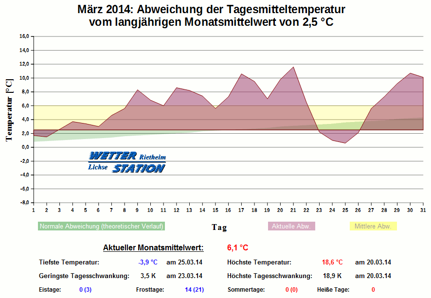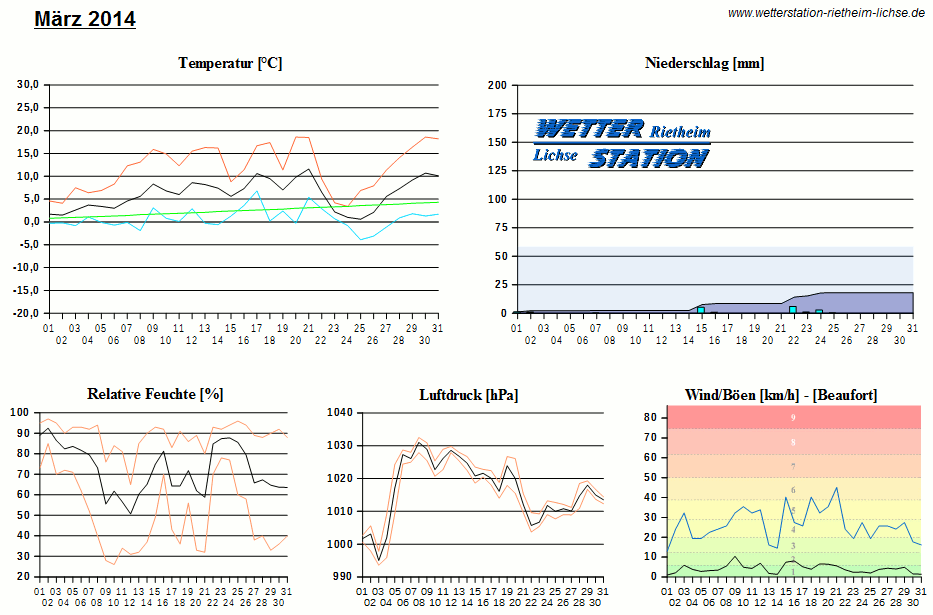 *************************************************** ************** T E M P E R A T U R ************** *************************************************** Mittlere Temperatur: 6,1 °C MIN Temperatur: -3,9 °C am 25.03.14 MAX Temperatur: 18,6 °C am 20.03.14 Mittlere MIN Temperatur: 0,7 °C Mittlere MAX Temperatur: 11,9 °C MIN Temp Delta : 3,5 K am 23.03.14 MAX Temp Delta : 18,9 K am 20.03.14 Mittl. Temp Delta: 11,1 K Starkfrosttage : 0 Eistage : 0 Frosttage : 14 Sommertage : 0 Heiße Tage : 0 *************************************************** ************ N I E D E R S C H L A G ************ *************************************************** Ges. Niederschlagsmenge: 18,0 mm MAX Niederschlag/Stunde: 1,4 mm am 22.03.14 MAX Niederschlag/Tag: 5,8 mm am 22.03.14 MAX Niederschlag in 24h: 6,2 mm am 23.03.14 MAX Niederschlag Rate: 9,2 mm/h am 15.03.14 Niederschlag an 8 Tagen Regentage (> 1mm) : 4 Regentage (> 3mm) : 2 Regentage (> 10mm) : 0 Regentage (> 20mm) : 0 *************************************************** ******************** W I N D ******************** *************************************************** Mittlere Windgeschwindigkeit: 1,2 m/s = 4,2 km/h Effektive Windrichtung: SO Maximale Windgeschwindigkeit: 12,5 m/s = 45,1 km/h aus S am 21.03.14 Prozentuale Verteilung Windgeschwindigkeit: Bft_0 (bis 0,9 km/h) : 31.02 % Bft_1 (bis 5,6 km/h) : 35.27 % Bft_2 (bis 12 km/h) : 28.21 % Bft_3 (bis 20 km/h) : 5.19 % Bft_4 (bis 29 km/h) : 0.30 % Prozentuale Verteilung Windrichtung: N : 5.3 % NNO : 1.3 % NO : 3.2 % ONO : 1.9 % O : 5.5 % OSO : 24.8 % SO : 13.8 % SSO : 0.5 % S : 2.1 % SSW : 5.5 % SW : 6.8 % WSW : 11.7 % W : 4.6 % WNW : 2.2 % NW : 3.6 % NNW : 7.2 % *************************************************** *************** L U F T D R U C K *************** *************************************************** Mittlerer Luftdruck: 1016,5 hPa MIN Luftdruck: 993,6 hPa am 03.03.14 MAX Luftdruck: 1032,5 hPa am 08.03.14 *************************************************** ************ L U F T F E U C H T E ************** *************************************************** Mittlere rel. Luftfeuchte: 72,4 % MIN rel. Luftfeuchte: 26,0 % am 10.03.14 MAX rel. Luftfeuchte: 97,0 %