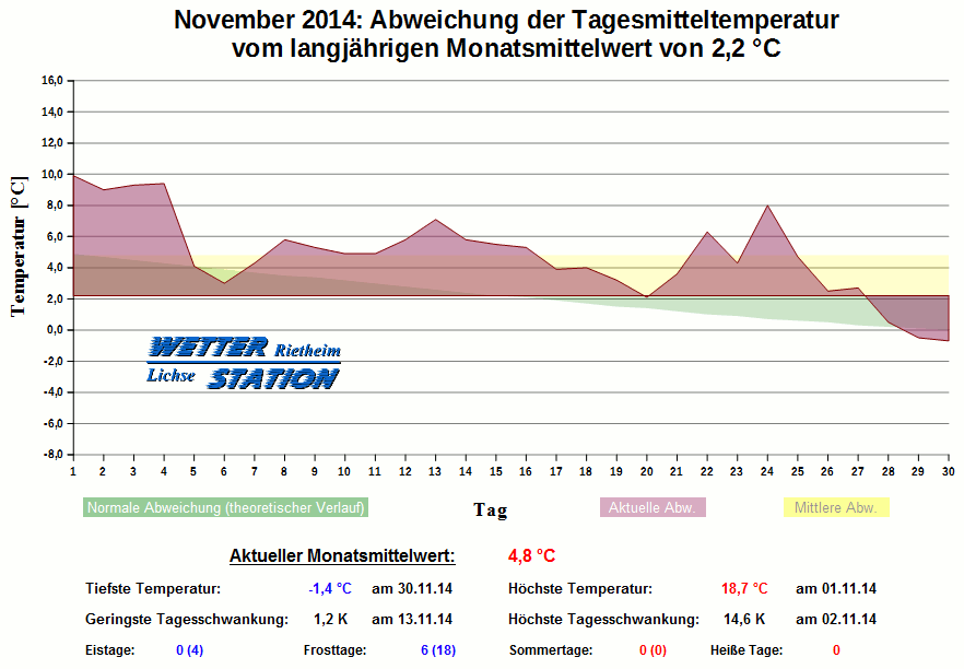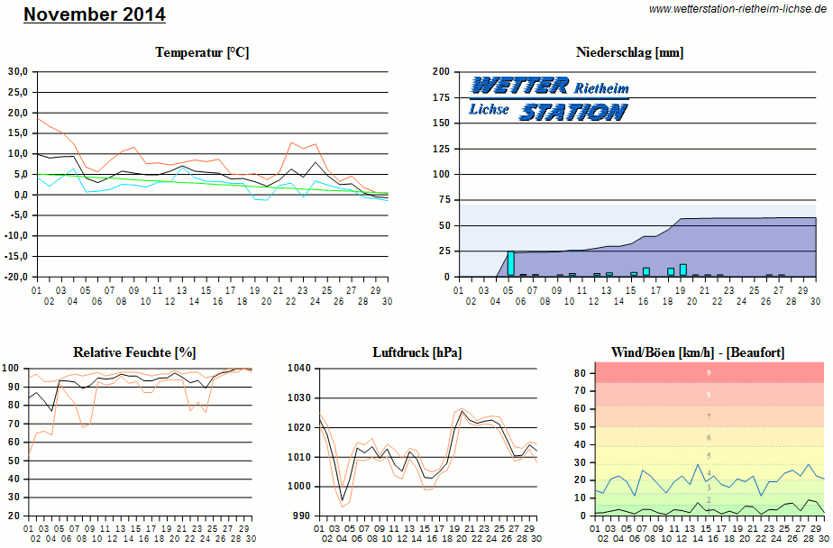 *************************************************** ************** T E M P E R A T U R ************** *************************************************** Mittlere Temperatur: 4,8 °C MIN Temperatur: -1,4 °C am 30.11.14 MAX Temperatur: 18,7 °C am 01.11.14 Mittlere MIN Temperatur: 2,1 °C Mittlere MAX Temperatur: 8,0 °C MIN Temp Delta : 1,2 K am 13.11.14 MAX Temp Delta : 14,6 K am 02.11.14 Mittl. Temp Delta: 5,9 K Starkfrosttage : 0 Eistage : 0 Frosttage : 6 Sommertage : 0 Heiße Tage : 0 *************************************************** ************ N I E D E R S C H L A G ************ *************************************************** Ges. Niederschlagsmenge: 57,8 mm MAX Niederschlag/Stunde: 3,2 mm am 16.11.14 MAX Niederschlag/Tag: 23,2 mm am 05.11.14 MAX Niederschlag in 24h: 23,8 mm am 06.11.14 MAX Niederschlag Rate: 9,0 mm/h am 18.11.14 Niederschlag an 13 Tagen Regentage (> 1mm) : 8 Regentage (> 3mm) : 4 Regentage (> 10mm) : 2 Regentage (> 20mm) : 1 *************************************************** ******************** W I N D ******************** *************************************************** Mittlere Windgeschwindigkeit: 1,0 m/s = 3,6 km/h Effektive Windrichtung: SO Maximale Windgeschwindigkeit: 8,1 m/s = 29,0 km/h aus SO am 14.11.14 Prozentuale Verteilung Windgeschwindigkeit: Bft_0 (bis 0,9 km/h) : 31.50 % Bft_1 (bis 5,6 km/h) : 42.33 % Bft_2 (bis 12 km/h) : 23.47 % Bft_3 (bis 20 km/h) : 2.69 % Bft_4 (bis 29 km/h) : 0.01 % Prozentuale Verteilung Windrichtung: N : 5.0 % NNO : 1.4 % NO : 0.3 % ONO : 0.1 % O : 3.8 % OSO : 15.5 % SO : 41.0 % SSO : 1.1 % S : 8.2 % SSW : 12.8 % SW : 1.8 % WSW : 1.0 % W : 0.5 % WNW : 0.5 % NW : 1.1 % NNW : 5.8 % *************************************************** *************** L U F T D R U C K *************** *************************************************** Mittlerer Luftdruck: 1012,6 hPa MIN Luftdruck: 993,0 hPa am 04.11.14 MAX Luftdruck: 1026,5 hPa am 20.11.14 *************************************************** ************ L U F T F E U C H T E ************** *************************************************** Mittlere rel. Luftfeuchte: 93,3 % MIN rel. Luftfeuchte: 53,0 % am 01.11.14 MAX rel. Luftfeuchte: 100,0 %