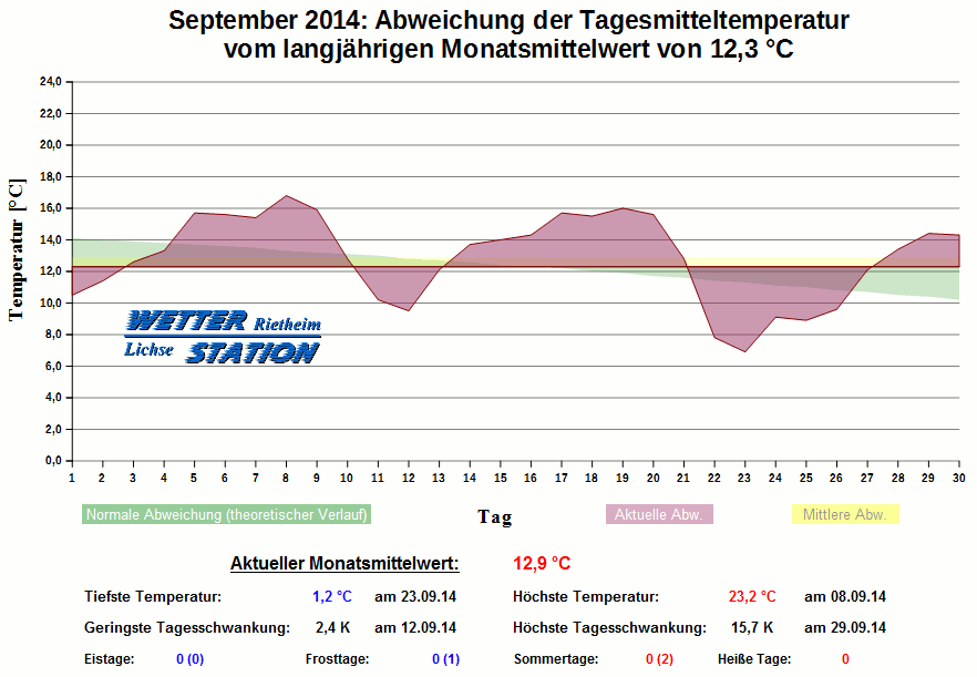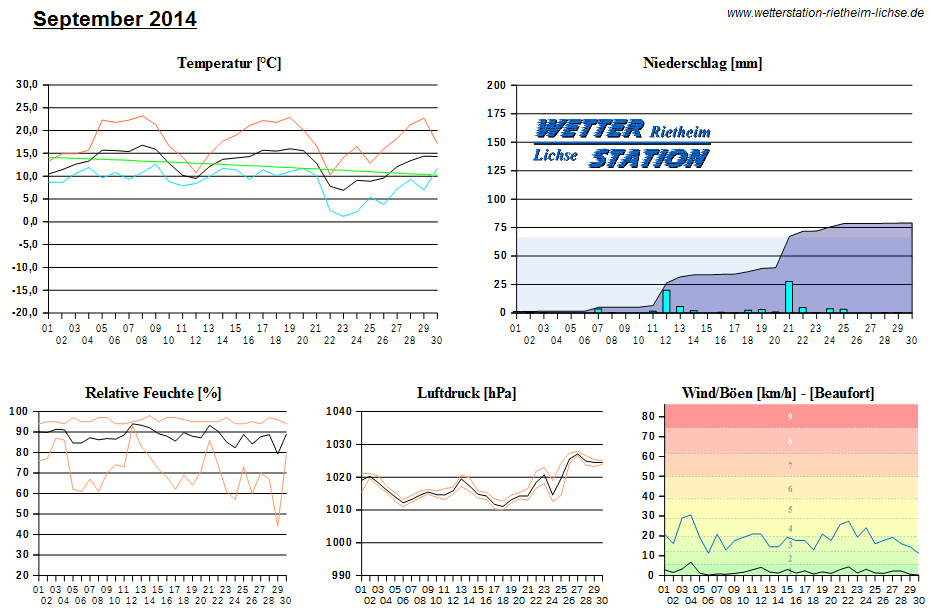 *************************************************** ************** T E M P E R A T U R ************** *************************************************** Mittlere Temperatur: 12,9 °C MIN Temperatur: 1,2 °C am 23.09.14 MAX Temperatur: 23,2 °C am 08.09.14 Mittlere MIN Temperatur: 8,8 °C Mittlere MAX Temperatur: 17,9 °C MIN Temp Delta : 2,4 K am 12.09.14 MAX Temp Delta : 15,7 K am 29.09.14 Mittl. Temp Delta: 9,1 K Starkfrosttage : 0 Eistage : 0 Frosttage : 0 Sommertage : 0 Heiße Tage : 0 *************************************************** ************ N I E D E R S C H L A G ************ *************************************************** Ges. Niederschlagsmenge: 79,0 mm MAX Niederschlag/Stunde: 4,8 mm am 21.09.14 MAX Niederschlag/Tag: 27,4 mm am 21.09.14 MAX Niederschlag in 24h: 27,8 mm am 22.09.14 MAX Niederschlag Rate: 73,4 mm/h am 21.09.14 Niederschlag an 17 Tagen Regentage (> 1mm) : 12 Regentage (> 3mm) : 6 Regentage (> 10mm) : 2 Regentage (> 20mm) : 1 *************************************************** ******************** W I N D ******************** *************************************************** Mittlere Windgeschwindigkeit: 0,6 m/s = 2,0 km/h Effektive Windrichtung: NNO Maximale Windgeschwindigkeit: 8,5 m/s = 30,6 km/h aus OSO am 04.09.14 Prozentuale Verteilung Windgeschwindigkeit: Bft_0 (bis 0,9 km/h) : 47.05 % Bft_1 (bis 5,6 km/h) : 42.06 % Bft_2 (bis 12 km/h) : 10.68 % Bft_3 (bis 20 km/h) : 0.21 % Prozentuale Verteilung Windrichtung: N : 11.3 % NNO : 4.8 % NO : 5.1 % ONO : 2.0 % O : 2.7 % OSO : 20.9 % SO : 5.6 % SSO : 0.7 % S : 2.3 % SSW : 8.5 % SW : 1.8 % WSW : 3.6 % W : 1.6 % WNW : 1.5 % NW : 6.8 % NNW : 20.8 % *************************************************** *************** L U F T D R U C K *************** *************************************************** Mittlerer Luftdruck: 1017,3 hPa MIN Luftdruck: 1010,0 hPa am 18.09.14 MAX Luftdruck: 1027,9 hPa am 27.09.14 *************************************************** ************ L U F T F E U C H T E ************** *************************************************** Mittlere rel. Luftfeuchte: 88,1 % MIN rel. Luftfeuchte: 44,0 % am 29.09.14 MAX rel. Luftfeuchte: 98,0 % %