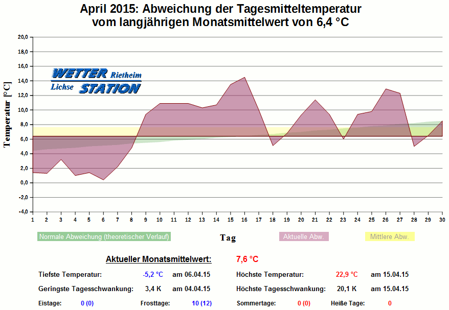 *************************************************** ************** T E M P E R A T U R ************** *************************************************** Mittlere Temperatur: 7,6 °C MIN Temperatur: -5,2 °C am 06.04.15 MAX Temperatur: 22,9 °C am 15.04.15 Mittlere MIN Temperatur: 1,5 °C Mittlere MAX Temperatur: 13,5 °C MIN Temp Delta : 3,4 K am 04.04.15 MAX Temp Delta : 20,1 K am 15.04.15 Mittl. Temp Delta: 12,1 K Starkfrosttage : 0 Eistage : 0 Frosttage : 10 Sommertage : 0 Heiße Tage : 0 *************************************************** ************ N I E D E R S C H L A G ************ *************************************************** Ges. Niederschlagsmenge: 107,2 mm MAX Niederschlag/Stunde: 17,0 mm am 27.04.15 MAX Niederschlag/Tag: 42,2 mm am 17.04.15 MAX Niederschlag in 24h: 42,4 mm am 17.04.15 MAX Niederschlag Rate: 162,2 mm/h am 27.04.15 Niederschlag an 11 Tagen Regentage (> 1mm) : 9 Regentage (> 3mm) : 6 Regentage (> 10mm) : 3 Regentage (> 20mm) : 2 *************************************************** ******************** W I N D ******************** *************************************************** Mittlere Windgeschwindigkeit: 1,0 m/s = 3,5 km/h Effektive Windrichtung: WNW Maximale Windgeschwindigkeit: 11,6 m/s = 41,8 km/h aus WNW am 01.04.15 Prozentuale Verteilung Windgeschwindigkeit: Bft_0 (bis 0,9 km/h) : 36.02 % Bft_1 (bis 5,6 km/h) : 37.13 % Bft_2 (bis 12 km/h) : 23.72 % Bft_3 (bis 20 km/h) : 3.11 % Bft_4 (bis 29 km/h) : 0.02 % Prozentuale Verteilung Windrichtung: N : 7.3 % NNO : 4.7 % NO : 7.8 % ONO : 2.0 % O : 2.4 % OSO : 10.0 % SO : 5.2 % SSO : 0.3 % S : 3.9 % SSW : 6.2 % SW : 10.5 % WSW : 11.0 % W : 4.2 % WNW : 3.6 % NW : 6.5 % NNW : 14.3 % *************************************************** *************** L U F T D R U C K *************** *************************************************** Mittlerer Luftdruck: 1020,1 hPa MIN Luftdruck: 998,2 hPa am 27.04.15 MAX Luftdruck: 1037,7 hPa am 07.04.15 *************************************************** ************ L U F T F E U C H T E ************** *************************************************** Mittlere rel. Luftfeuchte: 69,9 % MIN rel. Luftfeuchte: 24,0 % am 15.04.15 MAX rel. Luftfeuchte: 96,0 %