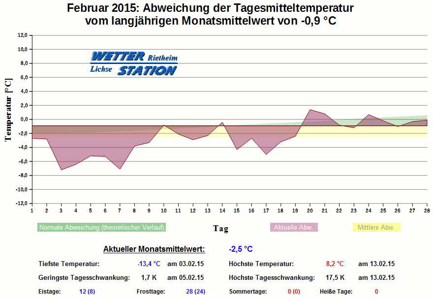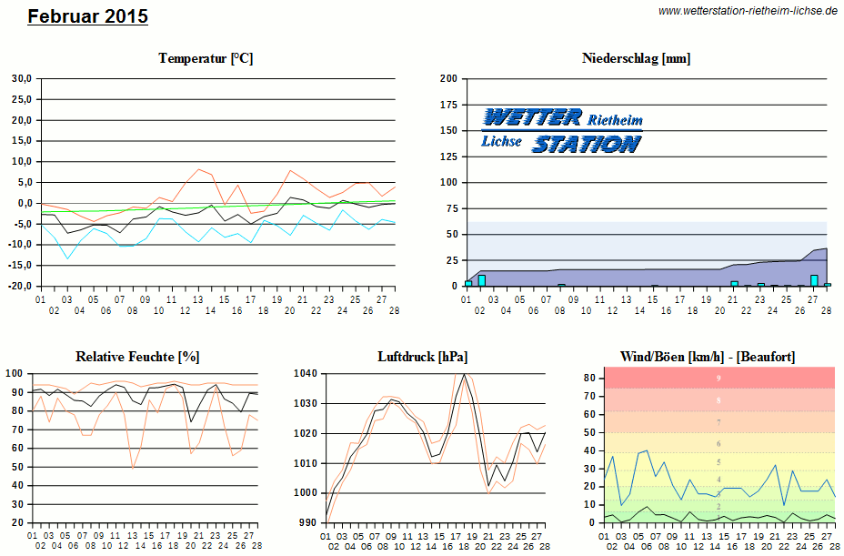*************************************************** ************** T E M P E R A T U R ************** *************************************************** Mittlere Temperatur: -2,5 °C MIN Temperatur: -13,4 °C am 03.02.15 MAX Temperatur: 8,2 °C am 13.02.15 Mittlere MIN Temperatur: -6,6 °C Mittlere MAX Temperatur: 1,5 °C MIN Temp Delta : 1,7 K am 05.02.15 MAX Temp Delta : 17,5 K am 13.02.15 Mittl. Temp Delta: 8,1 K Starkfrosttage : 3 Eistage : 12 Frosttage : 28 Sommertage : 0 Heiße Tage : 0 *************************************************** ************ N I E D E R S C H L A G ************ *************************************************** Ges. Niederschlagsmenge: 36,6 mm MAX Niederschlag/Stunde: 1,4 mm am 02.02.15 MAX Niederschlag/Tag: 10,2 mm am 02.02.15 MAX Niederschlag in 24h: 12,2 mm am 28.02.15 MAX Niederschlag Rate: 5,4 mm/h am 01.02.15 Niederschlag an 10 Tagen Regentage (> 1mm) : 7 Regentage (> 3mm) : 4 Regentage (> 10mm) : 2 Regentage (> 20mm) : 0 *************************************************** ******************** W I N D ******************** *************************************************** Mittlere Windgeschwindigkeit: 0,9 m/s = 3,2 km/h Effektive Windrichtung: SSO Maximale Windgeschwindigkeit: 11,2 m/s = 40,2 km/h aus OSO am 06.02.15 Prozentuale Verteilung Windgeschwindigkeit: Bft_0 (bis 0,9 km/h) : 33.72 % Bft_1 (bis 5,6 km/h) : 42.89 % Bft_2 (bis 12 km/h) : 22.26 % Bft_3 (bis 20 km/h) : 1.13 % Prozentuale Verteilung Windrichtung: N : 5.3 % NNO : 3.2 % NO : 14.6 % ONO : 2.6 % O : 2.2 % OSO : 7.5 % SO : 12.4 % SSO : 0.4 % S : 7.0 % SSW : 20.8 % SW : 5.4 % WSW : 4.3 % W : 1.7 % WNW : 1.6 % NW : 3.2 % NNW : 7.6 % *************************************************** *************** L U F T D R U C K *************** *************************************************** Mittlerer Luftdruck: 1018,1 hPa MIN Luftdruck: 988,3 hPa am 01.02.15 MAX Luftdruck: 1041,5 hPa am 18.02.15 *************************************************** ************ L U F T F E U C H T E ************** *************************************************** Mittlere rel. Luftfeuchte: 88,5 % MIN rel. Luftfeuchte: 49,0 % am 13.02.15 MAX rel. Luftfeuchte: 96,0 %
