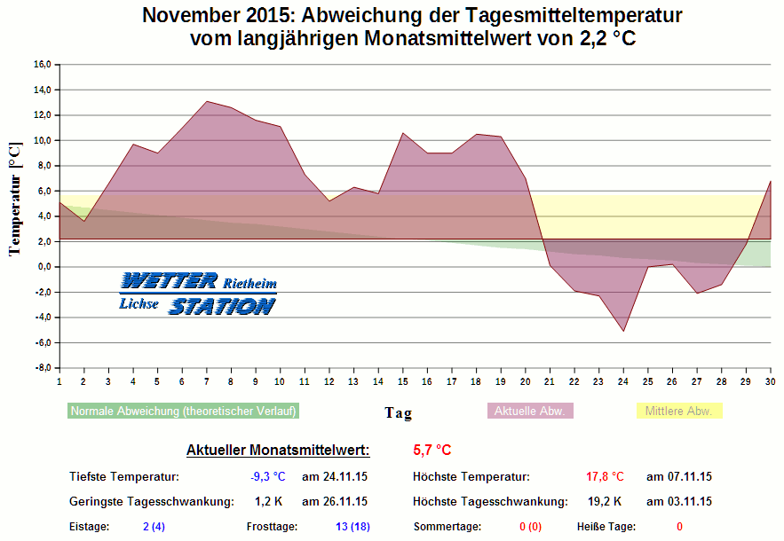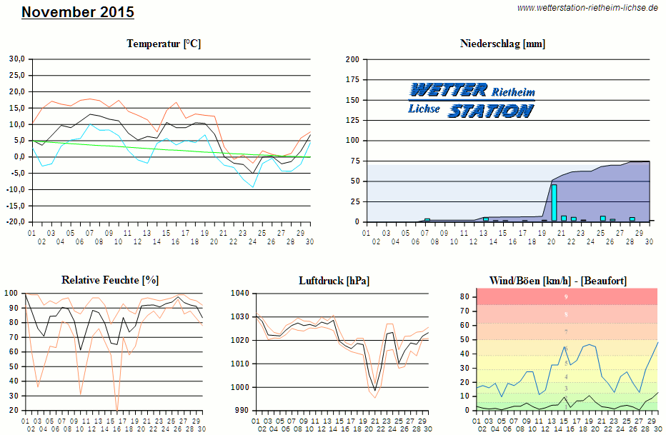 *************************************************** ************** T E M P E R A T U R ************** *************************************************** Mittlere Temperatur: 5,7 °C MIN Temperatur: -9,3 °C am 24.11.15 MAX Temperatur: 17,8 °C am 07.11.15 Mittlere MIN Temperatur: 1,5 °C Mittlere MAX Temperatur: 10,2 °C MIN Temp Delta : 1,2 K am 26.11.15 MAX Temp Delta : 19,2 K am 03.11.15 Mittl. Temp Delta: 8,7 K Starkfrosttage : 0 Eistage : 2 Frosttage : 13 Sommertage : 0 Heiße Tage : 0 *************************************************** ************ N I E D E R S C H L A G ************ *************************************************** Ges. Niederschlagsmenge: 74,4 mm MAX Niederschlag/Stunde: 5,2 mm am 20.11.15 MAX Niederschlag/Tag: 44,4 mm am 20.11.15 MAX Niederschlag in 24h: 44,8 mm am 21.11.15 MAX Niederschlag Rate: 13,0 mm/h am 07.11.15 Niederschlag an 13 Tagen Regentage (> 1mm) : 8 Regentage (> 3mm) : 6 Regentage (> 10mm) : 1 Regentage (> 20mm) : 1 *************************************************** ******************** W I N D ******************** *************************************************** Mittlere Windgeschwindigkeit: 1,1 m/s = 4,1 km/h Effektive Windrichtung: SW Maximale Windgeschwindigkeit: 13,4 m/s = 48,3 km/h aus S am 30.11.15 Prozentuale Verteilung Windgeschwindigkeit: Bft_0 (bis 0,9 km/h) : 32.12 % Bft_1 (bis 5,6 km/h) : 36.55 % Bft_2 (bis 12 km/h) : 25.58 % Bft_3 (bis 20 km/h) : 5.72 % Bft_4 (bis 29 km/h) : 0.03 % Prozentuale Verteilung Windrichtung: N : 2.5 % NNO : 0.5 % NO : 0.2 % ONO : 0.0 % O : 0.1 % OSO : 1.5 % SO : 3.9 % SSO : 0.3 % S : 6.8 % SSW : 27.9 % SW : 29.5 % WSW : 16.9 % W : 3.3 % WNW : 1.5 % NW : 1.9 % NNW : 3.4 % *************************************************** *************** L U F T D R U C K *************** *************************************************** Mittlerer Luftdruck: 1020,8 hPa MIN Luftdruck: 995,4 hPa am 21.11.15 MAX Luftdruck: 1031,8 hPa am 01.11.15 *************************************************** ************ L U F T F E U C H T E ************** *************************************************** Mittlere rel. Luftfeuchte: 84,4 % MIN rel. Luftfeuchte: 17,0 % am 16.11.15 MAX rel. Luftfeuchte: 100,0 %