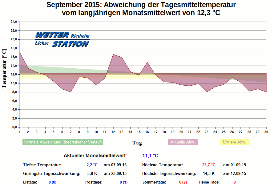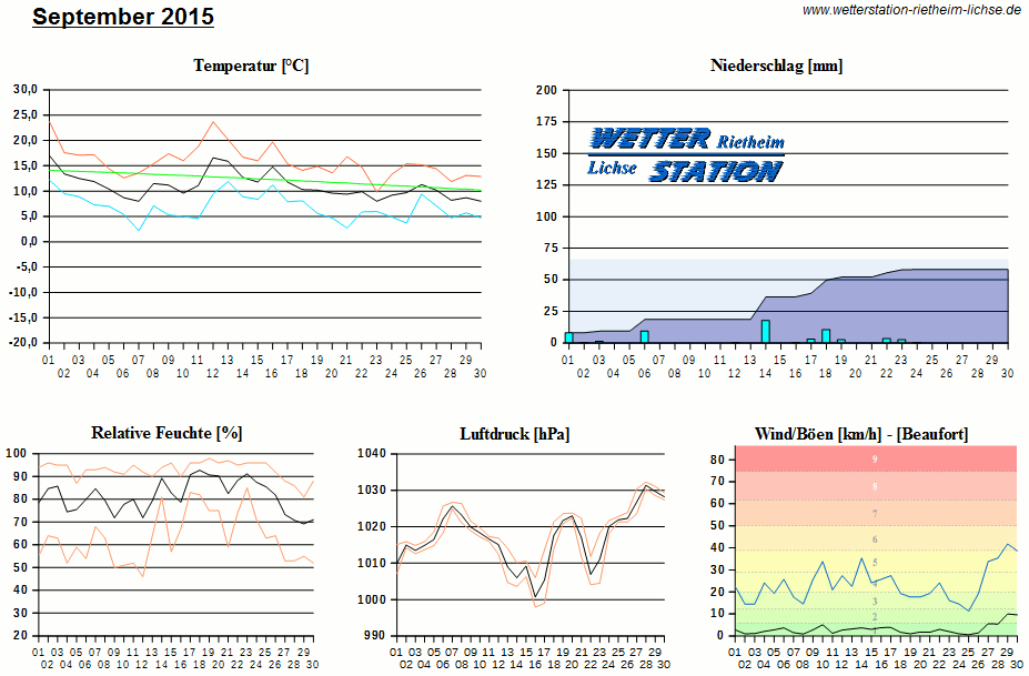 *************************************************** ************** T E M P E R A T U R ************** *************************************************** Mittlere Temperatur: 11,1 °C MIN Temperatur: 2,2 °C am 07.09.15 MAX Temperatur: 23,7 °C am 01.09.15 Mittlere MIN Temperatur: 6,8 °C Mittlere MAX Temperatur: 15,9 °C MIN Temp Delta : 3,8 K am 23.09.15 MAX Temp Delta : 14,3 K am 12.09.15 Mittl. Temp Delta: 9,0 K Starkfrosttage : 0 Eistage : 0 Frosttage : 0 Sommertage : 0 Heiße Tage : 0 *************************************************** ************ N I E D E R S C H L A G ************ *************************************************** Ges. Niederschlagsmenge: 58,2 mm MAX Niederschlag/Stunde: 10,4 mm am 14.09.15 MAX Niederschlag/Tag: 17,6 mm am 14.09.15 MAX Niederschlag in 24h: 17,6 mm am 14.09.15 MAX Niederschlag Rate: 169,4 mm/h am 14.09.15 Niederschlag an 13 Tagen Regentage (> 1mm) : 9 Regentage (> 3mm) : 5 Regentage (> 10mm) : 2 Regentage (> 20mm) : 0 *************************************************** ******************** W I N D ******************** *************************************************** Mittlere Windgeschwindigkeit: 0,8 m/s = 3,0 km/h Effektive Windrichtung: OSO Maximale Windgeschwindigkeit: 11,6 m/s = 41,8 km/h aus OSO am 29.09.15 Prozentuale Verteilung Windgeschwindigkeit: Bft_0 (bis 0,9 km/h) : 38.14 % Bft_1 (bis 5,6 km/h) : 42.20 % Bft_2 (bis 12 km/h) : 16.90 % Bft_3 (bis 20 km/h) : 2.72 % Bft_4 (bis 29 km/h) : 0.05 % Prozentuale Verteilung Windrichtung: N : 4.8 % NNO : 1.9 % NO : 6.2 % ONO : 4.3 % O : 14.3 % OSO : 26.0 % SO : 4.6 % SSO : 1.4 % S : 4.7 % SSW : 12.5 % SW : 2.4 % WSW : 2.3 % W : 0.9 % WNW : 1.8 % NW : 3.0 % NNW : 9.0 % *************************************************** *************** L U F T D R U C K *************** *************************************************** Mittlerer Luftdruck: 1017,3 hPa MIN Luftdruck: 997,9 hPa am 16.09.15 MAX Luftdruck: 1032,3 hPa am 28.09.15 *************************************************** ************ L U F T F E U C H T E ************** *************************************************** Mittlere rel. Luftfeuchte: 81,4 % MIN rel. Luftfeuchte: 46,0 % am 12.09.15 MAX rel. Luftfeuchte: 98,0 %