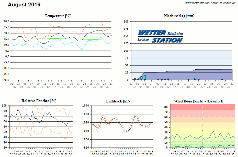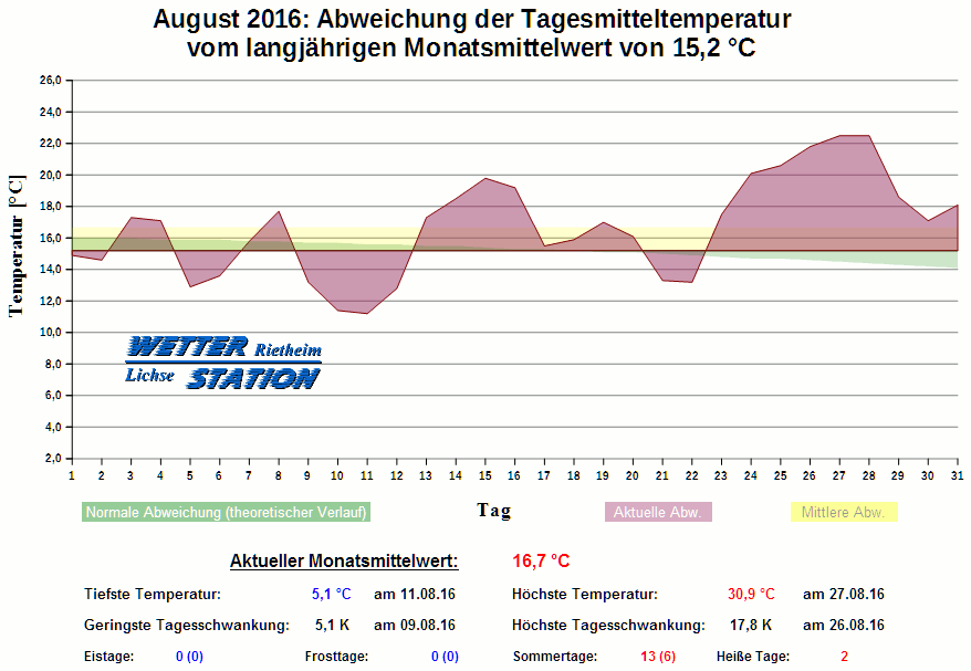 *************************************************** ************** T E M P E R A T U R ************** *************************************************** Mittlere Temperatur: 16,7 °C MIN Temperatur: 5,1 °C am 11.08.16 MAX Temperatur: 30,9 °C am 27.08.16 Mittlere MIN Temperatur: 10,8 °C Mittlere MAX Temperatur: 22,9 °C MIN Temp Delta : 5,1 K am 09.08.16 MAX Temp Delta : 17,8 K am 26.08.16 Mittl. Temp Delta: 12,1 K Starkfrosttage : 0 Eistage : 0 Frosttage : 0 Sommertage : 13 Heiße Tage : 2 *************************************************** ************ N I E D E R S C H L A G ************ *************************************************** Ges. Niederschlagsmenge: 36,2 mm MAX Niederschlag/Stunde: 4,2 mm am 05.08.16 MAX Niederschlag/Tag: 13,2 mm am 05.08.16 MAX Niederschlag in 24h: 23,2 mm am 05.08.16 MAX Niederschlag Rate: 39,4 mm/h am 05.08.16 Niederschlag an 12 Tagen Regentage (> 1mm) : 5 Regentage (> 3mm) : 3 Regentage (> 10mm) : 2 Regentage (> 20mm) : 0 *************************************************** ******************** W I N D ******************** *************************************************** Mittlere Windgeschwindigkeit: 0,6 m/s = 2,3 km/h Effektive Windrichtung: NNO Maximale Windgeschwindigkeit: 8,9 m/s = 32,2 km/h aus WNW am 21.08.16 Prozentuale Verteilung Windgeschwindigkeit: Bft_0 (bis 0,9 km/h) : 43.57 % Bft_1 (bis 5,6 km/h) : 44.14 % Bft_2 (bis 12 km/h) : 11.76 % Bft_3 (bis 20 km/h) : 0.53 % Prozentuale Verteilung Windrichtung: N : 8.3 % NNO : 2.7 % NO : 3.0 % ONO : 1.1 % O : 3.3 % OSO : 22.2 % SO : 2.6 % SSO : 1.5 % S : 4.6 % SSW : 11.5 % SW : 4.6 % WSW : 3.8 % W : 2.0 % WNW : 4.0 % NW : 6.4 % NNW : 18.5 % *************************************************** *************** L U F T D R U C K *************** *************************************************** Mittlerer Luftdruck: 1018,5 hPa MIN Luftdruck: 1008,2 hPa am 18.08.16 MAX Luftdruck: 1028,8 hPa am 07.08.16 *************************************************** ************ L U F T F E U C H T E ************** *************************************************** Mittlere rel. Luftfeuchte: 76,8 % MIN rel. Luftfeuchte: 37,0 % am 28.08.16 MAX rel. Luftfeuchte: 100,0 %