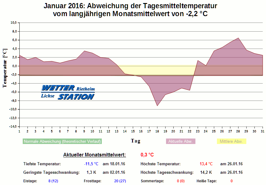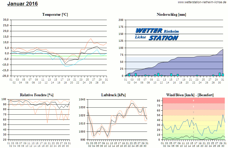 *************************************************** ************** T E M P E R A T U R ************** *************************************************** Mittlere Temperatur: 0,3 °C MIN Temperatur: -11,5 °C am 18.01.16 MAX Temperatur: 13,4 °C am 26.01.16 Mittlere MIN Temperatur: -2,5 °C Mittlere MAX Temperatur: 3,2 °C MIN Temp Delta : 1,3 K am 02.01.16 MAX Temp Delta : 14,2 K am 26.01.16 Mittl. Temp Delta: 5,7 K Starkfrosttage : 3 Eistage : 8 Frosttage : 20 Sommertage : 0 Heiße Tage : 0 *************************************************** ************ N I E D E R S C H L A G ************ *************************************************** Ges. Niederschlagsmenge: 95,6 mm MAX Niederschlag/Stunde: 3,2 mm am 30.01.16 MAX Niederschlag/Tag: 11,4 mm am 30.01.16 MAX Niederschlag in 24h: 18,2 mm am 31.01.16 MAX Niederschlag Rate: 5,8 mm/h am 01.01.16 Niederschlag an 22 Tagen Regentage (> 1mm) : 19 Regentage (> 3mm) : 12 Regentage (> 10mm) : 2 Regentage (> 20mm) : 0 *************************************************** ******************** W I N D ******************** *************************************************** Mittlere Windgeschwindigkeit: 1,1 m/s = 3,8 km/h Effektive Windrichtung: SSW Maximale Windgeschwindigkeit: 14,3 m/s = 51,5 km/h aus SSW am 30.01.16 Prozentuale Verteilung Windgeschwindigkeit: Bft_0 (bis 0,9 km/h) : 33.05 % Bft_1 (bis 5,6 km/h) : 36.86 % Bft_2 (bis 12 km/h) : 26.41 % Bft_3 (bis 20 km/h) : 3.60 % Bft_4 (bis 29 km/h) : 0.08 % Prozentuale Verteilung Windrichtung: N : 2.0 % NNO : 0.1 % NO : 0.0 % ONO : 0.0 % O : 0.2 % OSO : 4.7 % SO : 12.7 % SSO : 0.4 % S : 7.4 % SSW : 27.4 % SW : 21.4 % WSW : 14.6 % W : 2.7 % WNW : 1.4 % NW : 1.7 % NNW : 3.1 % *************************************************** *************** L U F T D R U C K *************** *************************************************** Mittlerer Luftdruck: 1015,7 hPa MIN Luftdruck: 991,8 hPa am 11.01.16 MAX Luftdruck: 1038,9 hPa am 23.01.16 *************************************************** ************ L U F T F E U C H T E ************** *************************************************** Mittlere rel. Luftfeuchte: 92,1 % MIN rel. Luftfeuchte: 53,0 % am 20.01.16 MAX rel. Luftfeuchte: 100,0 %