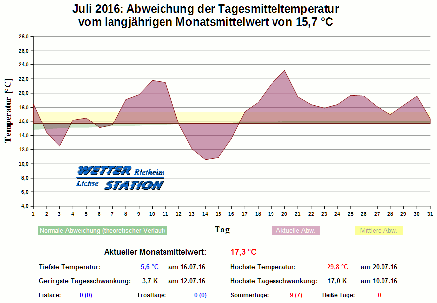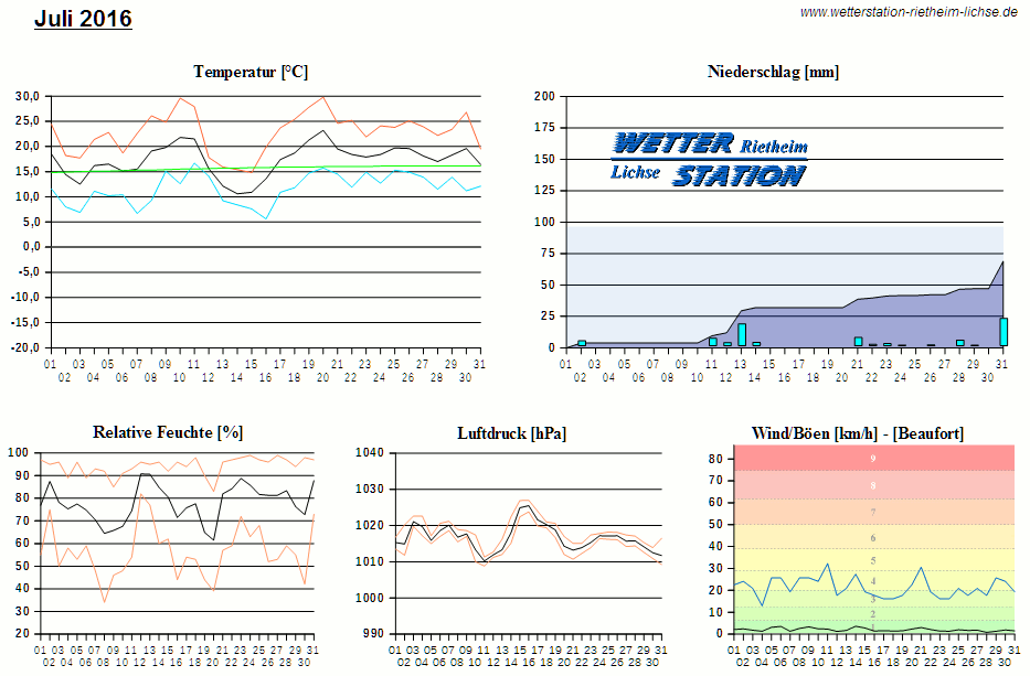 *************************************************** ************** T E M P E R A T U R ************** *************************************************** Mittlere Temperatur: 17,3 °C MIN Temperatur: 5,6 °C am 16.07.16 MAX Temperatur: 29,8 °C am 20.07.16 Mittlere MIN Temperatur: 11,7 °C Mittlere MAX Temperatur: 22,7 °C MIN Temp Delta : 3,7 K am 12.07.16 MAX Temp Delta : 17,0 K am 10.07.16 Mittl. Temp Delta: 11,0 K Starkfrosttage : 0 Eistage : 0 Frosttage : 0 Sommertage : 9 Heiße Tage : 0 *************************************************** ************ N I E D E R S C H L A G ************ *************************************************** Ges. Niederschlagsmenge: 68,8 mm MAX Niederschlag/Stunde: 11,0 mm am 31.07.16 MAX Niederschlag/Tag: 21,8 mm am 31.07.16 MAX Niederschlag in 24h: 21,8 mm am 31.07.16 MAX Niederschlag Rate: 147,6 mm/h am 11.07.16 Niederschlag an 13 Tagen Regentage (> 1mm) : 9 Regentage (> 3mm) : 6 Regentage (> 10mm) : 2 Regentage (> 20mm) : 1 *************************************************** ******************** W I N D ******************** *************************************************** Mittlere Windgeschwindigkeit: 0,6 m/s = 2,0 km/h Effektive Windrichtung: NW Maximale Windgeschwindigkeit: 8,9 m/s = 32,2 km/h aus SW am 11.07.16 Prozentuale Verteilung Windgeschwindigkeit: Bft_0 (bis 0,9 km/h) : 47.13 % Bft_1 (bis 5,6 km/h) : 42.69 % Bft_2 (bis 12 km/h) : 10.14 % Bft_3 (bis 20 km/h) : 0.04 % Prozentuale Verteilung Windrichtung: N : 10.0 % NNO : 4.0 % NO : 3.8 % ONO : 0.7 % O : 1.1 % OSO : 9.3 % SO : 2.4 % SSO : 1.5 % S : 3.3 % SSW : 8.3 % SW : 4.9 % WSW : 5.4 % W : 2.7 % WNW : 7.1 % NW : 9.8 % NNW : 25.6 % *************************************************** *************** L U F T D R U C K *************** *************************************************** Mittlerer Luftdruck: 1016,6 hPa MIN Luftdruck: 1008,8 hPa am 11.07.16 MAX Luftdruck: 1027,0 hPa am 16.07.16 *************************************************** ************ L U F T F E U C H T E ************** *************************************************** Mittlere rel. Luftfeuchte: 77,9 % MIN rel. Luftfeuchte: 34,0 % am 08.07.16 MAX rel. Luftfeuchte: 99,0 %