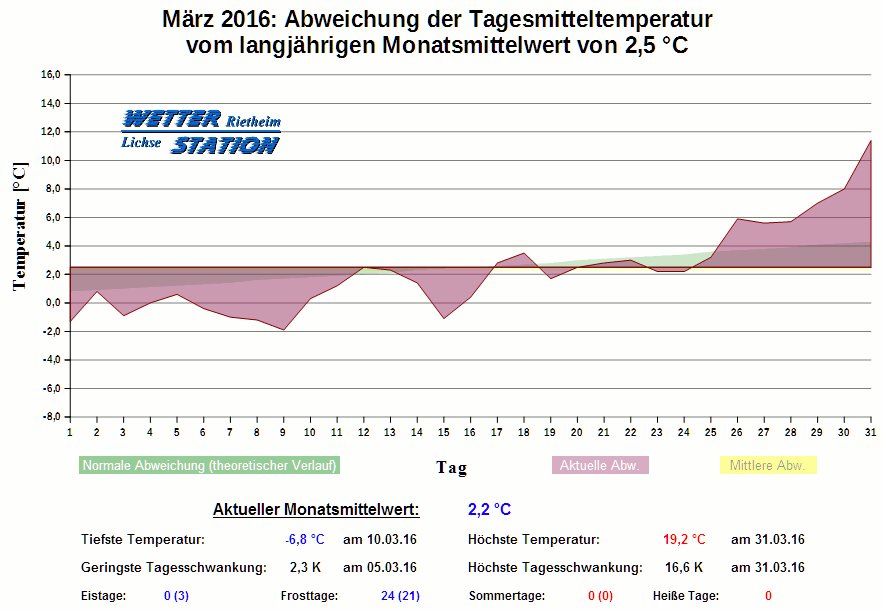*************************************************** ************** T E M P E R A T U R ************** *************************************************** Mittlere Temperatur: 2,2 °C MIN Temperatur: -6,8 °C am 10.03.16 MAX Temperatur: 19,2 °C am 31.03.16 Mittlere MIN Temperatur: -1,5 °C Mittlere MAX Temperatur: 6,7 °C MIN Temp Delta : 2,3 K am 05.03.16 MAX Temp Delta : 16,6 K am 31.03.16 Mittl. Temp Delta: 8,2 K Starkfrosttage : 0 Eistage : 0 Frosttage : 24 Sommertage : 0 Heiße Tage : 0 *************************************************** ************ N I E D E R S C H L A G ************ *************************************************** Ges. Niederschlagsmenge: 41,8 mm MAX Niederschlag/Stunde: 2,8 mm am 02.03.16 MAX Niederschlag/Tag: 11,6 mm am 25.03.16 MAX Niederschlag in 24h: 12,4 mm am 26.03.16 MAX Niederschlag Rate: 8,8 mm/h am 02.03.16 Niederschlag an 14 Tagen Regentage (> 1mm) : 11 Regentage (> 3mm) : 3 Regentage (> 10mm) : 1 Regentage (> 20mm) : 0 *************************************************** ******************** W I N D ******************** *************************************************** Mittlere Windgeschwindigkeit: 1,1 m/s = 3,9 km/h Effektive Windrichtung: SO Maximale Windgeschwindigkeit: 13,0 m/s = 46,7 km/h aus OSO am 16.03.16 Prozentuale Verteilung Windgeschwindigkeit: Bft_0 (bis 0,9 km/h) : 30.70 % Bft_1 (bis 5,6 km/h) : 42.75 % Bft_2 (bis 12 km/h) : 20.39 % Bft_3 (bis 20 km/h) : 5.91 % Bft_4 (bis 29 km/h) : 0.25 % Prozentuale Verteilung Windrichtung: N : 6.0 % NNO : 3.6 % NO : 7.8 % ONO : 4.1 % O : 10.0 % OSO : 14.0 % SO : 8.3 % SSO : 0.3 % S : 3.3 % SSW : 17.2 % SW : 8.0 % WSW : 5.5 % W : 1.9 % WNW : 1.0 % NW : 1.6 % NNW : 7.5 % *************************************************** *************** L U F T D R U C K *************** *************************************************** Mittlerer Luftdruck: 1014,7 hPa MIN Luftdruck: 994,9 hPa am 05.03.16 MAX Luftdruck: 1028,5 hPa am 13.03.16 *************************************************** ************ L U F T F E U C H T E ************** *************************************************** Mittlere rel. Luftfeuchte: 84,5 % MIN rel. Luftfeuchte: 42,0 % am 17.03.16 MAX rel. Luftfeuchte: 99,0 %