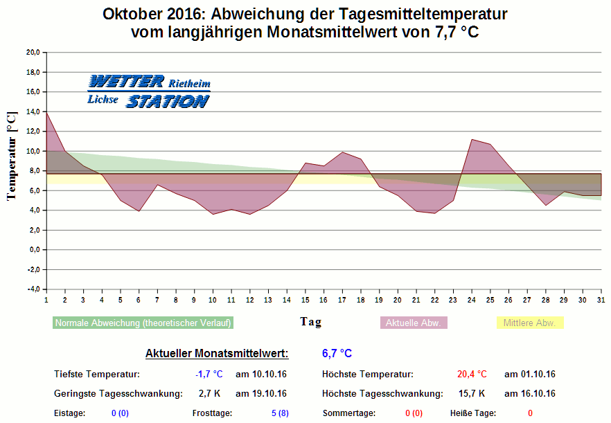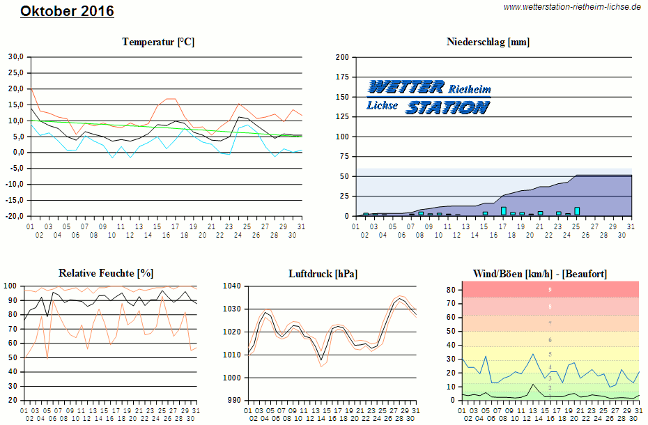 *************************************************** ************** T E M P E R A T U R ************** *************************************************** Mittlere Temperatur: 6,7 °C MIN Temperatur: -1,7 °C am 10.10.16 MAX Temperatur: 20,4 °C am 01.10.16 Mittlere MIN Temperatur: 3,0 °C Mittlere MAX Temperatur: 11,0 °C MIN Temp Delta : 2,7 K am 19.10.16 MAX Temp Delta : 15,7 K am 16.10.16 Mittl. Temp Delta: 7,9 K Starkfrosttage : 0 Eistage : 0 Frosttage : 5 Sommertage : 0 Heiße Tage : 0 *************************************************** ************ N I E D E R S C H L A G ************ *************************************************** Ges. Niederschlagsmenge: 51,8 mm MAX Niederschlag/Stunde: 5,0 mm am 17.10.16 MAX Niederschlag/Tag: 9,8 mm am 17.10.16 MAX Niederschlag in 24h: 12,8 mm am 18.10.16 MAX Niederschlag Rate: 18,4 mm/h am 17.10.16 Niederschlag an 18 Tagen Regentage (> 1mm) : 13 Regentage (> 3mm) : 6 Regentage (> 10mm) : 0 Regentage (> 20mm) : 0 *************************************************** ******************** W I N D ******************** *************************************************** Mittlere Windgeschwindigkeit: 1,0 m/s = 3,5 km/h Effektive Windrichtung: SO Maximale Windgeschwindigkeit: 9,4 m/s = 33,8 km/h aus O am 13.10.16 Prozentuale Verteilung Windgeschwindigkeit: Bft_0 (bis 0,9 km/h) : 15.10 % Bft_1 (bis 5,6 km/h) : 65.27 % Bft_2 (bis 12 km/h) : 17.93 % Bft_3 (bis 20 km/h) : 1.70 % Prozentuale Verteilung Windrichtung: N : 6.9 % NNO : 5.3 % NO : 6.0 % ONO : 2.2 % O : 2.9 % OSO : 24.2 % SO : 3.0 % SSO : 1.7 % S : 3.7 % SSW : 17.7 % SW : 4.7 % WSW : 4.5 % W : 3.2 % WNW : 2.8 % NW : 2.8 % NNW : 8.5 % *************************************************** *************** L U F T D R U C K *************** *************************************************** Mittlerer Luftdruck: 1020,6 hPa MIN Luftdruck: 1004,8 hPa am 14.10.16 MAX Luftdruck: 1035,9 hPa am 28.10.16 *************************************************** ************ L U F T F E U C H T E ************** *************************************************** Mittlere rel. Luftfeuchte: 89,8 % MIN rel. Luftfeuchte: 49,0 % am 01.10.16 MAX rel. Luftfeuchte: 100,0 %