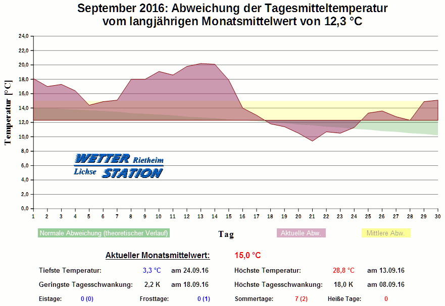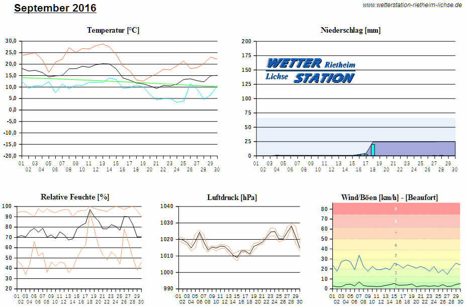 *************************************************** ************** T E M P E R A T U R ************** *************************************************** Mittlere Temperatur: 15,0 °C MIN Temperatur: 3,3 °C am 24.09.16 MAX Temperatur: 28,8 °C am 13.09.16 Mittlere MIN Temperatur: 9,3 °C Mittlere MAX Temperatur: 21,3 °C MIN Temp Delta : 2,2 K am 18.09.16 MAX Temp Delta : 18,0 K am 08.09.16 Mittl. Temp Delta: 12,0 K Starkfrosttage : 0 Eistage : 0 Frosttage : 0 Sommertage : 7 Heiße Tage : 0 *************************************************** ************ N I E D E R S C H L A G ************ *************************************************** Ges. Niederschlagsmenge: 25,0 mm MAX Niederschlag/Stunde: 2,8 mm am 18.09.16 MAX Niederschlag/Tag: 19,8 mm am 18.09.16 MAX Niederschlag in 24h: 21,2 mm am 18.09.16 MAX Niederschlag Rate: 3,6 mm/h am 18.09.16 Niederschlag an 6 Tagen Regentage (> 1mm) : 3 Regentage (> 3mm) : 1 Regentage (> 10mm) : 1 Regentage (> 20mm) : 0 *************************************************** ******************** W I N D ******************** *************************************************** Mittlere Windgeschwindigkeit: 1,0 m/s = 3,5 km/h Effektive Windrichtung: NO Maximale Windgeschwindigkeit: 9,4 m/s = 33,8 km/h aus OSO am 07.09.16 Prozentuale Verteilung Windgeschwindigkeit: Bft_0 (bis 0,9 km/h) : 21.04 % Bft_1 (bis 5,6 km/h) : 55.13 % Bft_2 (bis 12 km/h) : 23.26 % Bft_3 (bis 20 km/h) : 0.57 % Prozentuale Verteilung Windrichtung: N : 10.8 % NNO : 3.4 % NO : 4.0 % ONO : 1.6 % O : 3.6 % OSO : 21.6 % SO : 2.3 % SSO : 2.5 % S : 2.9 % SSW : 11.8 % SW : 4.4 % WSW : 5.1 % W : 3.2 % WNW : 3.6 % NW : 5.1 % NNW : 14.2 % *************************************************** *************** L U F T D R U C K *************** *************************************************** Mittlerer Luftdruck: 1017,7 hPa MIN Luftdruck: 1007,0 hPa am 15.09.16 MAX Luftdruck: 1029,7 hPa am 28.09.16 *************************************************** ************ L U F T F E U C H T E ************** *************************************************** Mittlere rel. Luftfeuchte: 77,8 % MIN rel. Luftfeuchte: 34,0 % am 03.09.16 MAX rel. Luftfeuchte: 100,0 %