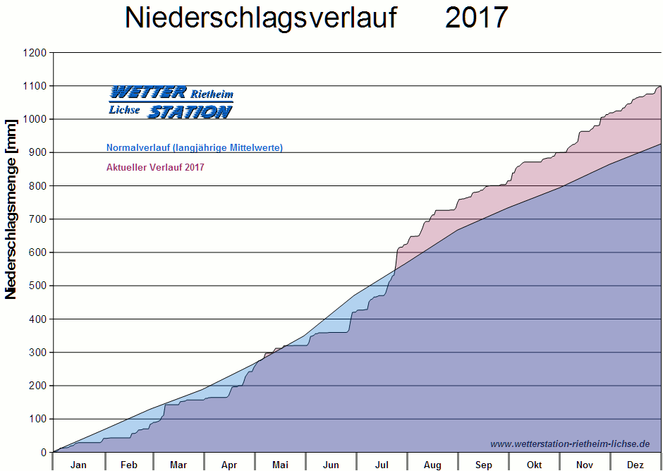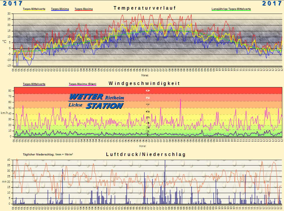 *************************************************** ************** T E M P E R A T U R ************** *************************************************** Mittlere Temperatur: 7,9 °C MIN Temperatur: -17,3 °C am 07.01.17 MAX Temperatur: 31,2 °C am 22.06.17 Mittlere MIN Temperatur: 3,5 °C Mittlere MAX Temperatur: 12,8 °C MIN Temp Delta : 1,2 K am 08.11.17 MAX Temp Delta : 19,1 K am 08.04.17 Mittl. Temp Delta: 9,2 K Starkfrosttage : 10 Eistage : 33 Frosttage : 119 Sommertage : 39 Heiße Tage : 3 *************************************************** ************ N I E D E R S C H L A G ************ *************************************************** Ges. Niederschlagsmenge: 1097,8 mm MAX Niederschlag/Stunde: 11,6 mm am 21.07.17 MAX Niederschlag/Tag: 46,2 mm am 26.07.17 MAX Niederschlag in 24h: 56,2 mm am 26.07.17 MAX Niederschlag Rate: 274,2 mm/h am 15.08.17 Niederschlag an 199 Tagen Regentage (> 1mm) : 146 Regentage (> 3mm) : 102 Regentage (> 10mm) : 36 Regentage (> 20mm) : 9 Längste Niederschlagsperiode: 11 Tage vom 18.07.17 bis zum 28.07.17 Längste Trockenperiode: 13 Tage vom 17.01.17 bis zum 29.01.17 *************************************************** ******************** W I N D ******************** *************************************************** Mittlere Windgeschwindigkeit: 1,2 m/s = 4,5 km/h Effektive Windrichtung: SW Maximale Windgeschwindigkeit: 18,3 m/s = 66,0 km/h aus NW am 15.08.17 Prozentuale Verteilung Windgeschwindigkeit: Bft_0 (bis 0,9 km/h) : 13,01 % Bft_1 (bis 5,6 km/h) : 55,11 % Bft_2 (bis 12 km/h) : 28,63 % Bft_3 (bis 20 km/h) : 3,17 % Bft_4 (bis 29 km/h) : 0,08 % Prozentuale Verteilung Windrichtung: N : 7,1 % NNO : 2,5 % NO : 2,1 % ONO : 0,8 % O : 2,1 % OSO : 10,3 % SO : 4,9 % SSO : 1,5 % S : 3,6 % SSW : 24,0 % SW : 8,2 % WSW : 9,1 % W : 5,0 % WNW : 4,4 % NW : 4,9 % NNW : 9,5 % *************************************************** *************** L U F T D R U C K *************** *************************************************** Mittlerer Luftdruck: 1017,7 hPa MIN Luftdruck: 981,7 hPa am 11.12.17 MAX Luftdruck: 1041,3 hPa am 06.01.17 Grösster Luftdruck-Anstieg innerhalb 24 Stunden: 29,5 hPa am 12.12.17 Grösster Luftdruck-Abfall innerhalb 24 Stunden: -28,3 hPa am 10.12.17 *************************************************** ************ L U F T F E U C H T E ************** *************************************************** Mittlere rel. Luftfeuchte: 83,0 % MIN rel. Luftfeuchte: 24 % am 23.02.17 MAX rel. Luftfeuchte: 100 %