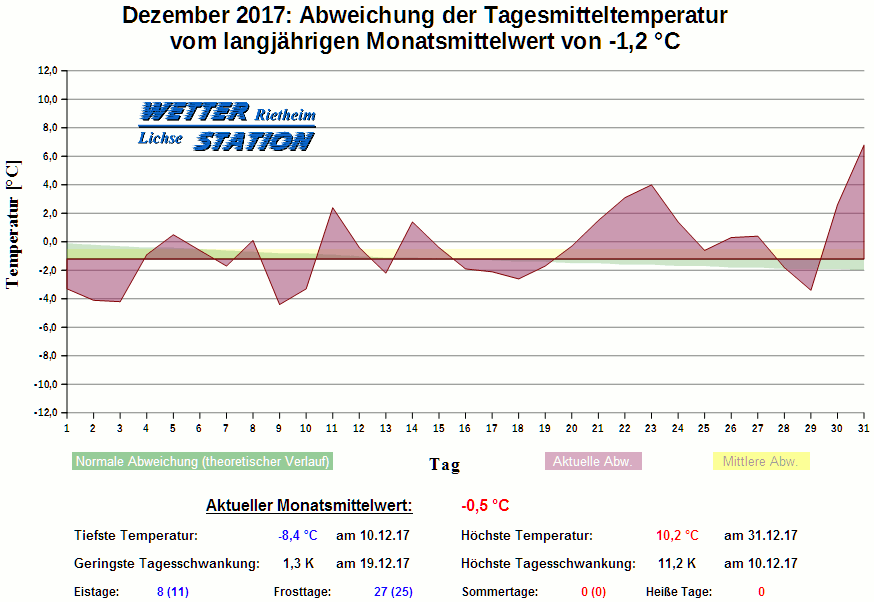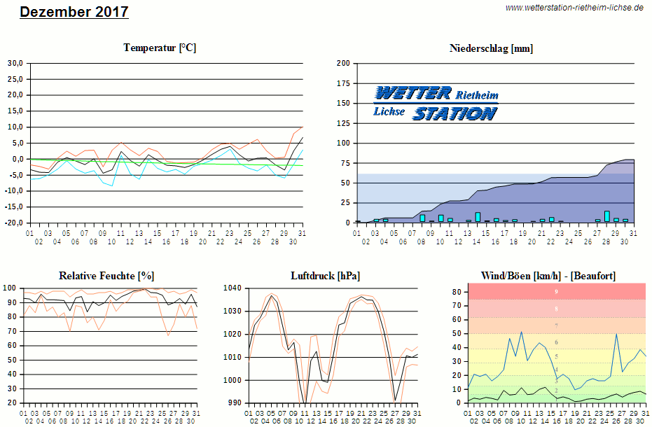 *************************************************** ************** T E M P E R A T U R ************** *************************************************** Mittlere Temperatur: -0,5 °C MIN Temperatur: -8,4 °C am 10.12.17 MAX Temperatur: 10,2 °C am 31.12.17 Mittlere MIN Temperatur: -2,9 °C Mittlere MAX Temperatur: 2,0 °C MIN Temp Delta : 1,3 K am 19.12.17 MAX Temp Delta : 11,2 K am 10.12.17 Mittl. Temp Delta: 5,0 K Starkfrosttage : 0 Eistage : 8 Frosttage : 27 Sommertage : 0 Heiße Tage : 0 *************************************************** ************ N I E D E R S C H L A G ************ *************************************************** Ges. Niederschlagsmenge: 79,4 mm MAX Niederschlag/Stunde: 3,8 mm am 14.12.17 MAX Niederschlag/Tag: 13,0 mm am 28.12.17 MAX Niederschlag in 24h: 14,4 mm am 28.12.17 MAX Niederschlag Rate: 12,4 mm/h am 14.12.17 Niederschlag an 21 Tagen Regentage (> 1mm) : 16 Regentage (> 3mm) : 8 Regentage (> 10mm) : 2 Regentage (> 20mm) : 0 *************************************************** ******************** W I N D ******************** *************************************************** Mittlere Windgeschwindigkeit: 1,5 m/s = 5,3 km/h Effektive Windrichtung: SW Maximale Windgeschwindigkeit: 14,3 m/s = 51,5 km/h aus SSO am 10.12.17 Prozentuale Verteilung Windgeschwindigkeit: Bft_0 (bis 0,9 km/h) : 8.39 % Bft_1 (bis 5,6 km/h) : 52.60 % Bft_2 (bis 12 km/h) : 32.21 % Bft_3 (bis 20 km/h) : 6.53 % Bft_4 (bis 29 km/h) : 0.27 % Prozentuale Verteilung Windrichtung: N : 1.6 % NNO : 0.4 % NO : 0.7 % ONO : 0.6 % O : 0.9 % OSO : 1.1 % SO : 2.6 % SSO : 0.6 % S : 4.4 % SSW : 46.7 % SW : 11.8 % WSW : 11.1 % W : 6.4 % WNW : 3.7 % NW : 3.6 % NNW : 3.8 % *************************************************** *************** L U F T D R U C K *************** *************************************************** Mittlerer Luftdruck: 1017,6 hPa MIN Luftdruck: 981,7 hPa am 11.12.17 MAX Luftdruck: 1037,9 hPa am 05.12.17 *************************************************** ************ L U F T F E U C H T E ************** *************************************************** Mittlere rel. Luftfeuchte: 92,6 % MIN rel. Luftfeuchte: 67,0 % am 26.12.17 MAX rel. Luftfeuchte: 100,0 %