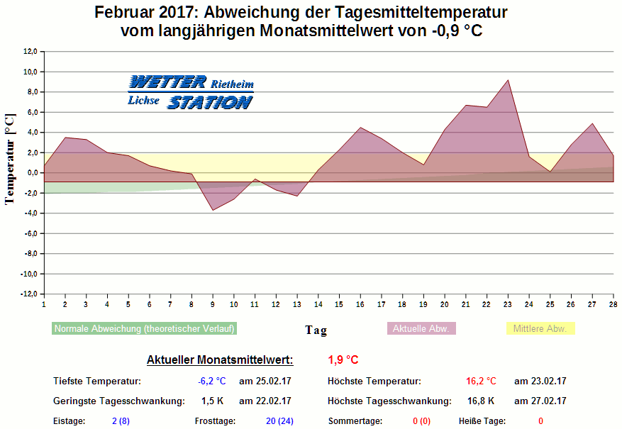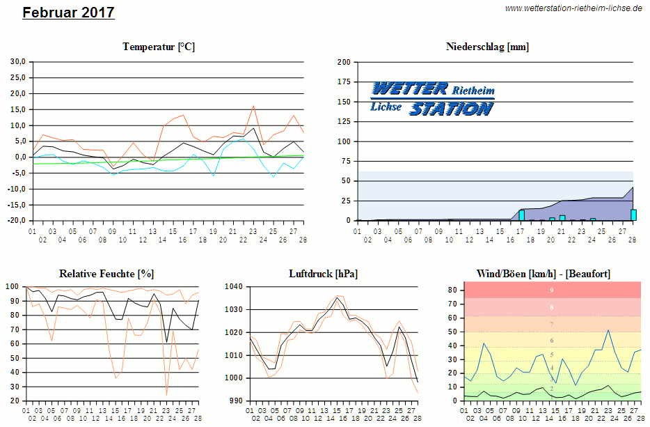 *************************************************** ************** T E M P E R A T U R ************** *************************************************** Mittlere Temperatur: 1,9 °C MIN Temperatur: -6,2 °C am 25.02.17 MAX Temperatur: 16,2 °C am 23.02.17 Mittlere MIN Temperatur: -1,6 °C Mittlere MAX Temperatur: 5,9 °C MIN Temp Delta : 1,5 K am 22.02.17 MAX Temp Delta : 16,8 K am 27.02.17 Mittl. Temp Delta: 7,5 K Starkfrosttage : 0 Eistage : 2 Frosttage : 20 Sommertage : 0 Heiße Tage : 0 *************************************************** ************ N I E D E R S C H L A G ************ *************************************************** Ges. Niederschlagsmenge: 42,6 mm MAX Niederschlag/Stunde: 3,2 mm am 28.02.17 MAX Niederschlag/Tag: 13,6 mm am 28.02.17 MAX Niederschlag in 24h: 13,6 mm am 28.02.17 MAX Niederschlag Rate: 10,8 mm/h am 28.02.17 Niederschlag an 13 Tagen Regentage (> 1mm) : 5 Regentage (> 3mm) : 4 Regentage (> 10mm) : 2 Regentage (> 20mm) : 0 *************************************************** ******************** W I N D ******************** *************************************************** Mittlere Windgeschwindigkeit: 1,4 m/s = 5,1 km/h Effektive Windrichtung: SSW Maximale Windgeschwindigkeit: 14,3 m/s = 51,5 km/h aus WSW am 23.02.17 Prozentuale Verteilung Windgeschwindigkeit: Bft_0 (bis 0,9 km/h) : 7.22 % Bft_1 (bis 5,6 km/h) : 56.26 % Bft_2 (bis 12 km/h) : 30.67 % Bft_3 (bis 20 km/h) : 5.47 % Bft_4 (bis 29 km/h) : 0.38 % Prozentuale Verteilung Windrichtung: N : 2.7 % NNO : 0.7 % NO : 0.5 % ONO : 0.6 % O : 2.4 % OSO : 15.8 % SO : 12.1 % SSO : 2.6 % S : 4.8 % SSW : 20.5 % SW : 12.9 % WSW : 13.5 % W : 4.4 % WNW : 1.9 % NW : 1.8 % NNW : 2.9 % *************************************************** *************** L U F T D R U C K *************** *************************************************** Mittlerer Luftdruck: 1018,2 hPa MIN Luftdruck: 993,6 hPa am 28.02.17 MAX Luftdruck: 1036,1 hPa am 15.02.17 *************************************************** ************ L U F T F E U C H T E ************** *************************************************** Mittlere rel. Luftfeuchte: 87,5 % MIN rel. Luftfeuchte: 24,0 % am 23.02.17 MAX rel. Luftfeuchte: 100,0 %