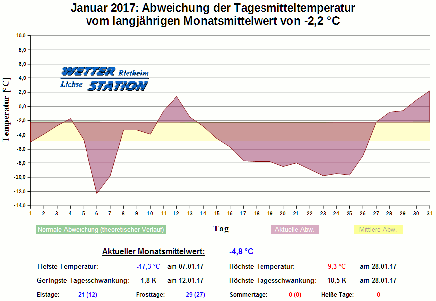 *************************************************** ************** T E M P E R A T U R ************** *************************************************** Mittlere Temperatur: -4,8 °C MIN Temperatur: -17,3 °C am 07.01.17 MAX Temperatur: 9,3 °C am 28.01.17 Mittlere MIN Temperatur: -8,3 °C Mittlere MAX Temperatur: -1,1 °C MIN Temp Delta : 1,8 K am 12.01.17 MAX Temp Delta : 18,5 K am 28.01.17 Mittl. Temp Delta: 7,2 K Starkfrosttage : 10 Eistage : 21 Frosttage : 29 Sommertage : 0 Heiße Tage : 0 *************************************************** ************ N I E D E R S C H L A G ************ *************************************************** Ges. Niederschlagsmenge: 41,4 mm MAX Niederschlag/Stunde: 1,8 mm am 04.01.17 MAX Niederschlag/Tag: 8,8 mm am 31.01.17 MAX Niederschlag in 24h: 9,4 mm am 31.01.17 MAX Niederschlag Rate: 4,0 mm/h am 31.01.17 Niederschlag an 14 Tagen Regentage (> 1mm) : 10 Regentage (> 3mm) : 6 Regentage (> 10mm) : 0 Regentage (> 20mm) : 0 *************************************************** ******************** W I N D ******************** *************************************************** Mittlere Windgeschwindigkeit: 1,4 m/s = 4,9 km/h Effektive Windrichtung: SSW Maximale Windgeschwindigkeit: 15,2 m/s = 54,7 km/h aus SW am 13.01.17 Prozentuale Verteilung Windgeschwindigkeit: Bft_0 (bis 0,9 km/h) : 10.06 % Bft_1 (bis 5,6 km/h) : 54.74 % Bft_2 (bis 12 km/h) : 29.69 % Bft_3 (bis 20 km/h) : 5.48 % Bft_4 (bis 29 km/h) : 0.03 % Prozentuale Verteilung Windrichtung: N : 6.9 % NNO : 2.7 % NO : 3.4 % ONO : 2.2 % O : 6.0 % OSO : 15.4 % SO : 4.0 % SSO : 2.1 % S : 3.2 % SSW : 17.9 % SW : 7.1 % WSW : 9.3 % W : 5.7 % WNW : 2.7 % NW : 3.6 % NNW : 7.7 % *************************************************** *************** L U F T D R U C K *************** *************************************************** Mittlerer Luftdruck: 1024,5 hPa MIN Luftdruck: 995,1 hPa am 13.01.17 MAX Luftdruck: 1041,3 hPa am 06.01.17 *************************************************** ************ L U F T F E U C H T E ************** *************************************************** Mittlere rel. Luftfeuchte: 89,5 % MIN rel. Luftfeuchte: 32,0 % am 28.01.17 MAX rel. Luftfeuchte: 100,0 %