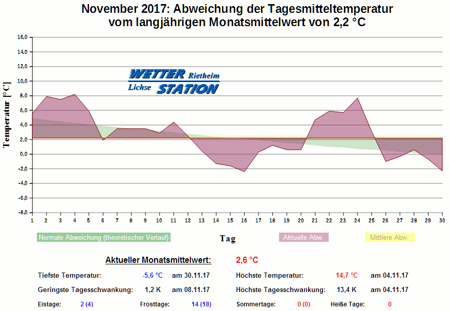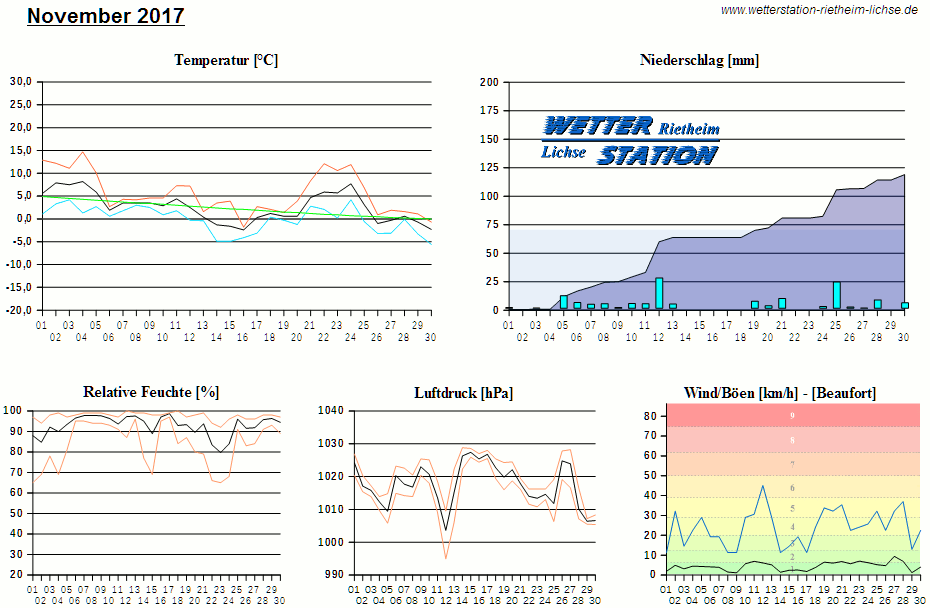 *************************************************** ************** T E M P E R A T U R ************** *************************************************** Mittlere Temperatur: 2,6 °C MIN Temperatur: -5,6 °C am 30.11.17 MAX Temperatur: 14,7 °C am 04.11.17 Mittlere MIN Temperatur: -0,1 °C Mittlere MAX Temperatur: 5,6 °C MIN Temp Delta : 1,2 K am 08.11.17 MAX Temp Delta : 13,4 K am 04.11.17 Mittl. Temp Delta: 5,7 K Starkfrosttage : 0 Eistage : 2 Frosttage : 14 Sommertage : 0 Heiße Tage : 0 *************************************************** ************ N I E D E R S C H L A G ************ *************************************************** Ges. Niederschlagsmenge: 119,0 mm MAX Niederschlag/Stunde: 5,4 mm am 12.11.17 MAX Niederschlag/Tag: 26,8 mm am 12.11.17 MAX Niederschlag in 24h: 27,2 mm am 12.11.17 MAX Niederschlag Rate: 22,2 mm/h am 12.11.17 Niederschlag an 20 Tagen Regentage (> 1mm) : 15 Regentage (> 3mm) : 13 Regentage (> 10mm) : 3 Regentage (> 20mm) : 2 *************************************************** ******************** W I N D ******************** *************************************************** Mittlere Windgeschwindigkeit: 1,2 m/s = 4,5 km/h Effektive Windrichtung: SW Maximale Windgeschwindigkeit: 12,5 m/s = 45,1 km/h aus S am 12.11.17 Prozentuale Verteilung Windgeschwindigkeit: Bft_0 (bis 0,9 km/h) : 13.88 % Bft_1 (bis 5,6 km/h) : 52.22 % Bft_2 (bis 12 km/h) : 31.12 % Bft_3 (bis 20 km/h) : 2.78 % Prozentuale Verteilung Windrichtung: N : 5.8 % NNO : 2.8 % NO : 1.7 % ONO : 0.4 % O : 0.6 % OSO : 2.8 % SO : 2.3 % SSO : 0.6 % S : 3.9 % SSW : 42.6 % SW : 11.2 % WSW : 8.3 % W : 3.8 % WNW : 2.8 % NW : 4.0 % NNW : 6.4 % *************************************************** *************** L U F T D R U C K *************** *************************************************** Mittlerer Luftdruck: 1017,5 hPa MIN Luftdruck: 994,9 hPa am 12.11.17 MAX Luftdruck: 1028,8 hPa am 14.11.17 *************************************************** ************ L U F T F E U C H T E ************** *************************************************** Mittlere rel. Luftfeuchte: 92,8 % MIN rel. Luftfeuchte: 65,0 % am 01.11.17 MAX rel. Luftfeuchte: 100,0 %