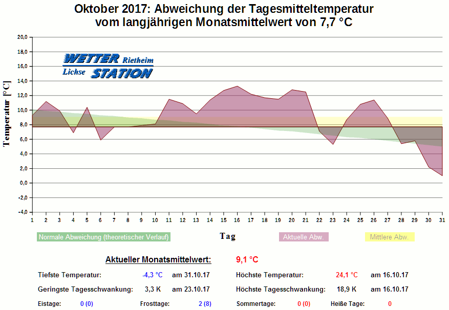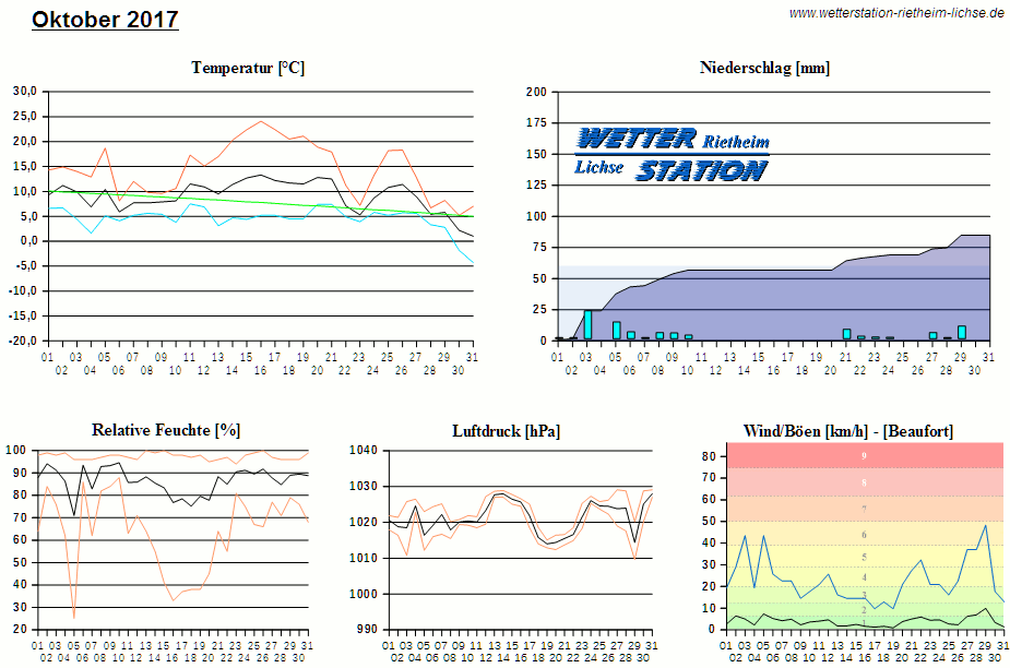 *************************************************** ************** T E M P E R A T U R ************** *************************************************** Mittlere Temperatur: 9,1 °C MIN Temperatur: -4,3 °C am 31.10.17 MAX Temperatur: 24,1 °C am 16.10.17 Mittlere MIN Temperatur: 4,5 °C Mittlere MAX Temperatur: 14,5 °C MIN Temp Delta : 3,3 K am 23.10.17 MAX Temp Delta : 18,9 K am 16.10.17 Mittl. Temp Delta: 10,0 K Starkfrosttage : 0 Eistage : 0 Frosttage : 2 Sommertage : 0 Heiße Tage : 0 *************************************************** ************ N I E D E R S C H L A G ************ *************************************************** Ges. Niederschlagsmenge: 85,0 mm MAX Niederschlag/Stunde: 7,8 mm am 03.10.17 MAX Niederschlag/Tag: 22,6 mm am 03.10.17 MAX Niederschlag in 24h: 23,2 mm am 03.10.17 MAX Niederschlag Rate: 64,0 mm/h am 03.10.17 Niederschlag an 16 Tagen Regentage (> 1mm) : 12 Regentage (> 3mm) : 8 Regentage (> 10mm) : 3 Regentage (> 20mm) : 1 *************************************************** ******************** W I N D ******************** *************************************************** Mittlere Windgeschwindigkeit: 1,1 m/s = 3,9 km/h Effektive Windrichtung: WSW Maximale Windgeschwindigkeit: 13,4 m/s = 48,3 km/h aus WNW am 29.10.17 Prozentuale Verteilung Windgeschwindigkeit: Bft_0 (bis 0,9 km/h) : 18.29 % Bft_1 (bis 5,6 km/h) : 56.98 % Bft_2 (bis 12 km/h) : 22.49 % Bft_3 (bis 20 km/h) : 2.21 % Bft_4 (bis 29 km/h) : 0.03 % Prozentuale Verteilung Windrichtung: N : 5.6 % NNO : 1.3 % NO : 0.4 % ONO : 0.1 % O : 0.2 % OSO : 2.1 % SO : 1.4 % SSO : 1.1 % S : 3.5 % SSW : 29.9 % SW : 12.2 % WSW : 11.7 % W : 7.3 % WNW : 6.4 % NW : 6.5 % NNW : 10.3 % *************************************************** *************** L U F T D R U C K *************** *************************************************** Mittlerer Luftdruck: 1021,3 hPa MIN Luftdruck: 1009,6 hPa am 29.10.17 MAX Luftdruck: 1029,1 hPa am 27.10.17 *************************************************** ************ L U F T F E U C H T E ************** *************************************************** Mittlere rel. Luftfeuchte: 86,5 % MIN rel. Luftfeuchte: 25,0 % am 05.10.17 MAX rel. Luftfeuchte: 100,0 %