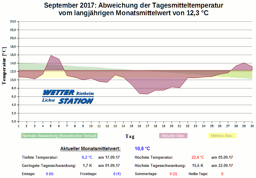 *************************************************** ************** T E M P E R A T U R ************** *************************************************** Mittlere Temperatur: 10,5 °C MIN Temperatur: 0,2 °C am 17.09.17 MAX Temperatur: 22,4 °C am 05.09.17 Mittlere MIN Temperatur: 6,1 °C Mittlere MAX Temperatur: 15,8 °C MIN Temp Delta : 1,7 K am 01.09.17 MAX Temp Delta : 15,6 K am 22.09.17 Mittl. Temp Delta: 9,7 K Starkfrosttage : 0 Eistage : 0 Frosttage : 0 Sommertage : 0 Heiße Tage : 0 *************************************************** ************ N I E D E R S C H L A G ************ *************************************************** Ges. Niederschlagsmenge: 65,0 mm MAX Niederschlag/Stunde: 4,0 mm am 17.09.17 MAX Niederschlag/Tag: 11,4 mm am 09.09.17 MAX Niederschlag in 24h: 14,0 mm am 10.09.17 MAX Niederschlag Rate: 36,2 mm/h am 17.09.17 Niederschlag an 21 Tagen Regentage (> 1mm) : 13 Regentage (> 3mm) : 7 Regentage (> 10mm) : 2 Regentage (> 20mm) : 0 *************************************************** ******************** W I N D ******************** *************************************************** Mittlere Windgeschwindigkeit: 0,9 m/s = 3,3 km/h Effektive Windrichtung: SW Maximale Windgeschwindigkeit: 11,2 m/s = 40,2 km/h aus SSW am 13.09.17 Prozentuale Verteilung Windgeschwindigkeit: Bft_0 (bis 0,9 km/h) : 24.85 % Bft_1 (bis 5,6 km/h) : 55.72 % Bft_2 (bis 12 km/h) : 17.26 % Bft_3 (bis 20 km/h) : 2.15 % Bft_4 (bis 29 km/h) : 0.02 % Prozentuale Verteilung Windrichtung: N : 7.3 % NNO : 3.3 % NO : 1.9 % ONO : 0.3 % O : 0.8 % OSO : 7.3 % SO : 2.6 % SSO : 1.6 % S : 4.6 % SSW : 34.9 % SW : 8.4 % WSW : 6.2 % W : 2.6 % WNW : 4.3 % NW : 4.2 % NNW : 9.7 % *************************************************** *************** L U F T D R U C K *************** *************************************************** Mittlerer Luftdruck: 1016,0 hPa MIN Luftdruck: 1001,0 hPa am 09.09.17 MAX Luftdruck: 1024,5 hPa am 28.09.17 *************************************************** ************ L U F T F E U C H T E ************** *************************************************** Mittlere rel. Luftfeuchte: 87,6 % MIN rel. Luftfeuchte: 50,0 % am 04.09.17 MAX rel. Luftfeuchte: 100,0 %