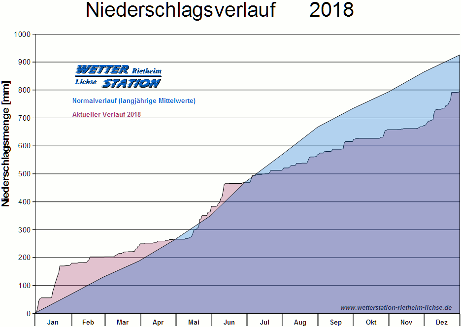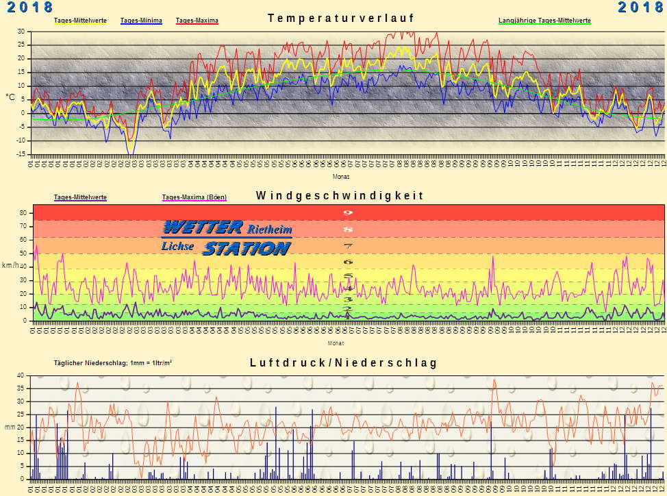 *************************************************** ************** T E M P E R A T U R ************** *************************************************** Mittlere Temperatur: 9,0 °C MIN Temperatur: -16,2 °C am 28.02.18 MAX Temperatur: 32,0 °C am 31.07.18 Mittlere MIN Temperatur: 4,5 °C Mittlere MAX Temperatur: 13,9 °C MIN Temp Delta : 0,5 K am 27.11.18 MAX Temp Delta : 20,3 K am 27.09.18 Mittl. Temp Delta: 9,4 K Starkfrosttage : 7 Eistage : 30 Frosttage : 100 Sommertage : 47 Heiße Tage : 7 *************************************************** ************ N I E D E R S C H L A G ************ *************************************************** Ges. Niederschlagsmenge: 795,4 mm MAX Niederschlag/Stunde: 17,4 mm am 12.06.18 MAX Niederschlag/Tag: 28,0 mm am 22.05.18 MAX Niederschlag in 24h: 44,2 mm am 12.06.18 MAX Niederschlag Rate: 129,4 mm/h am 11.06.18 Niederschlag an 155 Tagen Regentage (> 1mm) : 109 Regentage (> 3mm) : 64 Regentage (> 10mm) : 24 Regentage (> 20mm) : 9 Längste Niederschlagsperiode: 8 Tage vom 15.01.18 bis zum 22.01.18 Längste Trockenperiode: 17 Tage vom 07.10.18 bis zum 23.10.18 *************************************************** ******************** W I N D ******************** *************************************************** Mittlere Windgeschwindigkeit: 1,2 m/s = 4,2 km/h Effektive Windrichtung: SSO Maximale Windgeschwindigkeit: 15,6 m/s = 56,3 km/h aus NNO am 03.01.18 Prozentuale Verteilung Windgeschwindigkeit: Bft_0 (bis 0,9 km/h) : 22,61 % Bft_1 (bis 5,6 km/h) : 46,23 % Bft_2 (bis 12 km/h) : 27,06 % Bft_3 (bis 20 km/h) : 4,02 % Bft_4 (bis 29 km/h) : 0,08 % Prozentuale Verteilung Windrichtung: N : 7,7 % NNO : 3,8 % NO : 4,6 % ONO : 2,1 % O : 5,0 % OSO : 20,5 % SO : 6,3 % SSO : 1,1 % S : 2,1 % SSW : 19,5 % SW : 5,8 % WSW : 4,8 % W : 2,8 % WNW : 2,8 % NW : 3,3 % NNW : 7,9 % *************************************************** *************** L U F T D R U C K *************** *************************************************** Mittlerer Luftdruck: 1015,4 hPa MIN Luftdruck: 983,6 hPa am 30.10.18 MAX Luftdruck: 1037,9 hPa am 25.09.18 Grösster Luftdruck-Anstieg innerhalb 24 Stunden: 30,5 hPa am 31.10.18 Grösster Luftdruck-Abfall innerhalb 24 Stunden: -22,3 hPa am 03.01.18 *************************************************** ************ L U F T F E U C H T E ************** *************************************************** Mittlere rel. Luftfeuchte: 81,3 % MIN rel. Luftfeuchte: 25 % am 07.04.18 MAX rel. Luftfeuchte: 100 %