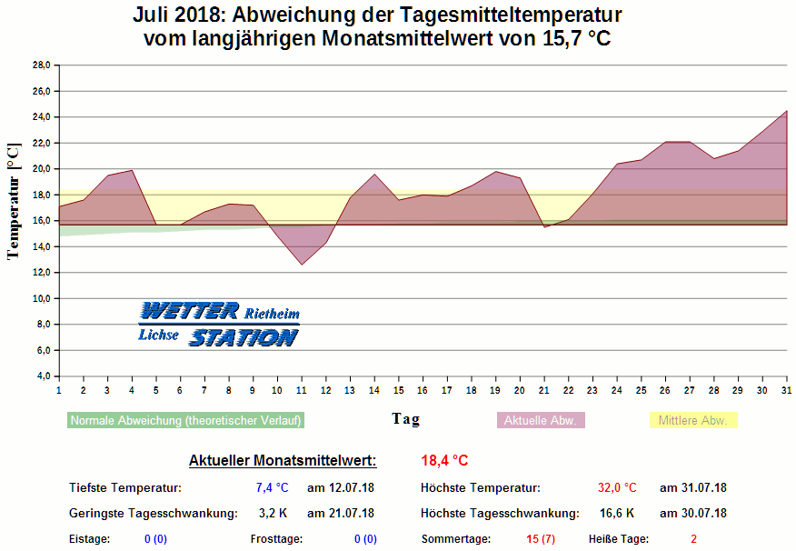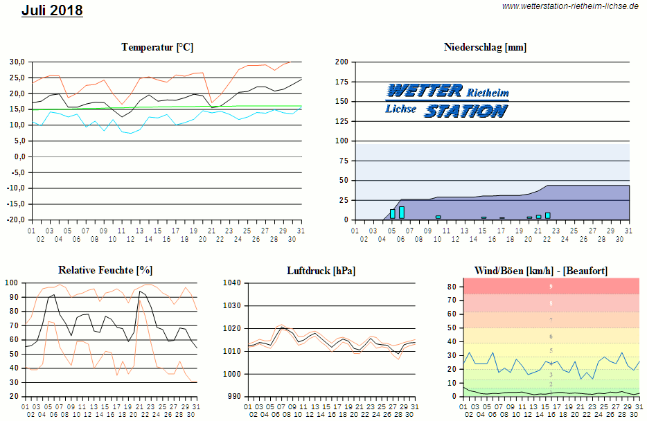 *************************************************** ************** T E M P E R A T U R ************** *************************************************** Mittlere Temperatur: 18,4 °C MIN Temperatur: 7,4 °C am 12.07.18 MAX Temperatur: 32,0 °C am 31.07.18 Mittlere MIN Temperatur: 12,2 °C Mittlere MAX Temperatur: 24,5 °C MIN Temp Delta : 3,2 K am 21.07.18 MAX Temp Delta : 16,6 K am 30.07.18 Mittl. Temp Delta: 12,4 K Starkfrosttage : 0 Eistage : 0 Frosttage : 0 Sommertage : 15 Heiße Tage : 2 *************************************************** ************ N I E D E R S C H L A G ************ *************************************************** Ges. Niederschlagsmenge: 43,8 mm MAX Niederschlag/Stunde: 5,4 mm am 06.07.18 MAX Niederschlag/Tag: 14,8 mm am 06.07.18 MAX Niederschlag in 24h: 21,0 mm am 06.07.18 MAX Niederschlag Rate: 53,6 mm/h am 06.07.18 Niederschlag an 8 Tagen Regentage (> 1mm) : 7 Regentage (> 3mm) : 4 Regentage (> 10mm) : 2 Regentage (> 20mm) : 0 *************************************************** ******************** W I N D ******************** *************************************************** Mittlere Windgeschwindigkeit: 0,8 m/s = 2,8 km/h Effektive Windrichtung: NO Maximale Windgeschwindigkeit: 8,9 m/s = 32,2 km/h aus OSO am 02.07.18 Prozentuale Verteilung Windgeschwindigkeit: Bft_0 (bis 0,9 km/h) : 36.19 % Bft_1 (bis 5,6 km/h) : 45.86 % Bft_2 (bis 12 km/h) : 17.20 % Bft_3 (bis 20 km/h) : 0.75 % Prozentuale Verteilung Windrichtung: N : 13.5 % NNO : 6.9 % NO : 8.5 % ONO : 2.6 % O : 5.7 % OSO : 20.7 % SO : 2.0 % SSO : 1.6 % S : 1.7 % SSW : 8.7 % SW : 1.8 % WSW : 2.4 % W : 1.6 % WNW : 4.4 % NW : 5.1 % NNW : 12.8 % *************************************************** *************** L U F T D R U C K *************** *************************************************** Mittlerer Luftdruck: 1014,2 hPa MIN Luftdruck: 1006,4 hPa am 28.07.18 MAX Luftdruck: 1021,8 hPa am 07.07.18 *************************************************** ************ L U F T F E U C H T E ************** *************************************************** Mittlere rel. Luftfeuchte: 70,5 % MIN rel. Luftfeuchte: 31,0 % am 30.07.18 MAX rel. Luftfeuchte: 99,0 %