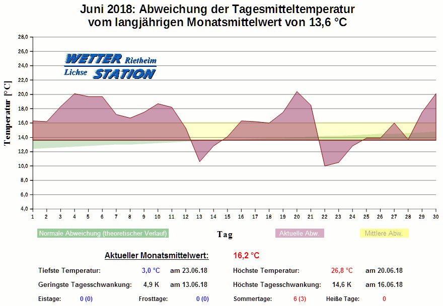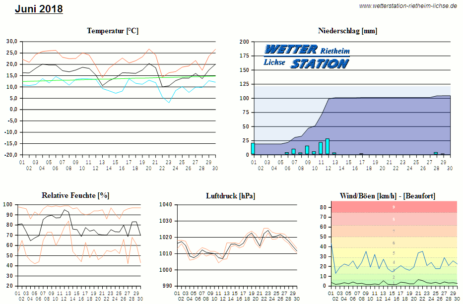 *************************************************** ************** T E M P E R A T U R ************** *************************************************** Mittlere Temperatur: 16,2 °C MIN Temperatur: 3,0 °C am 23.06.18 MAX Temperatur: 26,8 °C am 20.06.18 Mittlere MIN Temperatur: 10,8 °C Mittlere MAX Temperatur: 21,6 °C MIN Temp Delta : 4,9 K am 13.06.18 MAX Temp Delta : 14,6 K am 16.06.18 Mittl. Temp Delta: 10,8 K Starkfrosttage : 0 Eistage : 0 Frosttage : 0 Sommertage : 6 Heiße Tage : 0 *************************************************** ************ N I E D E R S C H L A G ************ *************************************************** Ges. Niederschlagsmenge: 104,6 mm MAX Niederschlag/Stunde: 17,4 mm am 12.06.18 MAX Niederschlag/Tag: 27,0 mm am 12.06.18 MAX Niederschlag in 24h: 41,8 mm am 12.06.18 MAX Niederschlag Rate: 129,4 mm/h am 11.06.18 Niederschlag an 12 Tagen Regentage (> 1mm) : 10 Regentage (> 3mm) : 6 Regentage (> 10mm) : 4 Regentage (> 20mm) : 2 *************************************************** ******************** W I N D ******************** *************************************************** Mittlere Windgeschwindigkeit: 0,9 m/s = 3,1 km/h Effektive Windrichtung: NNO Maximale Windgeschwindigkeit: 12,1 m/s = 43,5 km/h aus SSW am 01.06.18 Prozentuale Verteilung Windgeschwindigkeit: Bft_0 (bis 0,9 km/h) : 29.68 % Bft_1 (bis 5,6 km/h) : 50.61 % Bft_2 (bis 12 km/h) : 19.20 % Bft_3 (bis 20 km/h) : 0.49 % Bft_4 (bis 29 km/h) : 0.02 % Prozentuale Verteilung Windrichtung: N : 21.2 % NNO : 10.6 % NO : 10.9 % ONO : 3.6 % O : 5.7 % OSO : 11.0 % SO : 1.2 % SSO : 0.6 % S : 0.4 % SSW : 2.6 % SW : 1.0 % WSW : 1.5 % W : 1.0 % WNW : 3.2 % NW : 5.1 % NNW : 20.5 % *************************************************** *************** L U F T D R U C K *************** *************************************************** Mittlerer Luftdruck: 1015,2 hPa MIN Luftdruck: 1004,3 hPa am 11.06.18 MAX Luftdruck: 1025,6 hPa am 22.06.18 *************************************************** ************ L U F T F E U C H T E ************** *************************************************** Mittlere rel. Luftfeuchte: 77,6 % MIN rel. Luftfeuchte: 42,0 % am 05.06.18 MAX rel. Luftfeuchte: 99,0 %
