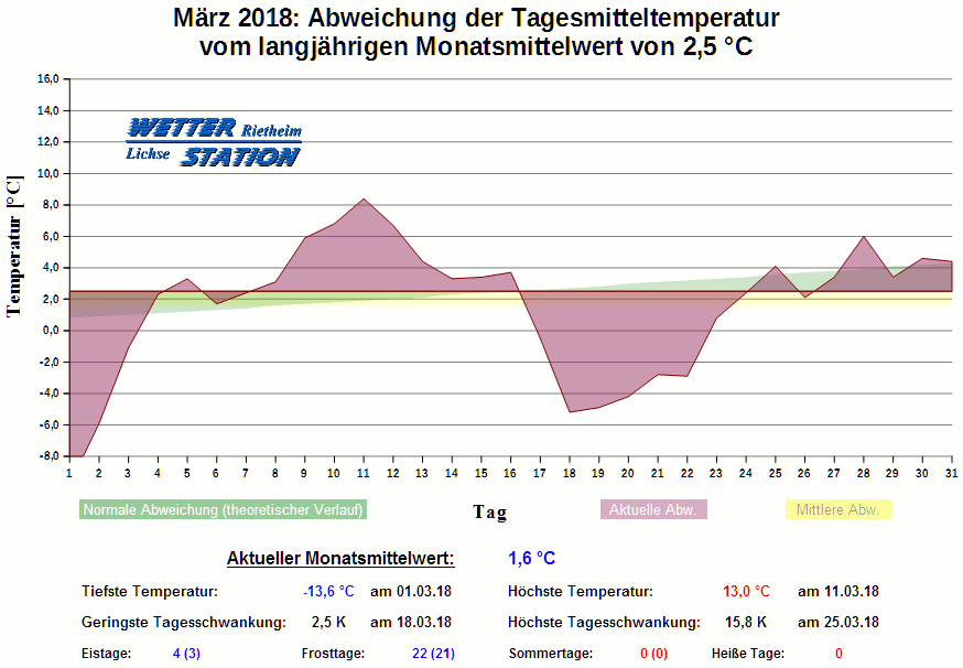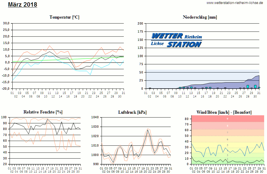 *************************************************** ************** T E M P E R A T U R ************** *************************************************** Mittlere Temperatur: 1,6 °C MIN Temperatur: -13,6 °C am 01.03.18 MAX Temperatur: 13,0 °C am 11.03.18 Mittlere MIN Temperatur: -2,3 °C Mittlere MAX Temperatur: 5,9 °C MIN Temp Delta : 2,5 K am 18.03.18 MAX Temp Delta : 15,8 K am 25.03.18 Mittl. Temp Delta: 8,2 K Starkfrosttage : 2 Eistage : 4 Frosttage : 22 Sommertage : 0 Heiße Tage : 0 *************************************************** ************ N I E D E R S C H L A G ************ *************************************************** Ges. Niederschlagsmenge: 40,4 mm MAX Niederschlag/Stunde: 4,0 mm am 30.03.18 MAX Niederschlag/Tag: 8,8 mm am 30.03.18 MAX Niederschlag in 24h: 11,6 mm am 31.03.18 MAX Niederschlag Rate: 11,2 mm/h am 30.03.18 Niederschlag an 17 Tagen Regentage (> 1mm) : 9 Regentage (> 3mm) : 3 Regentage (> 10mm) : 0 Regentage (> 20mm) : 0 *************************************************** ******************** W I N D ******************** *************************************************** Mittlere Windgeschwindigkeit: 1,4 m/s = 5,2 km/h Effektive Windrichtung: SSO Maximale Windgeschwindigkeit: 10,7 m/s = 38,6 km/h aus O am 30.03.18 Prozentuale Verteilung Windgeschwindigkeit: Bft_0 (bis 0,9 km/h) : 10.64 % Bft_1 (bis 5,6 km/h) : 49.63 % Bft_2 (bis 12 km/h) : 33.19 % Bft_3 (bis 20 km/h) : 6.39 % Bft_4 (bis 29 km/h) : 0.15 % Prozentuale Verteilung Windrichtung: N : 4.8 % NNO : 3.4 % NO : 2.2 % ONO : 0.8 % O : 3.6 % OSO : 24.3 % SO : 9.9 % SSO : 0.6 % S : 2.9 % SSW : 22.4 % SW : 8.8 % WSW : 4.9 % W : 2.3 % WNW : 2.2 % NW : 2.3 % NNW : 4.6 % *************************************************** *************** L U F T D R U C K *************** *************************************************** Mittlerer Luftdruck: 1005,1 hPa MIN Luftdruck: 990,5 hPa am 06.03.18 MAX Luftdruck: 1028,1 hPa am 21.03.18 *************************************************** ************ L U F T F E U C H T E ************** *************************************************** Mittlere rel. Luftfeuchte: 83,9 % MIN rel. Luftfeuchte: 42,0 % am 21.03.18 MAX rel. Luftfeuchte: 99,0 %