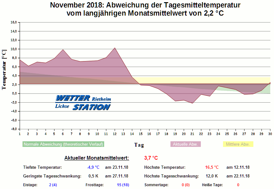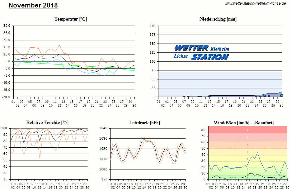 *************************************************** ************** T E M P E R A T U R ************** *************************************************** Mittlere Temperatur: 3,7 °C MIN Temperatur: -4,9 °C am 23.11.18 MAX Temperatur: 16,5 °C am 12.11.18 Mittlere MIN Temperatur: 0,8 °C Mittlere MAX Temperatur: 7,6 °C MIN Temp Delta : 0,5 K am 27.11.18 MAX Temp Delta : 12,0 K am 22.11.18 Mittl. Temp Delta: 6,8 K Starkfrosttage : 0 Eistage : 2 Frosttage : 15 Sommertage : 0 Heiße Tage : 0 *************************************************** ************ N I E D E R S C H L A G ************ *************************************************** Ges. Niederschlagsmenge: 15,0 mm MAX Niederschlag/Stunde: 1,2 mm am 30.11.18 MAX Niederschlag/Tag: 4,8 mm am 30.11.18 MAX Niederschlag in 24h: 4,8 mm am 30.11.18 MAX Niederschlag Rate: 5,2 mm/h am 11.11.18 Niederschlag an 9 Tagen Regentage (> 1mm) : 5 Regentage (> 3mm) : 1 Regentage (> 10mm) : 0 Regentage (> 20mm) : 0 *************************************************** ******************** W I N D ******************** *************************************************** Mittlere Windgeschwindigkeit: 1,1 m/s = 3,9 km/h Effektive Windrichtung: SO Maximale Windgeschwindigkeit: 12,1 m/s = 43,5 km/h aus SO am 19.11.18 Prozentuale Verteilung Windgeschwindigkeit: Bft_0 (bis 0,9 km/h) : 22.92 % Bft_1 (bis 5,6 km/h) : 48.65 % Bft_2 (bis 12 km/h) : 24.99 % Bft_3 (bis 20 km/h) : 3.39 % Bft_4 (bis 29 km/h) : 0.06 % Prozentuale Verteilung Windrichtung: N : 2.3 % NNO : 1.2 % NO : 2.9 % ONO : 1.7 % O : 6.8 % OSO : 38.7 % SO : 18.1 % SSO : 2.3 % S : 1.9 % SSW : 17.1 % SW : 4.2 % WSW : 0.5 % W : 0.1 % WNW : 0.3 % NW : 0.3 % NNW : 1.7 % *************************************************** *************** L U F T D R U C K *************** *************************************************** Mittlerer Luftdruck: 1017,5 hPa MIN Luftdruck: 1004,9 hPa am 26.11.18 MAX Luftdruck: 1031,5 hPa am 13.11.18 *************************************************** ************ L U F T F E U C H T E ************** *************************************************** Mittlere rel. Luftfeuchte: 92,2 % MIN rel. Luftfeuchte: 53,0 % am 12.11.18 MAX rel. Luftfeuchte: 100,0 %