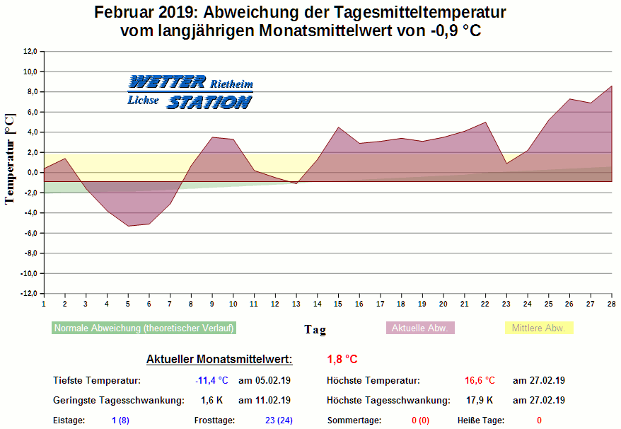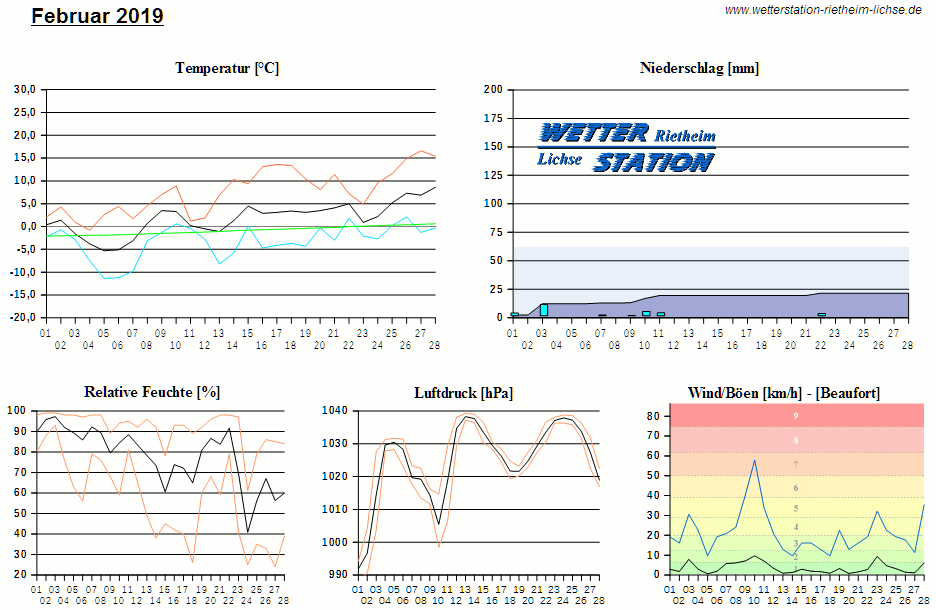 *************************************************** ************** T E M P E R A T U R ************** *************************************************** Mittlere Temperatur: 1,8 °C MIN Temperatur: -11,4 °C am 05.02.19 MAX Temperatur: 16,6 °C am 27.02.19 Mittlere MIN Temperatur: -3,2 °C Mittlere MAX Temperatur: 7,7 °C MIN Temp Delta : 1,6 K am 11.02.19 MAX Temp Delta : 17,9 K am 27.02.19 Mittl. Temp Delta: 10,9 K Starkfrosttage : 2 Eistage : 1 Frosttage : 23 Sommertage : 0 Heiße Tage : 0 *************************************************** ************ N I E D E R S C H L A G ************ *************************************************** Ges. Niederschlagsmenge: 21,6 mm MAX Niederschlag/Stunde: 1,8 mm am 03.02.19 MAX Niederschlag/Tag: 10,0 mm am 03.02.19 MAX Niederschlag in 24h: 10,0 mm am 03.02.19 MAX Niederschlag Rate: 7,4 mm/h am 10.02.19 Niederschlag an 7 Tagen Regentage (> 1mm) : 5 Regentage (> 3mm) : 2 Regentage (> 10mm) : 0 Regentage (> 20mm) : 0 *************************************************** ******************** W I N D ******************** *************************************************** Mittlere Windgeschwindigkeit: 1,0 m/s = 3,6 km/h Effektive Windrichtung: SSW Maximale Windgeschwindigkeit: 16,1 m/s = 57,9 km/h aus SSW am 10.02.19 Prozentuale Verteilung Windgeschwindigkeit: Bft_0 (bis 0,9 km/h) : 28.72 % Bft_1 (bis 5,6 km/h) : 45.13 % Bft_2 (bis 12 km/h) : 23.24 % Bft_3 (bis 20 km/h) : 2.69 % Bft_4 (bis 29 km/h) : 0.22 % Prozentuale Verteilung Windrichtung: N : 5.7 % NNO : 1.0 % NO : 0.5 % ONO : 0.5 % O : 2.7 % OSO : 14.1 % SO : 5.7 % SSO : 3.9 % S : 2.5 % SSW : 25.1 % SW : 9.8 % WSW : 7.4 % W : 4.7 % WNW : 3.2 % NW : 4.2 % NNW : 9.0 % *************************************************** *************** L U F T D R U C K *************** *************************************************** Mittlerer Luftdruck: 1024,7 hPa MIN Luftdruck: 988,7 hPa am 01.02.19 MAX Luftdruck: 1039,3 hPa am 13.02.19 *************************************************** ************ L U F T F E U C H T E ************** *************************************************** Mittlere rel. Luftfeuchte: 77,9 % MIN rel. Luftfeuchte: 24,0 % am 27.02.19 MAX rel. Luftfeuchte: 99,0 %