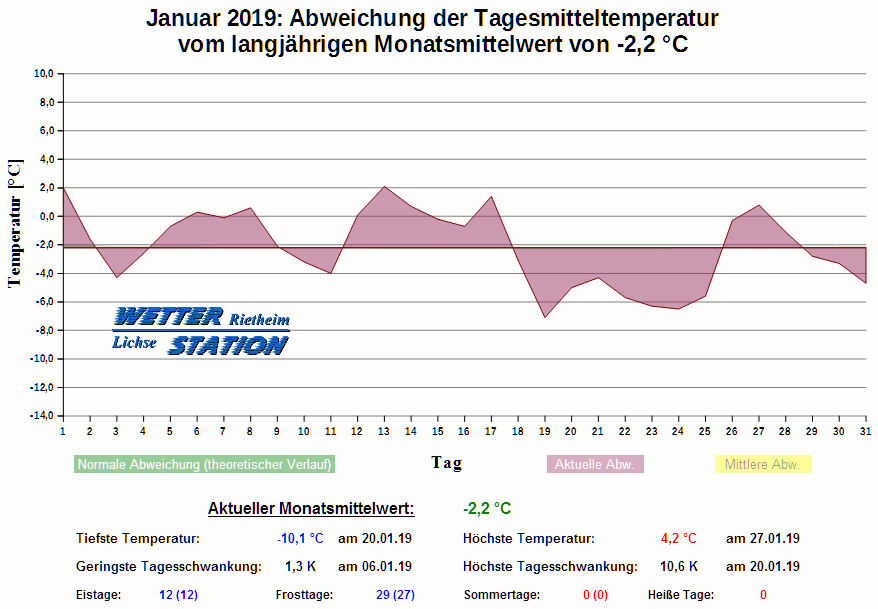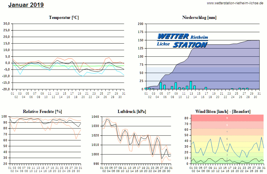 *************************************************** ************** T E M P E R A T U R ************** *************************************************** Mittlere Temperatur: -2,2 °C MIN Temperatur: -10,1 °C am 20.01.19 MAX Temperatur: 4,2 °C am 27.01.19 Mittlere MIN Temperatur: -4,5 °C Mittlere MAX Temperatur: 0,1 °C MIN Temp Delta : 1,3 K am 06.01.19 MAX Temp Delta : 10,6 K am 20.01.19 Mittl. Temp Delta: 4,6 K Starkfrosttage : 1 Eistage : 12 Frosttage : 29 Sommertage : 0 Heiße Tage : 0 *************************************************** ************ N I E D E R S C H L A G ************ *************************************************** Ges. Niederschlagsmenge: 150,0 mm MAX Niederschlag/Stunde: 6,2 mm am 13.01.19 MAX Niederschlag/Tag: 24,8 mm am 13.01.19 MAX Niederschlag in 24h: 27,4 mm am 06.01.19 MAX Niederschlag Rate: 55,2 mm/h am 13.01.19 Niederschlag an 21 Tagen Regentage (> 1mm) : 17 Regentage (> 3mm) : 14 Regentage (> 10mm) : 5 Regentage (> 20mm) : 3 *************************************************** ******************** W I N D ******************** *************************************************** Mittlere Windgeschwindigkeit: 1,4 m/s = 5,1 km/h Effektive Windrichtung: WSW Maximale Windgeschwindigkeit: 13,0 m/s = 46,7 km/h aus WNW am 13.01.19 Prozentuale Verteilung Windgeschwindigkeit: Bft_0 (bis 0,9 km/h) : 14.85 % Bft_1 (bis 5,6 km/h) : 42.32 % Bft_2 (bis 12 km/h) : 38.46 % Bft_3 (bis 20 km/h) : 4.25 % Bft_4 (bis 29 km/h) : 0.12 % Prozentuale Verteilung Windrichtung: N : 6.3 % NNO : 0.6 % NO : 0.1 % ONO : 0.1 % O : 0.4 % OSO : 2.1 % SO : 4.4 % SSO : 0.6 % S : 0.6 % SSW : 21.2 % SW : 15.6 % WSW : 11.8 % W : 7.8 % WNW : 5.6 % NW : 7.0 % NNW : 15.8 % *************************************************** *************** L U F T D R U C K *************** *************************************************** Mittlerer Luftdruck: 1016,8 hPa MIN Luftdruck: 990,8 hPa am 27.01.19 MAX Luftdruck: 1038,7 hPa am 03.01.19 *************************************************** ************ L U F T F E U C H T E ************** *************************************************** Mittlere rel. Luftfeuchte: 92,7 % MIN rel. Luftfeuchte: 62,0 % am 29.01.19 MAX rel. Luftfeuchte: 100,0 %