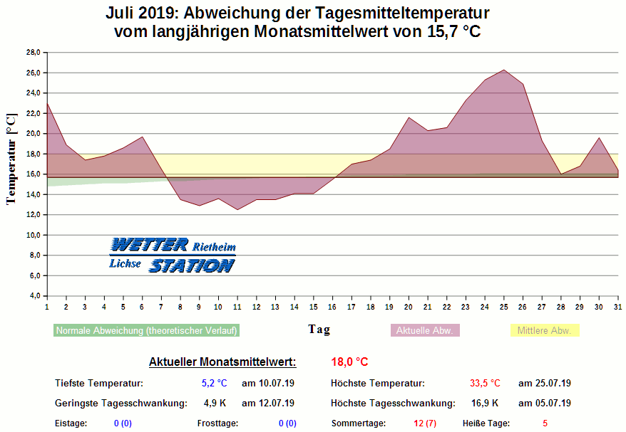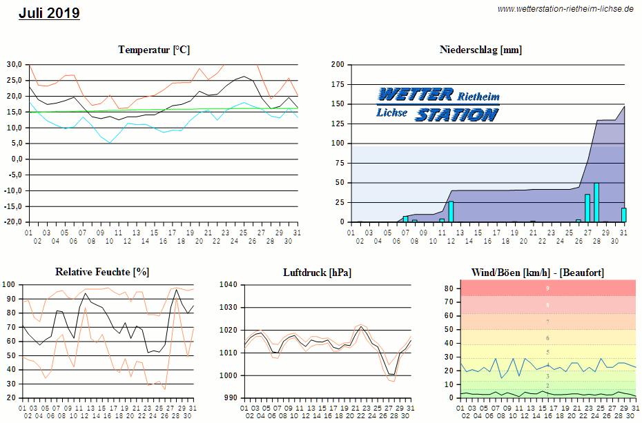 *************************************************** ************** T E M P E R A T U R ************** *************************************************** Mittlere Temperatur: 18,0 °C MIN Temperatur: 5,2 °C am 10.07.19 MAX Temperatur: 33,5 °C am 25.07.19 Mittlere MIN Temperatur: 12,4 °C Mittlere MAX Temperatur: 23,9 °C MIN Temp Delta : 4,9 K am 12.07.19 MAX Temp Delta : 16,9 K am 05.07.19 Mittl. Temp Delta: 11,5 K Starkfrosttage : 0 Eistage : 0 Frosttage : 0 Sommertage : 12 Heiße Tage : 5 *************************************************** ************ N I E D E R S C H L A G ************ *************************************************** Ges. Niederschlagsmenge: 147,6 mm MAX Niederschlag/Stunde: 18,2 mm am 28.07.19 MAX Niederschlag/Tag: 49,8 mm am 28.07.19 MAX Niederschlag in 24h: 69,4 mm am 28.07.19 MAX Niederschlag Rate: 83,4 mm/h am 31.07.19 Niederschlag an 13 Tagen Regentage (> 1mm) : 8 Regentage (> 3mm) : 6 Regentage (> 10mm) : 4 Regentage (> 20mm) : 3 *************************************************** ******************** W I N D ******************** *************************************************** Mittlere Windgeschwindigkeit: 0,8 m/s = 3,0 km/h Effektive Windrichtung: NNW Maximale Windgeschwindigkeit: 8,1 m/s = 29,0 km/h aus NNW am 07.07.19 Prozentuale Verteilung Windgeschwindigkeit: Bft_0 (bis 0,9 km/h) : 29.46 % Bft_1 (bis 5,6 km/h) : 51.57 % Bft_2 (bis 12 km/h) : 18.83 % Bft_3 (bis 20 km/h) : 0.15 % Prozentuale Verteilung Windrichtung: N : 17.8 % NNO : 9.4 % NO : 7.2 % ONO : 1.5 % O : 2.8 % OSO : 6.3 % SO : 1.0 % SSO : 0.5 % S : 0.8 % SSW : 11.1 % SW : 2.2 % WSW : 2.5 % W : 2.2 % WNW : 4.9 % NW : 7.0 % NNW : 22.8 % *************************************************** *************** L U F T D R U C K *************** *************************************************** Mittlerer Luftdruck: 1013,7 hPa MIN Luftdruck: 997,3 hPa am 28.07.19 MAX Luftdruck: 1022,6 hPa am 22.07.19 *************************************************** ************ L U F T F E U C H T E ************** *************************************************** Mittlere rel. Luftfeuchte: 72,4 % MIN rel. Luftfeuchte: 26,0 % am 26.07.19 MAX rel. Luftfeuchte: 98,0 %