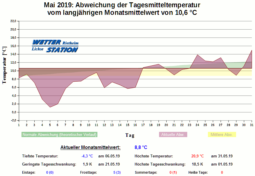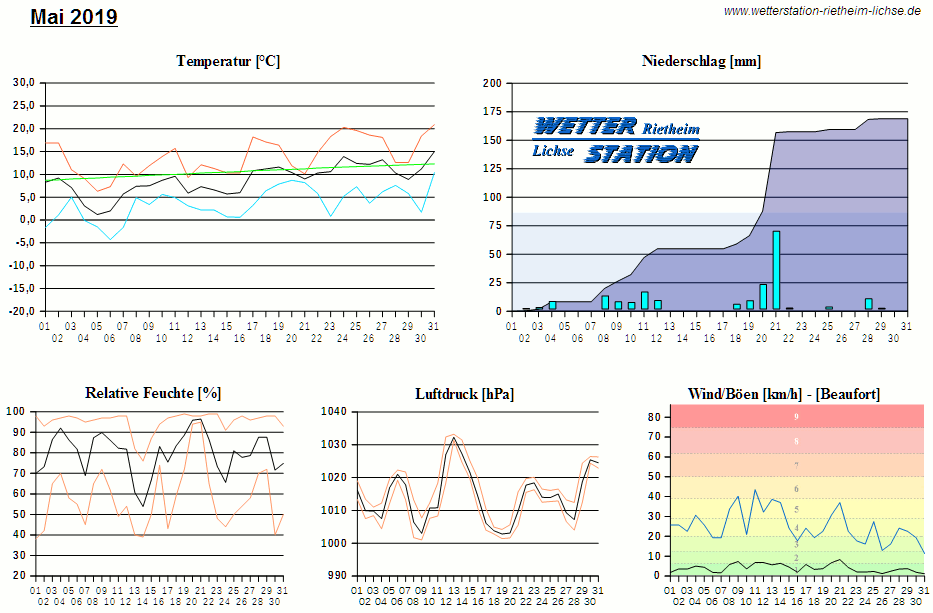 *************************************************** ************** T E M P E R A T U R ************** *************************************************** Mittlere Temperatur: 8,8 °C MIN Temperatur: -4,3 °C am 06.05.19 MAX Temperatur: 20,9 °C am 31.05.19 Mittlere MIN Temperatur: 3,7 °C Mittlere MAX Temperatur: 13,9 °C MIN Temp Delta : 1,9 K am 21.05.19 MAX Temp Delta : 18,5 K am 01.05.19 Mittl. Temp Delta: 10,3 K Starkfrosttage : 0 Eistage : 0 Frosttage : 5 Sommertage : 0 Heiße Tage : 0 *************************************************** ************ N I E D E R S C H L A G ************ *************************************************** Ges. Niederschlagsmenge: 169,0 mm MAX Niederschlag/Stunde: 10,2 mm am 20.05.19 MAX Niederschlag/Tag: 68,8 mm am 21.05.19 MAX Niederschlag in 24h: 78,4 mm am 21.05.19 MAX Niederschlag Rate: 48,6 mm/h am 20.05.19 Niederschlag an 16 Tagen Regentage (> 1mm) : 13 Regentage (> 3mm) : 11 Regentage (> 10mm) : 4 Regentage (> 20mm) : 2 *************************************************** ******************** W I N D ******************** *************************************************** Mittlere Windgeschwindigkeit: 1,1 m/s = 4,0 km/h Effektive Windrichtung: NNW Maximale Windgeschwindigkeit: 12,1 m/s = 43,5 km/h aus SW am 11.05.19 Prozentuale Verteilung Windgeschwindigkeit: Bft_0 (bis 0,9 km/h) : 23.63 % Bft_1 (bis 5,6 km/h) : 46.71 % Bft_2 (bis 12 km/h) : 27.59 % Bft_3 (bis 20 km/h) : 2.07 % Prozentuale Verteilung Windrichtung: N : 14.2 % NNO : 6.8 % NO : 10.2 % ONO : 2.0 % O : 1.5 % OSO : 6.5 % SO : 4.1 % SSO : 0.9 % S : 1.0 % SSW : 9.3 % SW : 4.0 % WSW : 4.1 % W : 3.6 % WNW : 4.1 % NW : 5.9 % NNW : 21.6 % *************************************************** *************** L U F T D R U C K *************** *************************************************** Mittlerer Luftdruck: 1014,3 hPa MIN Luftdruck: 1001,0 hPa am 09.05.19 MAX Luftdruck: 1033,2 hPa am 13.05.19 *************************************************** ************ L U F T F E U C H T E ************** *************************************************** Mittlere rel. Luftfeuchte: 79,8 % MIN rel. Luftfeuchte: 38,0 % am 01.05.19 MAX rel. Luftfeuchte: 99,0 %