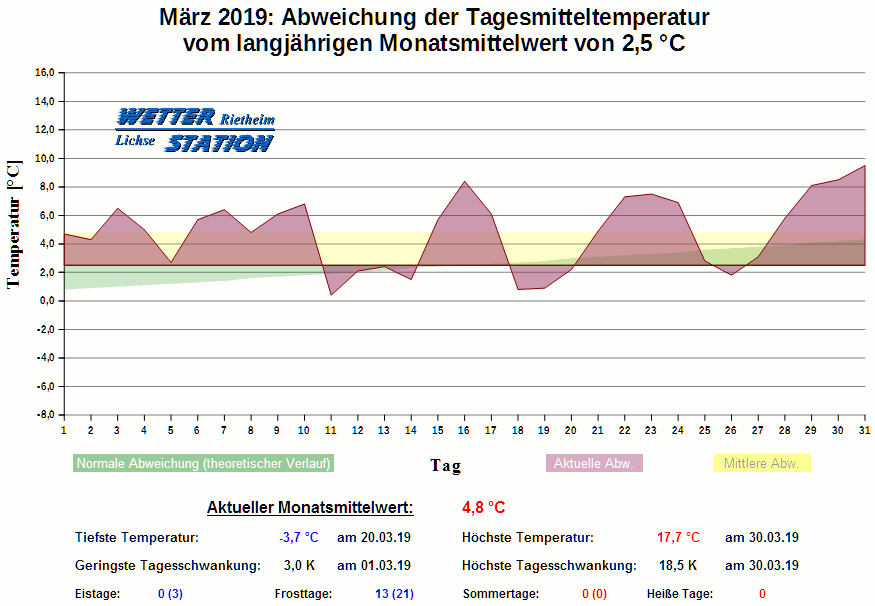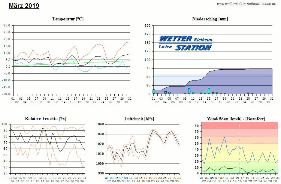 *************************************************** ************** T E M P E R A T U R ************** *************************************************** Mittlere Temperatur: 4,8 °C MIN Temperatur: -3,7 °C am 20.03.19 MAX Temperatur: 17,7 °C am 30.03.19 Mittlere MIN Temperatur: 0,5 °C Mittlere MAX Temperatur: 9,8 °C MIN Temp Delta : 3,0 K am 01.03.19 MAX Temp Delta : 18,5 K am 30.03.19 Mittl. Temp Delta: 9,3 K Starkfrosttage : 0 Eistage : 0 Frosttage : 13 Sommertage : 0 Heiße Tage : 0 *************************************************** ************ N I E D E R S C H L A G ************ *************************************************** Ges. Niederschlagsmenge: 73,8 mm MAX Niederschlag/Stunde: 3,6 mm am 10.03.19 MAX Niederschlag/Tag: 15,0 mm am 15.03.19 MAX Niederschlag in 24h: 19,0 mm am 15.03.19 MAX Niederschlag Rate: 11,2 mm/h am 01.03.19 Niederschlag an 16 Tagen Regentage (> 1mm) : 12 Regentage (> 3mm) : 8 Regentage (> 10mm) : 3 Regentage (> 20mm) : 0 *************************************************** ******************** W I N D ******************** *************************************************** Mittlere Windgeschwindigkeit: 1,7 m/s = 6,0 km/h Effektive Windrichtung: SW Maximale Windgeschwindigkeit: 17,0 m/s = 61,2 km/h aus SW am 10.03.19 Prozentuale Verteilung Windgeschwindigkeit: Bft_0 (bis 0,9 km/h) : 17.35 % Bft_1 (bis 5,6 km/h) : 32.65 % Bft_2 (bis 12 km/h) : 39.38 % Bft_3 (bis 20 km/h) : 10.34 % Bft_4 (bis 29 km/h) : 0.28 % Prozentuale Verteilung Windrichtung: N : 3.1 % NNO : 1.1 % NO : 2.9 % ONO : 1.4 % O : 2.9 % OSO : 7.8 % SO : 2.6 % SSO : 0.6 % S : 0.5 % SSW : 17.4 % SW : 22.1 % WSW : 18.3 % W : 8.6 % WNW : 3.0 % NW : 3.1 % NNW : 4.6 % *************************************************** *************** L U F T D R U C K *************** *************************************************** Mittlerer Luftdruck: 1019,3 hPa MIN Luftdruck: 997,0 hPa am 07.03.19 MAX Luftdruck: 1035,1 hPa am 20.03.19 *************************************************** ************ L U F T F E U C H T E ************** *************************************************** Mittlere rel. Luftfeuchte: 75,6 % MIN rel. Luftfeuchte: 31,0 % am 30.03.19 MAX rel. Luftfeuchte: 98,0 %