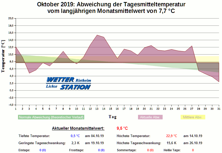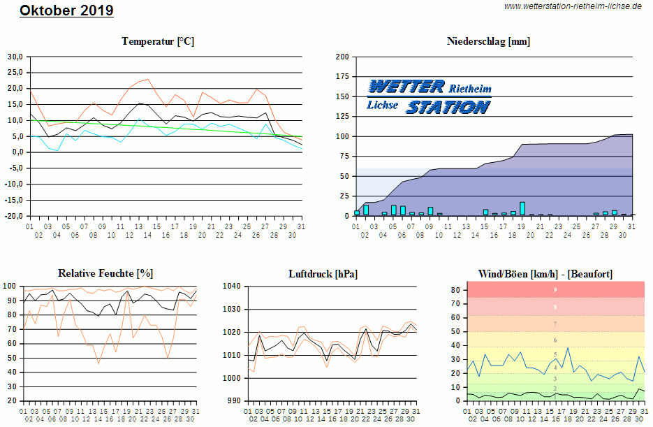 *************************************************** ************** T E M P E R A T U R ************** *************************************************** Mittlere Temperatur: 9,5 °C MIN Temperatur: 0,5 °C am 04.10.19 MAX Temperatur: 22,9 °C am 14.10.19 Mittlere MIN Temperatur: 5,9 °C Mittlere MAX Temperatur: 14,3 °C MIN Temp Delta : 2,3 K am 19.10.19 MAX Temp Delta : 15,6 K am 26.10.19 Mittl. Temp Delta: 8,5 K Starkfrosttage : 0 Eistage : 0 Frosttage : 0 Sommertage : 0 Heiße Tage : 0 *************************************************** ************ N I E D E R S C H L A G ************ *************************************************** Ges. Niederschlagsmenge: 102,8 mm MAX Niederschlag/Stunde: 4,4 mm am 06.10.19 MAX Niederschlag/Tag: 16,0 mm am 19.10.19 MAX Niederschlag in 24h: 20,0 mm am 19.10.19 MAX Niederschlag Rate: 36,2 mm/h am 06.10.19 Niederschlag an 22 Tagen Regentage (> 1mm) : 17 Regentage (> 3mm) : 11 Regentage (> 10mm) : 4 Regentage (> 20mm) : 0 *************************************************** ******************** W I N D ******************** *************************************************** Mittlere Windgeschwindigkeit: 1,1 m/s = 4,0 km/h Effektive Windrichtung: SSW Maximale Windgeschwindigkeit: 10,7 m/s = 38,6 km/h aus S am 18.10.19 Prozentuale Verteilung Windgeschwindigkeit: Bft_0 (bis 0,9 km/h) : 20.44 % Bft_1 (bis 5,6 km/h) : 48.92 % Bft_2 (bis 12 km/h) : 28.75 % Bft_3 (bis 20 km/h) : 1.87 % Bft_4 (bis 29 km/h) : 0.01 % Prozentuale Verteilung Windrichtung: N : 4.1 % NNO : 1.3 % NO : 0.6 % ONO : 0.5 % O : 1.4 % OSO : 17.6 % SO : 2.5 % SSO : 2.3 % S : 2.5 % SSW : 46.9 % SW : 5.3 % WSW : 3.1 % W : 1.8 % WNW : 2.3 % NW : 2.5 % NNW : 5.1 % *************************************************** *************** L U F T D R U C K *************** *************************************************** Mittlerer Luftdruck: 1015,4 hPa MIN Luftdruck: 1002,8 hPa am 02.10.19 MAX Luftdruck: 1024,8 hPa am 30.10.19 *************************************************** ************ L U F T F E U C H T E ************** *************************************************** Mittlere rel. Luftfeuchte: 90,1 % MIN rel. Luftfeuchte: 46,0 % am 14.10.19 MAX rel. Luftfeuchte: 100,0 %