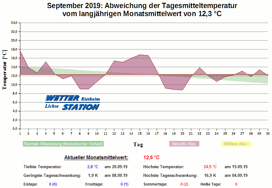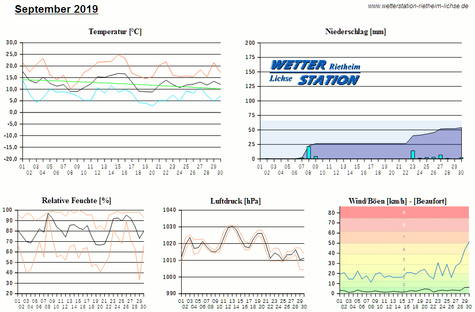 *************************************************** ************** T E M P E R A T U R ************** *************************************************** Mittlere Temperatur: 12,6 °C MIN Temperatur: 2,8 °C am 20.09.19 MAX Temperatur: 24,9 °C am 15.09.19 Mittlere MIN Temperatur: 7,5 °C Mittlere MAX Temperatur: 18,0 °C MIN Temp Delta : 1,9 K am 08.09.19 MAX Temp Delta : 16,9 K am 04.09.19 Mittl. Temp Delta: 10,5 K Starkfrosttage : 0 Eistage : 0 Frosttage : 0 Sommertage : 0 Heiße Tage : 0 *************************************************** ************ N I E D E R S C H L A G ************ *************************************************** Ges. Niederschlagsmenge: 54,0 mm MAX Niederschlag/Stunde: 3,6 mm am 08.09.19 MAX Niederschlag/Tag: 20,8 mm am 08.09.19 MAX Niederschlag in 24h: 22,0 mm am 09.09.19 MAX Niederschlag Rate: 23,4 mm/h am 08.09.19 Niederschlag an 11 Tagen Regentage (> 1mm) : 8 Regentage (> 3mm) : 4 Regentage (> 10mm) : 2 Regentage (> 20mm) : 1 *************************************************** ******************** W I N D ******************** *************************************************** Mittlere Windgeschwindigkeit: 0,8 m/s = 2,9 km/h Effektive Windrichtung: WNW Maximale Windgeschwindigkeit: 14,3 m/s = 51,5 km/h aus WSW am 30.09.19 Prozentuale Verteilung Windgeschwindigkeit: Bft_0 (bis 0,9 km/h) : 30.80 % Bft_1 (bis 5,6 km/h) : 51.97 % Bft_2 (bis 12 km/h) : 16.70 % Bft_3 (bis 20 km/h) : 0.53 % Prozentuale Verteilung Windrichtung: N : 10.7 % NNO : 4.7 % NO : 4.7 % ONO : 1.7 % O : 3.8 % OSO : 11.2 % SO : 0.8 % SSO : 0.8 % S : 1.7 % SSW : 18.7 % SW : 7.1 % WSW : 5.9 % W : 4.4 % WNW : 4.7 % NW : 5.8 % NNW : 13.0 % *************************************************** *************** L U F T D R U C K *************** *************************************************** Mittlerer Luftdruck: 1018,5 hPa MIN Luftdruck: 1004,4 hPa am 30.09.19 MAX Luftdruck: 1031,0 hPa am 13.09.19 *************************************************** ************ L U F T F E U C H T E ************** *************************************************** Mittlere rel. Luftfeuchte: 81,0 % MIN rel. Luftfeuchte: 33,0 % am 29.09.19 MAX rel. Luftfeuchte: 100,0 %