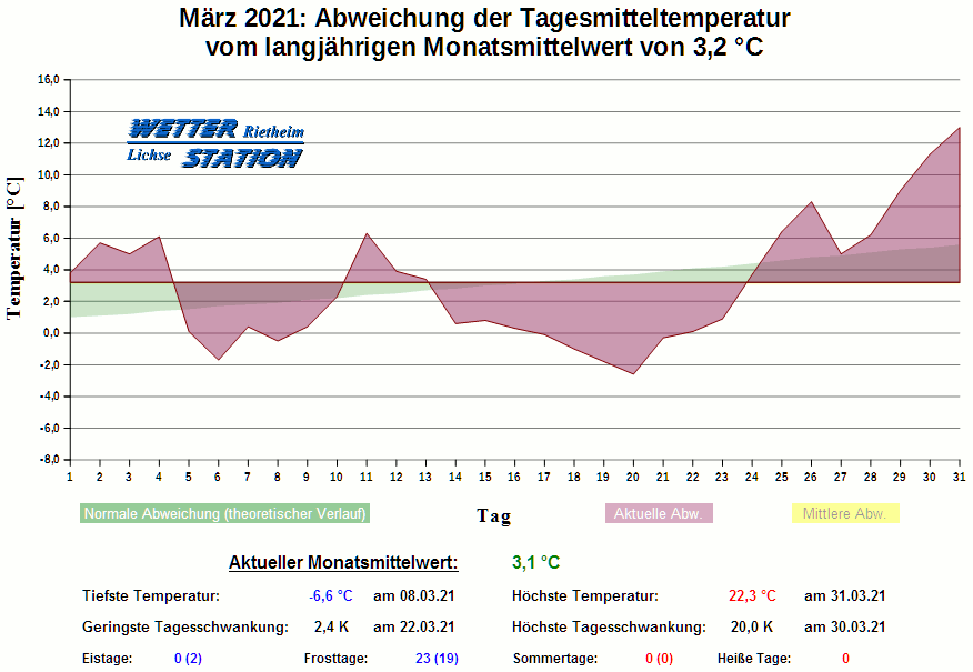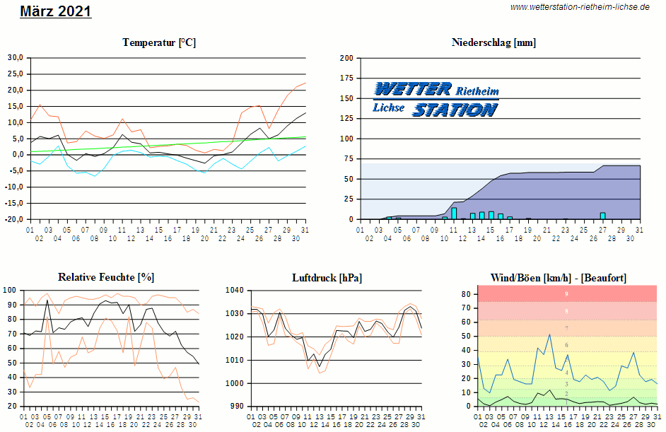 *************************************************** ************** T E M P E R A T U R ************** *************************************************** Mittlere Temperatur: 3,1 °C MIN Temperatur: -6,6 °C am 08.03.21 MAX Temperatur: 22,3 °C am 31.03.21 Mittlere MIN Temperatur: -1,6 °C Mittlere MAX Temperatur: 8,3 °C MIN Temp Delta : 2,4 K am 22.03.21 MAX Temp Delta : 20,0 K am 30.03.21 Mittl. Temp Delta: 9,9 K Starkfrosttage : 0 Eistage : 0 Frosttage : 23 Sommertage : 0 Heiße Tage : 0 *************************************************** ************ N I E D E R S C H L A G ************ *************************************************** Ges. Niederschlagsmenge: 66,6 mm MAX Niederschlag/Stunde: 4,8 mm am 11.03.21 MAX Niederschlag/Tag: 14,2 mm am 11.03.21 MAX Niederschlag in 24h: 14,4 mm am 12.03.21 MAX Niederschlag Rate: 14,0 mm/h am 27.03.21 Niederschlag an 13 Tagen Regentage (> 1mm) : 10 Regentage (> 3mm) : 6 Regentage (> 10mm) : 1 Regentage (> 20mm) : 0 *************************************************** ******************** W I N D ******************** *************************************************** Mittlere Windgeschwindigkeit: 1,1 m/s = 3,9 km/h Effektive Windrichtung: WSW Maximale Windgeschwindigkeit: 14,3 m/s = 51,5 km/h aus SSW am 13.03.21 Prozentuale Verteilung Windgeschwindigkeit: Bft_0 (bis 0,9 km/h) : 25.87 % Bft_1 (bis 5,6 km/h) : 46.70 % Bft_2 (bis 12 km/h) : 23.88 % Bft_3 (bis 20 km/h) : 3.22 % Bft_4 (bis 29 km/h) : 0.33 % Prozentuale Verteilung Windrichtung: N : 9.2 % NNO : 4.1 % NO : 3.3 % ONO : 0.9 % O : 1.8 % OSO : 10.7 % SO : 2.3 % SSO : 0.5 % S : 1.7 % SSW : 19.2 % SW : 11.5 % WSW : 8.0 % W : 5.6 % WNW : 4.4 % NW : 6.2 % NNW : 10.9 % *************************************************** *************** L U F T D R U C K *************** *************************************************** Mittlerer Luftdruck: 1022,8 hPa MIN Luftdruck: 1004,4 hPa am 13.03.21 MAX Luftdruck: 1034,4 hPa am 29.03.21 *************************************************** ************ L U F T F E U C H T E ************** *************************************************** Mittlere rel. Luftfeuchte: 76,5 % MIN rel. Luftfeuchte: 23,0 % am 31.03.21 MAX rel. Luftfeuchte: 98,0 %