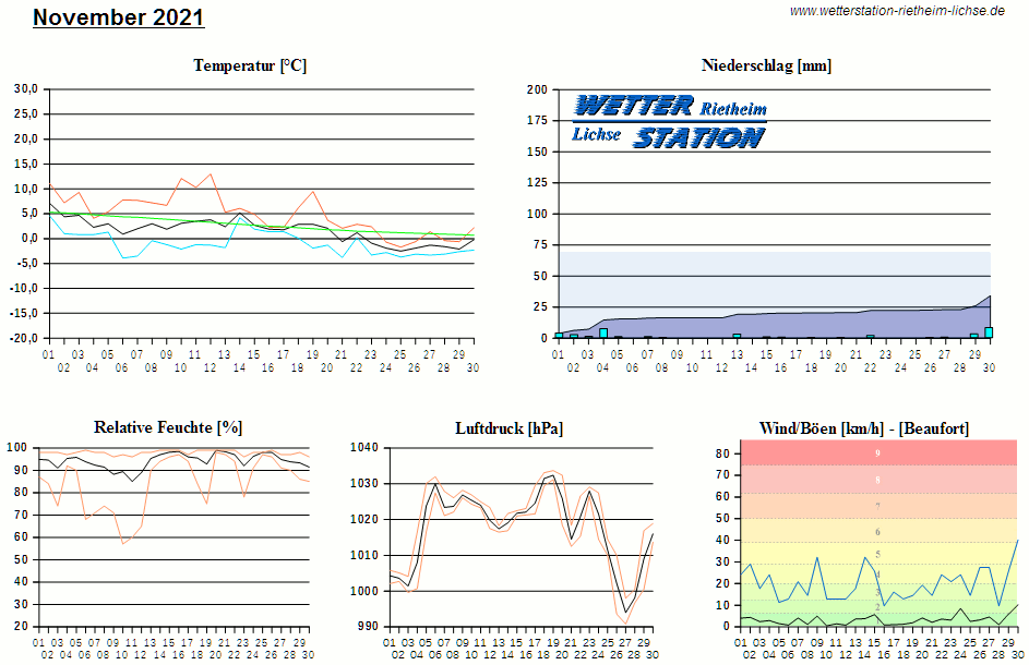*************************************************** ************** T E M P E R A T U R ************** *************************************************** Mittlere Temperatur: 1,7 °C MIN Temperatur: -3,9 °C am 06.11.21 MAX Temperatur: 13,0 °C am 12.11.21 Mittlere MIN Temperatur: -1,0 °C Mittlere MAX Temperatur: 5,0 °C MIN Temp Delta : 0,9 K am 16.11.21 MAX Temp Delta : 14,3 K am 12.11.21 Mittl. Temp Delta: 5,9 K Starkfrosttage : 0 Eistage : 5 Frosttage : 19 Sommertage : 0 Heiße Tage : 0 *************************************************** ************ N I E D E R S C H L A G ************ *************************************************** Ges. Niederschlagsmenge: 34,2 mm MAX Niederschlag/Stunde: 1,6 mm am 30.11.21 MAX Niederschlag/Tag: 8,2 mm am 30.11.21 MAX Niederschlag in 24h: 8,4 mm am 30.11.21 MAX Niederschlag Rate: 20,8 mm/h am 02.11.21 Niederschlag an 17 Tagen Regentage (> 1mm) : 7 Regentage (> 3mm) : 3 Regentage (> 10mm) : 0 Regentage (> 20mm) : 0 *************************************************** ******************** W I N D ******************** *************************************************** Mittlere Windgeschwindigkeit: 0,9 m/s = 3,2 km/h Effektive Windrichtung: S Maximale Windgeschwindigkeit: 11,2 m/s = 40,2 km/h aus W am 30.11.21 Prozentuale Verteilung Windgeschwindigkeit: Bft_0 (bis 0,9 km/h) : 32.86 % Bft_1 (bis 5,6 km/h) : 44.44 % Bft_2 (bis 12 km/h) : 20.98 % Bft_3 (bis 20 km/h) : 1.71 % Prozentuale Verteilung Windrichtung: N : 5.8 % NNO : 3.9 % NO : 4.7 % ONO : 2.7 % O : 5.1 % OSO : 14.6 % SO : 5.2 % SSO : 1.6 % S : 4.1 % SSW : 26.4 % SW : 10.6 % WSW : 5.3 % W : 1.8 % WNW : 1.6 % NW : 2.0 % NNW : 4.4 % *************************************************** *************** L U F T D R U C K *************** *************************************************** Mittlerer Luftdruck: 1017,5 hPa MIN Luftdruck: 990,8 hPa am 27.11.21 MAX Luftdruck: 1033,7 hPa am 19.11.21 *************************************************** ************ L U F T F E U C H T E ************** *************************************************** Mittlere rel. Luftfeuchte: 94,2 % MIN rel. Luftfeuchte: 57,0 % am 10.11.21 MAX rel. Luftfeuchte: 99,0 % %