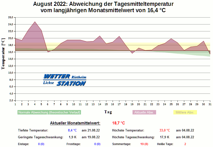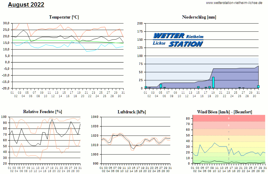 *************************************************** ************** T E M P E R A T U R ************** *************************************************** Mittlere Temperatur: 18,7 °C MIN Temperatur: 8,4 °C am 21.08.22 MAX Temperatur: 33,0 °C am 04.08.22 Mittlere MIN Temperatur: 12,7 °C Mittlere MAX Temperatur: 25,1 °C MIN Temp Delta : 1,9 K am 19.08.22 MAX Temp Delta : 17,9 K am 04.08.22 Mittl. Temp Delta: 12,5 K Starkfrosttage : 0 Eistage : 0 Frosttage : 0 Sommertage : 19 Heiße Tage : 2 *************************************************** ************ N I E D E R S C H L A G ************ *************************************************** Ges. Niederschlagsmenge: 69,4 mm MAX Niederschlag/Stunde: 8,6 mm am 19.08.22 MAX Niederschlag/Tag: 33,2 mm am 19.08.22 MAX Niederschlag in 24h: 35,2 mm am 19.08.22 MAX Niederschlag Rate: 115,2 mm/h am 05.08.22 Niederschlag an 11 Tagen Regentage (> 1mm) : 9 Regentage (> 3mm) : 6 Regentage (> 10mm) : 2 Regentage (> 20mm) : 1 *************************************************** ******************** W I N D ******************** *************************************************** Mittlere Windgeschwindigkeit: 0,7 m/s = 2,4 km/h Effektive Windrichtung: ONO Maximale Windgeschwindigkeit: 10,3 m/s = 37,0 km/h aus OSO am 10.08.22 Prozentuale Verteilung Windgeschwindigkeit: Bft_0 (bis 0,9 km/h) : 44.24 % Bft_1 (bis 5,6 km/h) : 40.12 % Bft_2 (bis 12 km/h) : 15.10 % Bft_3 (bis 20 km/h) : 0.54 % Prozentuale Verteilung Windrichtung: N : 14.9 % NNO : 3.8 % NO : 9.9 % ONO : 7.0 % O : 7.3 % OSO : 36.7 % SO : 0.4 % SSO : 0.2 % S : 0.9 % SSW : 4.5 % SW : 0.5 % WSW : 0.7 % W : 0.3 % WNW : 2.0 % NW : 1.7 % NNW : 9.4 % *************************************************** *************** L U F T D R U C K *************** *************************************************** Mittlerer Luftdruck: 1015,0 hPa MIN Luftdruck: 1004,1 hPa am 15.08.22 MAX Luftdruck: 1022,8 hPa am 09.08.22 *************************************************** ************ L U F T F E U C H T E ************** *************************************************** Mittlere rel. Luftfeuchte: 70,3 % MIN rel. Luftfeuchte: 26,0 % am 14.08.22 MAX rel. Luftfeuchte: 98,0 %