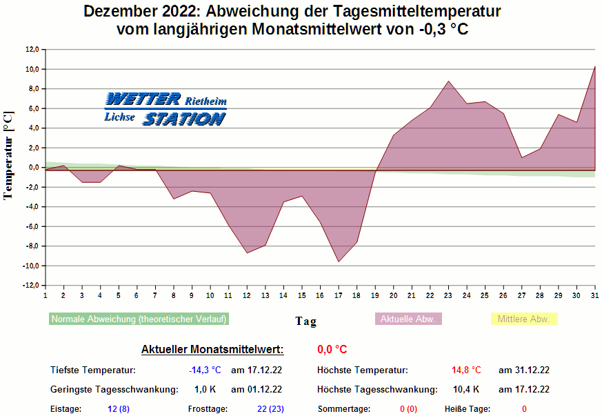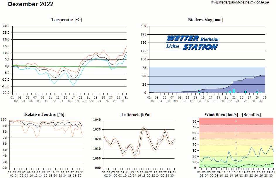 *************************************************** ************** T E M P E R A T U R ************** *************************************************** Mittlere Temperatur: 0,0 °C MIN Temperatur: -14,3 °C am 17.12.22 MAX Temperatur: 14,8 °C am 31.12.22 Mittlere MIN Temperatur: -2,5 °C Mittlere MAX Temperatur: 2,6 °C MIN Temp Delta : 1,0 K am 01.12.22 MAX Temp Delta : 10,4 K am 17.12.22 Mittl. Temp Delta: 5,1 K Starkfrosttage : 3 Eistage : 12 Frosttage : 22 Sommertage : 0 Heiße Tage : 0 *************************************************** ************ N I E D E R S C H L A G ************ *************************************************** Ges. Niederschlagsmenge: 53,0 mm MAX Niederschlag/Stunde: 6,4 mm am 23.12.22 MAX Niederschlag/Tag: 13,0 mm am 23.12.22 MAX Niederschlag in 24h: 13,8 mm am 23.12.22 MAX Niederschlag Rate: 35,2 mm/h am 23.12.22 Niederschlag an 19 Tagen Regentage (> 1mm) : 12 Regentage (> 3mm) : 5 Regentage (> 10mm) : 1 Regentage (> 20mm) : 0 *************************************************** ******************** W I N D ******************** *************************************************** Mittlere Windgeschwindigkeit: 0,9 m/s = 3,4 km/h Effektive Windrichtung: SSW Maximale Windgeschwindigkeit: 10,7 m/s = 38,6 km/h aus SW am 30.12.22 Prozentuale Verteilung Windgeschwindigkeit: Bft_0 (bis 0,9 km/h) : 34.78 % Bft_1 (bis 5,6 km/h) : 40.28 % Bft_2 (bis 12 km/h) : 22.67 % Bft_3 (bis 20 km/h) : 2.26 % Bft_4 (bis 29 km/h) : 0.01 % Prozentuale Verteilung Windrichtung: N : 4.7 % NNO : 1.5 % NO : 0.6 % ONO : 0.3 % O : 0.5 % OSO : 7.0 % SO : 5.4 % SSO : 2.0 % S : 3.0 % SSW : 61.1 % SW : 5.9 % WSW : 1.7 % W : 0.7 % WNW : 3.3 % NW : 0.6 % NNW : 1.9 % *************************************************** *************** L U F T D R U C K *************** *************************************************** Mittlerer Luftdruck: 1016,5 hPa MIN Luftdruck: 1000,2 hPa am 14.12.22 MAX Luftdruck: 1033,2 hPa am 18.12.22 *************************************************** ************ L U F T F E U C H T E ************** *************************************************** Mittlere rel. Luftfeuchte: 94,1 % MIN rel. Luftfeuchte: 71,0 % am 12.12.22 MAX rel. Luftfeuchte: 99,0 %