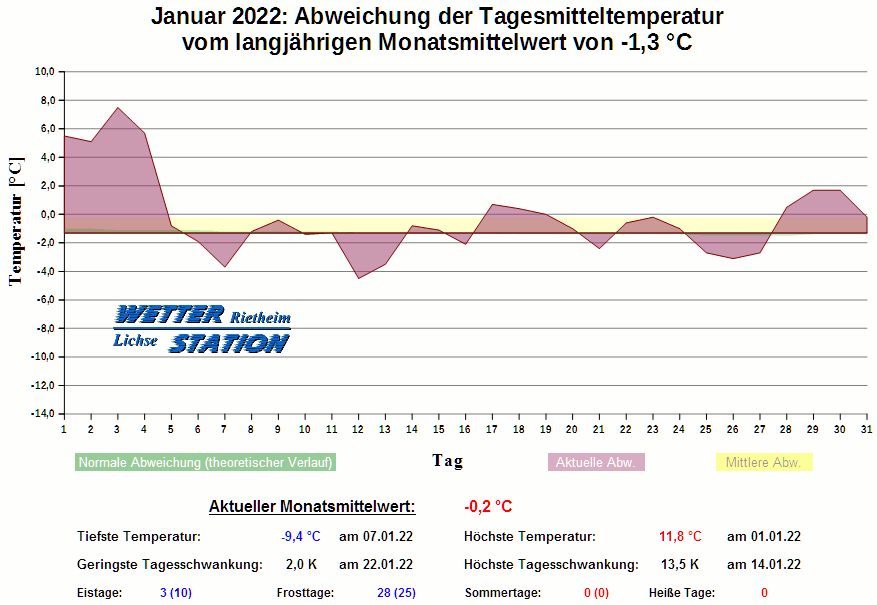 *************************************************** ************** T E M P E R A T U R ************** *************************************************** Mittlere Temperatur: -0,2 °C MIN Temperatur: -9,4 °C am 07.01.22 MAX Temperatur: 11,8 °C am 01.01.22 Mittlere MIN Temperatur: -3,6 °C Mittlere MAX Temperatur: 3,1 °C MIN Temp Delta : 2,0 K am 22.01.22 MAX Temp Delta : 13,5 K am 14.01.22 Mittl. Temp Delta: 6,7 K Starkfrosttage : 0 Eistage : 3 Frosttage : 28 Sommertage : 0 Heiße Tage : 0 *************************************************** ************ N I E D E R S C H L A G ************ *************************************************** Ges. Niederschlagsmenge: 52,2 mm MAX Niederschlag/Stunde: 2,0 mm am 04.01.22 MAX Niederschlag/Tag: 17,4 mm am 04.01.22 MAX Niederschlag in 24h: 18,4 mm am 05.01.22 MAX Niederschlag Rate: 8,0 mm/h am 04.01.22 Niederschlag an 16 Tagen Regentage (> 1mm) : 10 Regentage (> 3mm) : 4 Regentage (> 10mm) : 2 Regentage (> 20mm) : 0 *************************************************** ******************** W I N D ******************** *************************************************** Mittlere Windgeschwindigkeit: 1,2 m/s = 4,5 km/h Effektive Windrichtung: WSW Maximale Windgeschwindigkeit: 12,1 m/s = 43,5 km/h aus S am 04.01.22 Prozentuale Verteilung Windgeschwindigkeit: Bft_0 (bis 0,9 km/h) : 19.35 % Bft_1 (bis 5,6 km/h) : 43.54 % Bft_2 (bis 12 km/h) : 34.46 % Bft_3 (bis 20 km/h) : 2.63 % Bft_4 (bis 29 km/h) : 0.01 % Prozentuale Verteilung Windrichtung: N : 5.1 % NNO : 1.7 % NO : 1.1 % ONO : 0.7 % O : 1.3 % OSO : 5.6 % SO : 3.0 % SSO : 0.9 % S : 3.8 % SSW : 23.4 % SW : 13.1 % WSW : 12.9 % W : 7.2 % WNW : 6.4 % NW : 6.1 % NNW : 7.9 % *************************************************** *************** L U F T D R U C K *************** *************************************************** Mittlerer Luftdruck: 1026,9 hPa MIN Luftdruck: 997,4 hPa am 04.01.22 MAX Luftdruck: 1043,7 hPa am 13.01.22 *************************************************** ************ L U F T F E U C H T E ************** *************************************************** Mittlere rel. Luftfeuchte: 90,0 % MIN rel. Luftfeuchte: 59,0 % am 14.01.22 MAX rel. Luftfeuchte: 98,0 %