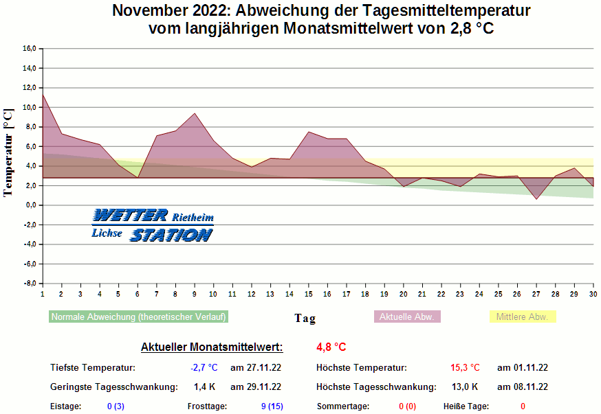 *************************************************** ************** T E M P E R A T U R ************** *************************************************** Mittlere Temperatur: 4,8 °C MIN Temperatur: -2,7 °C am 27.11.22 MAX Temperatur: 15,3 °C am 01.11.22 Mittlere MIN Temperatur: 1,3 °C Mittlere MAX Temperatur: 8,6 °C MIN Temp Delta : 1,4 K am 29.11.22 MAX Temp Delta : 13,0 K am 08.11.22 Mittl. Temp Delta: 7,3 K Starkfrosttage : 0 Eistage : 0 Frosttage : 9 Sommertage : 0 Heiße Tage : 0 *************************************************** ************ N I E D E R S C H L A G ************ *************************************************** Ges. Niederschlagsmenge: 67,4 mm MAX Niederschlag/Stunde: 2,6 mm am 04.11.22 MAX Niederschlag/Tag: 13,6 mm am 18.11.22 MAX Niederschlag in 24h: 17,0 mm am 18.11.22 MAX Niederschlag Rate: 14,2 mm/h am 04.11.22 Niederschlag an 21 Tagen Regentage (> 1mm) : 14 Regentage (> 3mm) : 8 Regentage (> 10mm) : 1 Regentage (> 20mm) : 0 *************************************************** ******************** W I N D ******************** *************************************************** Mittlere Windgeschwindigkeit: 0,6 m/s = 2,1 km/h Effektive Windrichtung: SSW Maximale Windgeschwindigkeit: 10,7 m/s = 38,6 km/h aus SW am 17.11.22 Prozentuale Verteilung Windgeschwindigkeit: Bft_0 (bis 0,9 km/h) : 48.25 % Bft_1 (bis 5,6 km/h) : 38.96 % Bft_2 (bis 12 km/h) : 12.40 % Bft_3 (bis 20 km/h) : 0.39 % Prozentuale Verteilung Windrichtung: N : 5.1 % NNO : 0.3 % NO : 0.2 % ONO : 0.2 % O : 0.3 % OSO : 3.5 % SO : 4.9 % SSO : 1.8 % S : 5.0 % SSW : 57.2 % SW : 8.9 % WSW : 4.8 % W : 2.5 % WNW : 2.9 % NW : 1.3 % NNW : 1.1 % *************************************************** *************** L U F T D R U C K *************** *************************************************** Mittlerer Luftdruck: 1016,1 hPa MIN Luftdruck: 997,0 hPa am 17.11.22 MAX Luftdruck: 1035,1 hPa am 11.11.22 *************************************************** ************ L U F T F E U C H T E ************** *************************************************** Mittlere rel. Luftfeuchte: 91,8 % MIN rel. Luftfeuchte: 58,0 % am 08.11.22 MAX rel. Luftfeuchte: 100,0 %