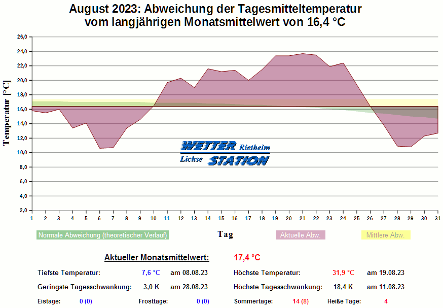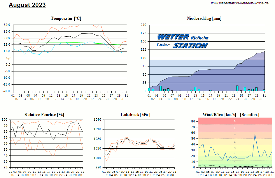 *************************************************** ************** T E M P E R A T U R ************** *************************************************** Mittlere Temperatur: 17,4 °C MIN Temperatur: 7,6 °C am 08.08.23 MAX Temperatur: 31,9 °C am 19.08.23 Mittlere MIN Temperatur: 12,5 °C Mittlere MAX Temperatur: 22,9 °C MIN Temp Delta : 3,0 K am 28.08.23 MAX Temp Delta : 18,4 K am 11.08.23 Mittl. Temp Delta: 10,4 K Starkfrosttage : 0 Eistage : 0 Frosttage : 0 Sommertage : 14 Heiße Tage : 4 *************************************************** ************ N I E D E R S C H L A G ************ *************************************************** Ges. Niederschlagsmenge: 119,8 mm MAX Niederschlag/Stunde: 13,8 mm am 24.08.23 MAX Niederschlag/Tag: 16,0 mm am 24.08.23 MAX Niederschlag in 24h: 17,8 mm am 05.08.23 MAX Niederschlag Rate: 95,2 mm/h am 13.08.23 Niederschlag an 19 Tagen Regentage (> 1mm) : 16 Regentage (> 3mm) : 14 Regentage (> 10mm) : 5 Regentage (> 20mm) : 0 *************************************************** ******************** W I N D ******************** *************************************************** Mittlere Windgeschwindigkeit: 0,6 m/s = 2,2 km/h Effektive Windrichtung: W Maximale Windgeschwindigkeit: 16,1 m/s = 57,9 km/h aus W am 24.08.23 Prozentuale Verteilung Windgeschwindigkeit: Bft_0 (bis 0,9 km/h) : 43.75 % Bft_1 (bis 5,6 km/h) : 45.26 % Bft_2 (bis 12 km/h) : 10.56 % Bft_3 (bis 20 km/h) : 0.38 % Bft_4 (bis 29 km/h) : 0.04 % Prozentuale Verteilung Windrichtung: N : 16.0 % NNO : 4.1 % NO : 4.2 % ONO : 0.5 % O : 0.3 % OSO : 5.5 % SO : 0.7 % SSO : 0.3 % S : 2.6 % SSW : 26.3 % SW : 5.8 % WSW : 5.8 % W : 6.0 % WNW : 8.7 % NW : 3.7 % NNW : 9.6 % *************************************************** *************** L U F T D R U C K *************** *************************************************** Mittlerer Luftdruck: 1013,8 hPa MIN Luftdruck: 997,1 hPa am 02.08.23 MAX Luftdruck: 1021,6 hPa am 11.08.23 *************************************************** ************ L U F T F E U C H T E ************** *************************************************** Mittlere rel. Luftfeuchte: 82,1 % MIN rel. Luftfeuchte: 37,0 % am 19.08.23 MAX rel. Luftfeuchte: 100,0 %