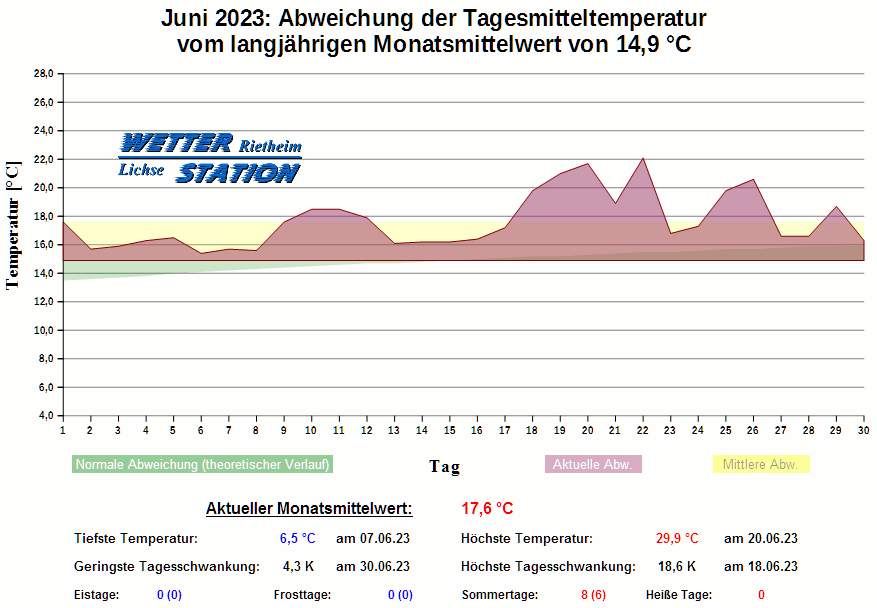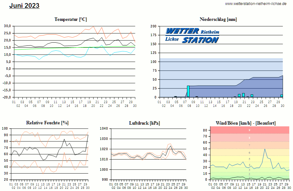*************************************************** ************** T E M P E R A T U R ************** *************************************************** Mittlere Temperatur: 17,6 °C MIN Temperatur: 6,5 °C am 07.06.23 MAX Temperatur: 29,9 °C am 20.06.23 Mittlere MIN Temperatur: 11,0 °C Mittlere MAX Temperatur: 24,0 °C MIN Temp Delta : 4,3 K am 30.06.23 MAX Temp Delta : 18,6 K am 18.06.23 Mittl. Temp Delta: 13,1 K Starkfrosttage : 0 Eistage : 0 Frosttage : 0 Sommertage : 8 Heiße Tage : 0 *************************************************** ************ N I E D E R S C H L A G ************ *************************************************** Ges. Niederschlagsmenge: 61,4 mm MAX Niederschlag/Stunde: 18,8 mm am 08.06.23 MAX Niederschlag/Tag: 31,0 mm am 08.06.23 MAX Niederschlag in 24h: 31,0 mm am 08.06.23 MAX Niederschlag Rate: 123,8 mm/h am 21.06.23 Niederschlag an 9 Tagen Regentage (> 1mm) : 5 Regentage (> 3mm) : 5 Regentage (> 10mm) : 1 Regentage (> 20mm) : 1 *************************************************** ******************** W I N D ******************** *************************************************** Mittlere Windgeschwindigkeit: 0,7 m/s = 2,6 km/h Effektive Windrichtung: NO Maximale Windgeschwindigkeit: 13,9 m/s = 49,9 km/h aus S am 21.06.23 Prozentuale Verteilung Windgeschwindigkeit: Bft_0 (bis 0,9 km/h) : 37.52 % Bft_1 (bis 5,6 km/h) : 47.45 % Bft_2 (bis 12 km/h) : 14.75 % Bft_3 (bis 20 km/h) : 0.28 % Prozentuale Verteilung Windrichtung: N : 25.2 % NNO : 3.7 % NO : 10.0 % ONO : 4.4 % O : 4.8 % OSO : 23.8 % SO : 0.7 % SSO : 0.4 % S : 0.8 % SSW : 8.3 % SW : 1.0 % WSW : 1.4 % W : 1.1 % WNW : 3.5 % NW : 2.7 % NNW : 8.0 % *************************************************** *************** L U F T D R U C K *************** *************************************************** Mittlerer Luftdruck: 1014,6 hPa MIN Luftdruck: 1009,1 hPa am 13.06.23 MAX Luftdruck: 1025,3 hPa am 24.06.23 *************************************************** ************ L U F T F E U C H T E ************** *************************************************** Mittlere rel. Luftfeuchte: 65,0 % MIN rel. Luftfeuchte: 29,0 % am 13.06.23 MAX rel. Luftfeuchte: 96,0 %