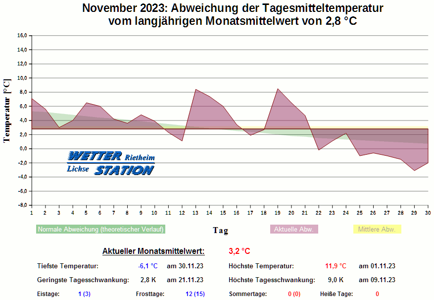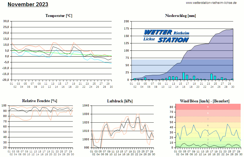 *************************************************** ************** T E M P E R A T U R ************** *************************************************** Mittlere Temperatur: 3,2 °C MIN Temperatur: -6,1 °C am 30.11.23 MAX Temperatur: 11,9 °C am 01.11.23 Mittlere MIN Temperatur: 0,3 °C Mittlere MAX Temperatur: 6,1 °C MIN Temp Delta : 2,8 K am 21.11.23 MAX Temp Delta : 9,0 K am 09.11.23 Mittl. Temp Delta: 5,7 K Starkfrosttage : 0 Eistage : 1 Frosttage : 12 Sommertage : 0 Heiße Tage : 0 *************************************************** ************ N I E D E R S C H L A G ************ *************************************************** Ges. Niederschlagsmenge: 174,2 mm MAX Niederschlag/Stunde: 5,2 mm am 16.11.23 MAX Niederschlag/Tag: 25,2 mm am 16.11.23 MAX Niederschlag in 24h: 40,6 mm am 17.11.23 MAX Niederschlag Rate: 26,8 mm/h am 14.11.23 Niederschlag an 27 Tagen Regentage (> 1mm) : 23 Regentage (> 3mm) : 14 Regentage (> 10mm) : 7 Regentage (> 20mm) : 2 *************************************************** ******************** W I N D ******************** *************************************************** Mittlere Windgeschwindigkeit: 1,2 m/s = 4,2 km/h Effektive Windrichtung: SW Maximale Windgeschwindigkeit: 13,0 m/s = 46,7 km/h aus NNO am 24.11.23 Prozentuale Verteilung Windgeschwindigkeit: Bft_0 (bis 0,9 km/h) : 21.69 % Bft_1 (bis 5,6 km/h) : 47.16 % Bft_2 (bis 12 km/h) : 27.41 % Bft_3 (bis 20 km/h) : 3.67 % Bft_4 (bis 29 km/h) : 0.07 % Prozentuale Verteilung Windrichtung: N : 4.1 % NNO : 0.6 % NO : 0.5 % ONO : 0.1 % O : 0.0 % OSO : 0.1 % SO : 0.3 % SSO : 0.6 % S : 1.8 % SSW : 58.3 % SW : 9.4 % WSW : 6.8 % W : 4.1 % WNW : 3.4 % NW : 4.5 % NNW : 5.5 % *************************************************** *************** L U F T D R U C K *************** *************************************************** Mittlerer Luftdruck: 1010,1 hPa MIN Luftdruck: 981,0 hPa am 05.11.23 MAX Luftdruck: 1030,2 hPa am 23.11.23 *************************************************** ************ L U F T F E U C H T E ************** *************************************************** Mittlere rel. Luftfeuchte: 92,9 % MIN rel. Luftfeuchte: 72,0 % am 01.11.23 MAX rel. Luftfeuchte: 100,0 %