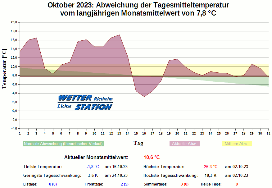 *************************************************** ************** T E M P E R A T U R ************** *************************************************** Mittlere Temperatur: 10,6 °C MIN Temperatur: -1,8 °C am 16.10.23 MAX Temperatur: 26,3 °C am 02.10.23 Mittlere MIN Temperatur: 5,5 °C Mittlere MAX Temperatur: 16,5 °C MIN Temp Delta : 3,6 K am 24.10.23 MAX Temp Delta : 18,3 K am 02.10.23 Mittl. Temp Delta: 11,0 K Starkfrosttage : 0 Eistage : 0 Frosttage : 2 Sommertage : 3 Heiße Tage : 0 *************************************************** ************ N I E D E R S C H L A G ************ *************************************************** Ges. Niederschlagsmenge: 65,6 mm MAX Niederschlag/Stunde: 4,6 mm am 14.10.23 MAX Niederschlag/Tag: 11,6 mm am 14.10.23 MAX Niederschlag in 24h: 12,8 mm am 15.10.23 MAX Niederschlag Rate: 39,6 mm/h am 14.10.23 Niederschlag an 15 Tagen Regentage (> 1mm) : 12 Regentage (> 3mm) : 8 Regentage (> 10mm) : 1 Regentage (> 20mm) : 0 *************************************************** ******************** W I N D ******************** *************************************************** Mittlere Windgeschwindigkeit: 0,6 m/s = 2,3 km/h Effektive Windrichtung: SSW Maximale Windgeschwindigkeit: 10,7 m/s = 38,6 km/h aus W am 03.10.23 Prozentuale Verteilung Windgeschwindigkeit: Bft_0 (bis 0,9 km/h) : 41.58 % Bft_1 (bis 5,6 km/h) : 45.30 % Bft_2 (bis 12 km/h) : 12.75 % Bft_3 (bis 20 km/h) : 0.38 % Prozentuale Verteilung Windrichtung: N : 8.6 % NNO : 1.0 % NO : 0.4 % ONO : 0.2 % O : 0.7 % OSO : 9.3 % SO : 2.0 % SSO : 1.3 % S : 4.5 % SSW : 50.0 % SW : 5.6 % WSW : 3.6 % W : 2.0 % WNW : 3.7 % NW : 3.2 % NNW : 3.8 % *************************************************** *************** L U F T D R U C K *************** *************************************************** Mittlerer Luftdruck: 1012,9 hPa MIN Luftdruck: 977,7 hPa am 20.10.23 MAX Luftdruck: 1028,8 hPa am 04.10.23 *************************************************** ************ L U F T F E U C H T E ************** *************************************************** Mittlere rel. Luftfeuchte: 81,5 % MIN rel. Luftfeuchte: 33,0 % am 07.10.23 MAX rel. Luftfeuchte: 99,0 %
