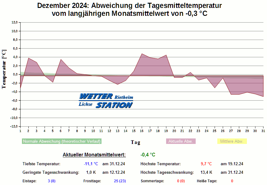 *************************************************** ************** T E M P E R A T U R ************** *************************************************** Mittlere Temperatur: -0,4 °C MIN Temperatur: -11,1 °C am 31.12.24 MAX Temperatur: 9,7 °C am 19.12.24 Mittlere MIN Temperatur: -3,4 °C Mittlere MAX Temperatur: 2,9 °C MIN Temp Delta : 1,0 K am 12.12.24 MAX Temp Delta : 13,4 K am 31.12.24 Mittl. Temp Delta: 6,3 K Starkfrosttage : 1 Eistage : 3 Frosttage : 25 Sommertage : 0 Heiße Tage : 0 *************************************************** ************ N I E D E R S C H L A G ************ *************************************************** Ges. Niederschlagsmenge: 59,2 mm MAX Niederschlag/Stunde: 4,2 mm am 19.12.24 MAX Niederschlag/Tag: 14,6 mm am 22.12.24 MAX Niederschlag in 24h: 18,8 mm am 22.12.24 MAX Niederschlag Rate: 42,2 mm/h am 19.12.24 Niederschlag an 16 Tagen Regentage (> 1mm) : 12 Regentage (> 3mm) : 5 Regentage (> 10mm) : 1 Regentage (> 20mm) : 0 *************************************************** ******************** W I N D ******************** *************************************************** Mittlere Windgeschwindigkeit: 1,2 m/s = 4,5 km/h Effektive Windrichtung: SSW Maximale Windgeschwindigkeit: 14,8 m/s = 53,1 km/h aus N am 06.12.24 Prozentuale Verteilung Windgeschwindigkeit: Bft_0 (bis 0,9 km/h) : 20.69 % Bft_1 (bis 5,6 km/h) : 44.47 % Bft_2 (bis 12 km/h) : 31.03 % Bft_3 (bis 20 km/h) : 3.67 % Bft_4 (bis 29 km/h) : 0.15 % Prozentuale Verteilung Windrichtung: N : 3.2 % NNO : 0.9 % NO : 3.0 % ONO : 2.3 % O : 1.3 % OSO : 5.9 % SO : 4.1 % SSO : 2.1 % S : 4.2 % SSW : 47.5 % SW : 5.9 % WSW : 4.7 % W : 4.2 % WNW : 3.3 % NW : 3.7 % NNW : 3.8 % *************************************************** *************** L U F T D R U C K *************** *************************************************** Mittlerer Luftdruck: 1024,3 hPa MIN Luftdruck: 1000,1 hPa am 19.12.24 MAX Luftdruck: 1038,5 hPa am 25.12.24 *************************************************** ************ L U F T F E U C H T E ************** *************************************************** Mittlere rel. Luftfeuchte: 92,2 % MIN rel. Luftfeuchte: 46,0 % am 26.12.24 MAX rel. Luftfeuchte: 98,0 %