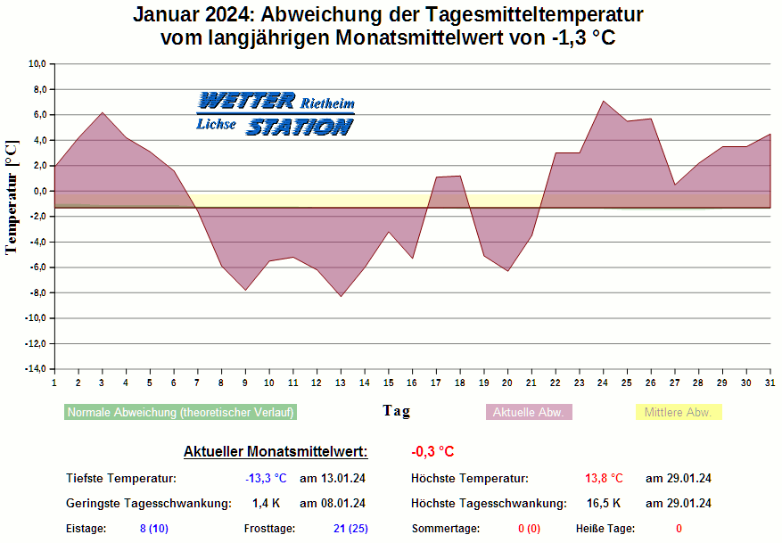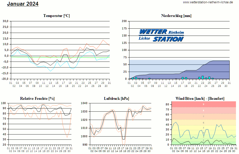 *************************************************** ************** T E M P E R A T U R ************** *************************************************** Mittlere Temperatur: -0,3 °C MIN Temperatur: -13,3 °C am 13.01.24 MAX Temperatur: 13,8 °C am 29.01.24 Mittlere MIN Temperatur: -4,0 °C Mittlere MAX Temperatur: 3,9 °C MIN Temp Delta : 1,4 K am 08.01.24 MAX Temp Delta : 16,5 K am 29.01.24 Mittl. Temp Delta: 7,8 K Starkfrosttage : 5 Eistage : 8 Frosttage : 21 Sommertage : 0 Heiße Tage : 0 *************************************************** ************ N I E D E R S C H L A G ************ *************************************************** Ges. Niederschlagsmenge: 63,0 mm MAX Niederschlag/Stunde: 3,2 mm am 23.01.24 MAX Niederschlag/Tag: 10,8 mm am 23.01.24 MAX Niederschlag in 24h: 15,6 mm am 23.01.24 MAX Niederschlag Rate: 14,8 mm/h am 03.01.24 Niederschlag an 14 Tagen Regentage (> 1mm) : 11 Regentage (> 3mm) : 8 Regentage (> 10mm) : 1 Regentage (> 20mm) : 0 *************************************************** ******************** W I N D ******************** *************************************************** Mittlere Windgeschwindigkeit: 1,2 m/s = 4,5 km/h Effektive Windrichtung: SW Maximale Windgeschwindigkeit: 12,5 m/s = 45,1 km/h aus S am 03.01.24 Prozentuale Verteilung Windgeschwindigkeit: Bft_0 (bis 0,9 km/h) : 28.21 % Bft_1 (bis 5,6 km/h) : 36.66 % Bft_2 (bis 12 km/h) : 28.66 % Bft_3 (bis 20 km/h) : 6.33 % Bft_4 (bis 29 km/h) : 0.13 % Prozentuale Verteilung Windrichtung: N : 6.3 % NNO : 3.3 % NO : 3.3 % ONO : 1.4 % O : 1.4 % OSO : 4.8 % SO : 0.5 % SSO : 0.5 % S : 1.8 % SSW : 45.5 % SW : 12.9 % WSW : 6.9 % W : 3.3 % WNW : 2.1 % NW : 2.0 % NNW : 4.0 % *************************************************** *************** L U F T D R U C K *************** *************************************************** Mittlerer Luftdruck: 1020,7 hPa MIN Luftdruck: 989,7 hPa am 18.01.24 MAX Luftdruck: 1037,7 hPa am 27.01.24 *************************************************** ************ L U F T F E U C H T E ************** *************************************************** Mittlere rel. Luftfeuchte: 88,2 % MIN rel. Luftfeuchte: 34,0 % am 29.01.24 MAX rel. Luftfeuchte: 98,0 %