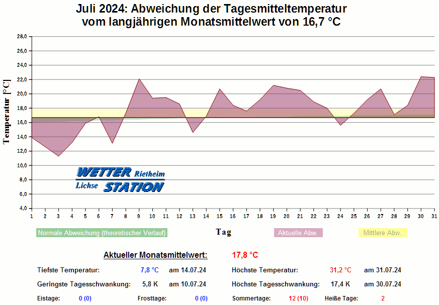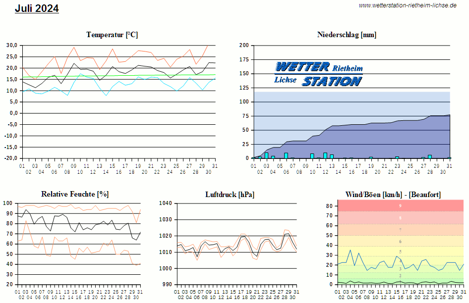 *************************************************** ************** T E M P E R A T U R ************** *************************************************** Mittlere Temperatur: 17,8 °C MIN Temperatur: 7,8 °C am 14.07.24 MAX Temperatur: 31,2 °C am 31.07.24 Mittlere MIN Temperatur: 12,5 °C Mittlere MAX Temperatur: 23,9 °C MIN Temp Delta : 5,8 K am 10.07.24 MAX Temp Delta : 17,4 K am 30.07.24 Mittl. Temp Delta: 11,3 K Starkfrosttage : 0 Eistage : 0 Frosttage : 0 Sommertage : 12 Heiße Tage : 2 *************************************************** ************ N I E D E R S C H L A G ************ *************************************************** Ges. Niederschlagsmenge: 77,4 mm MAX Niederschlag/Stunde: 6,6 mm am 10.07.24 MAX Niederschlag/Tag: 10,4 mm am 03.07.24 MAX Niederschlag in 24h: 16,8 mm am 13.07.24 MAX Niederschlag Rate: 153,6 mm/h am 06.07.24 Niederschlag an 19 Tagen Regentage (> 1mm) : 16 Regentage (> 3mm) : 8 Regentage (> 10mm) : 2 Regentage (> 20mm) : 0 *************************************************** ******************** W I N D ******************** *************************************************** Mittlere Windgeschwindigkeit: 0,6 m/s = 2,1 km/h Effektive Windrichtung: NW Maximale Windgeschwindigkeit: 9,8 m/s = 35,4 km/h aus NW am 04.07.24 Prozentuale Verteilung Windgeschwindigkeit: Bft_0 (bis 0,9 km/h) : 41.50 % Bft_1 (bis 5,6 km/h) : 49.70 % Bft_2 (bis 12 km/h) : 8.69 % Bft_3 (bis 20 km/h) : 0.11 % Prozentuale Verteilung Windrichtung: N : 19.7 % NNO : 3.6 % NO : 3.8 % ONO : 1.6 % O : 1.9 % OSO : 9.5 % SO : 1.2 % SSO : 1.5 % S : 5.2 % SSW : 20.3 % SW : 3.0 % WSW : 2.9 % W : 2.1 % WNW : 5.4 % NW : 6.4 % NNW : 11.9 % *************************************************** *************** L U F T D R U C K *************** *************************************************** Mittlerer Luftdruck: 1014,1 hPa MIN Luftdruck: 1005,0 hPa am 06.07.24 MAX Luftdruck: 1023,8 hPa am 28.07.24 *************************************************** ************ L U F T F E U C H T E ************** *************************************************** Mittlere rel. Luftfeuchte: 79,8 % MIN rel. Luftfeuchte: 39,0 % am 30.07.24 MAX rel. Luftfeuchte: 99,0 %
