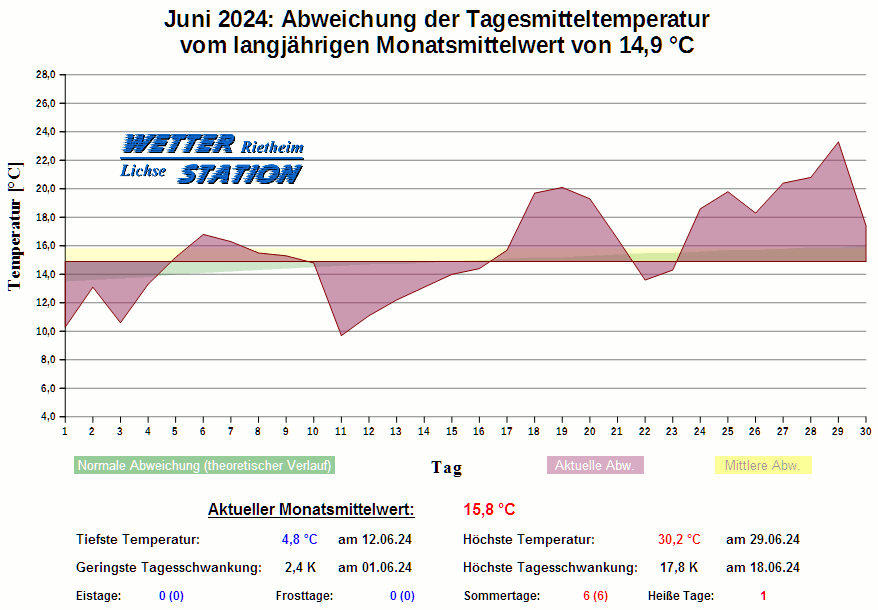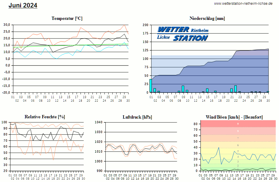 *************************************************** ************** T E M P E R A T U R ************** *************************************************** Mittlere Temperatur: 15,8 °C MIN Temperatur: 4,8 °C am 12.06.24 MAX Temperatur: 30,2 °C am 29.06.24 Mittlere MIN Temperatur: 10,8 °C Mittlere MAX Temperatur: 21,2 °C MIN Temp Delta : 2,4 K am 01.06.24 MAX Temp Delta : 17,8 K am 18.06.24 Mittl. Temp Delta: 10,4 K Starkfrosttage : 0 Eistage : 0 Frosttage : 0 Sommertage : 6 Heiße Tage : 1 *************************************************** ************ N I E D E R S C H L A G ************ *************************************************** Ges. Niederschlagsmenge: 129,6 mm MAX Niederschlag/Stunde: 15,4 mm am 09.06.24 MAX Niederschlag/Tag: 38,0 mm am 01.06.24 MAX Niederschlag in 24h: 38,0 mm am 01.06.24 MAX Niederschlag Rate: 134,0 mm/h am 22.06.24 Niederschlag an 16 Tagen Regentage (> 1mm) : 13 Regentage (> 3mm) : 9 Regentage (> 10mm) : 5 Regentage (> 20mm) : 1 *************************************************** ******************** W I N D ******************** *************************************************** Mittlere Windgeschwindigkeit: 0,7 m/s = 2,4 km/h Effektive Windrichtung: WNW Maximale Windgeschwindigkeit: 11,2 m/s = 40,2 km/h aus S am 08.06.24 Prozentuale Verteilung Windgeschwindigkeit: Bft_0 (bis 0,9 km/h) : 40.52 % Bft_1 (bis 5,6 km/h) : 45.54 % Bft_2 (bis 12 km/h) : 13.58 % Bft_3 (bis 20 km/h) : 0.36 % Prozentuale Verteilung Windrichtung: N : 21.2 % NNO : 2.6 % NO : 3.7 % ONO : 2.0 % O : 2.2 % OSO : 9.3 % SO : 1.2 % SSO : 1.3 % S : 5.4 % SSW : 24.6 % SW : 2.8 % WSW : 2.8 % W : 1.5 % WNW : 5.2 % NW : 4.8 % NNW : 9.3 % *************************************************** *************** L U F T D R U C K *************** *************************************************** Mittlerer Luftdruck: 1012,9 hPa MIN Luftdruck: 1002,6 hPa am 29.06.24 MAX Luftdruck: 1018,7 hPa am 23.06.24 *************************************************** ************ L U F T F E U C H T E ************** *************************************************** Mittlere rel. Luftfeuchte: 81,8 % MIN rel. Luftfeuchte: 38,0 % am 18.06.24 MAX rel. Luftfeuchte: 100,0 %