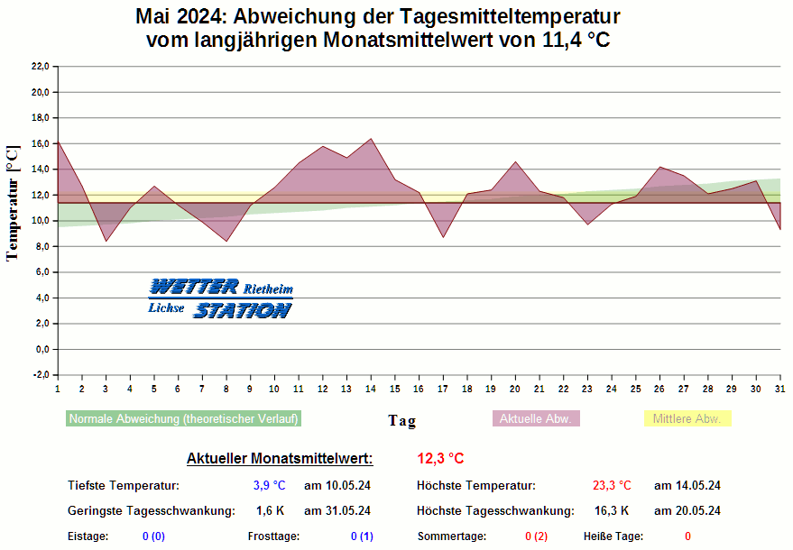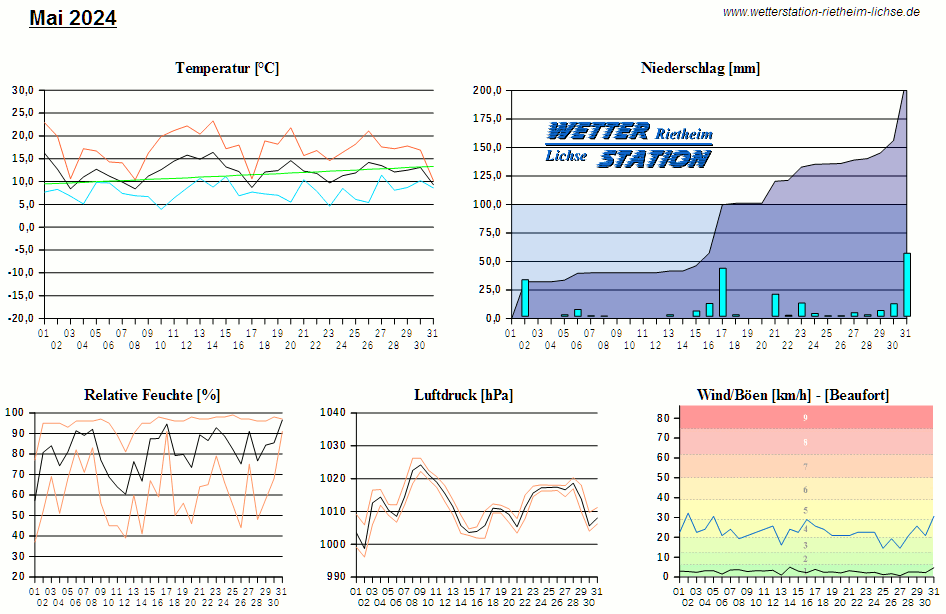 *************************************************** ************** T E M P E R A T U R ************** *************************************************** Mittlere Temperatur: 12,3 °C MIN Temperatur: 3,9 °C am 10.05.24 MAX Temperatur: 23,3 °C am 14.05.24 Mittlere MIN Temperatur: 7,8 °C Mittlere MAX Temperatur: 17,3 °C MIN Temp Delta : 1,6 K am 31.05.24 MAX Temp Delta : 16,3 K am 20.05.24 Mittl. Temp Delta: 9,5 K Starkfrosttage : 0 Eistage : 0 Frosttage : 0 Sommertage : 0 Heiße Tage : 0 *************************************************** ************ N I E D E R S C H L A G ************ *************************************************** Ges. Niederschlagsmenge: 211,8 mm MAX Niederschlag/Stunde: 19,8 mm am 02.05.24 MAX Niederschlag/Tag: 55,6 mm am 31.05.24 MAX Niederschlag in 24h: 55,6 mm am 31.05.24 MAX Niederschlag Rate: 102,8 mm/h am 02.05.24 Niederschlag an 21 Tagen Regentage (> 1mm) : 16 Regentage (> 3mm) : 10 Regentage (> 10mm) : 7 Regentage (> 20mm) : 3 *************************************************** ******************** W I N D ******************** *************************************************** Mittlere Windgeschwindigkeit: 0,8 m/s = 2,7 km/h Effektive Windrichtung: NNO Maximale Windgeschwindigkeit: 8,9 m/s = 32,2 km/h aus W am 02.05.24 Prozentuale Verteilung Windgeschwindigkeit: Bft_0 (bis 0,9 km/h) : 34.39 % Bft_1 (bis 5,6 km/h) : 49.32 % Bft_2 (bis 12 km/h) : 15.92 % Bft_3 (bis 20 km/h) : 0.38 % Prozentuale Verteilung Windrichtung: N : 23.8 % NNO : 4.1 % NO : 3.5 % ONO : 2.1 % O : 3.1 % OSO : 16.0 % SO : 4.6 % SSO : 0.5 % S : 2.1 % SSW : 12.6 % SW : 3.7 % WSW : 3.7 % W : 2.1 % WNW : 4.4 % NW : 4.0 % NNW : 9.7 % *************************************************** *************** L U F T D R U C K *************** *************************************************** Mittlerer Luftdruck: 1012,0 hPa MIN Luftdruck: 996,1 hPa am 02.05.24 MAX Luftdruck: 1026,2 hPa am 08.05.24 *************************************************** ************ L U F T F E U C H T E ************** *************************************************** Mittlere rel. Luftfeuchte: 81,1 % MIN rel. Luftfeuchte: 37,0 % am 01.05.24 MAX rel. Luftfeuchte: 99,0 %