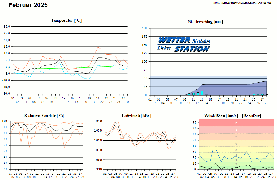 *************************************************** ************** T E M P E R A T U R ************** *************************************************** Mittlere Temperatur: 0,3 °C MIN Temperatur: -8,9 °C am 19.02.25 MAX Temperatur: 14,7 °C am 21.02.25 Mittlere MIN Temperatur: -3,1 °C Mittlere MAX Temperatur: 4,2 °C MIN Temp Delta : 2,5 K am 06.02.25 MAX Temp Delta : 14,5 K am 05.02.25 Mittl. Temp Delta: 7,2 K Starkfrosttage : 0 Eistage : 6 Frosttage : 22 Sommertage : 0 Heiße Tage : 0 *************************************************** ************ N I E D E R S C H L A G ************ *************************************************** Ges. Niederschlagsmenge: 41,6 mm MAX Niederschlag/Stunde: 3,4 mm am 13.02.25 MAX Niederschlag/Tag: 12,4 mm am 13.02.25 MAX Niederschlag in 24h: 15,4 mm am 13.02.25 MAX Niederschlag Rate: 7,8 mm/h am 10.02.25 Niederschlag an 11 Tagen Regentage (> 1mm) : 8 Regentage (> 3mm) : 5 Regentage (> 10mm) : 1 Regentage (> 20mm) : 0 *************************************************** ******************** W I N D ******************** *************************************************** Mittlere Windgeschwindigkeit: 1,0 m/s = 3,6 km/h Effektive Windrichtung: SO Maximale Windgeschwindigkeit: 9,8 m/s = 35,4 km/h aus O am 06.02.25 Prozentuale Verteilung Windgeschwindigkeit: Bft_0 (bis 0,9 km/h) : 30.00 % Bft_1 (bis 5,6 km/h) : 43.58 % Bft_2 (bis 12 km/h) : 24.14 % Bft_3 (bis 20 km/h) : 2.26 % Bft_4 (bis 29 km/h) : 0.02 % Prozentuale Verteilung Windrichtung: N : 5.4 % NNO : 1.0 % NO : 1.5 % ONO : 1.0 % O : 3.5 % OSO : 34.2 % SO : 15.8 % SSO : 4.7 % S : 4.4 % SSW : 22.0 % SW : 2.0 % WSW : 1.4 % W : 0.8 % WNW : 0.8 % NW : 0.5 % NNW : 1.0 % *************************************************** *************** L U F T D R U C K *************** *************************************************** Mittlerer Luftdruck: 1024,2 hPa MIN Luftdruck: 1011,7 hPa am 25.02.25 MAX Luftdruck: 1040,8 hPa am 05.02.25 *************************************************** ************ L U F T F E U C H T E ************** *************************************************** Mittlere rel. Luftfeuchte: 90,4 % MIN rel. Luftfeuchte: 55,0 % am 08.02.25 MAX rel. Luftfeuchte: 99,0 %